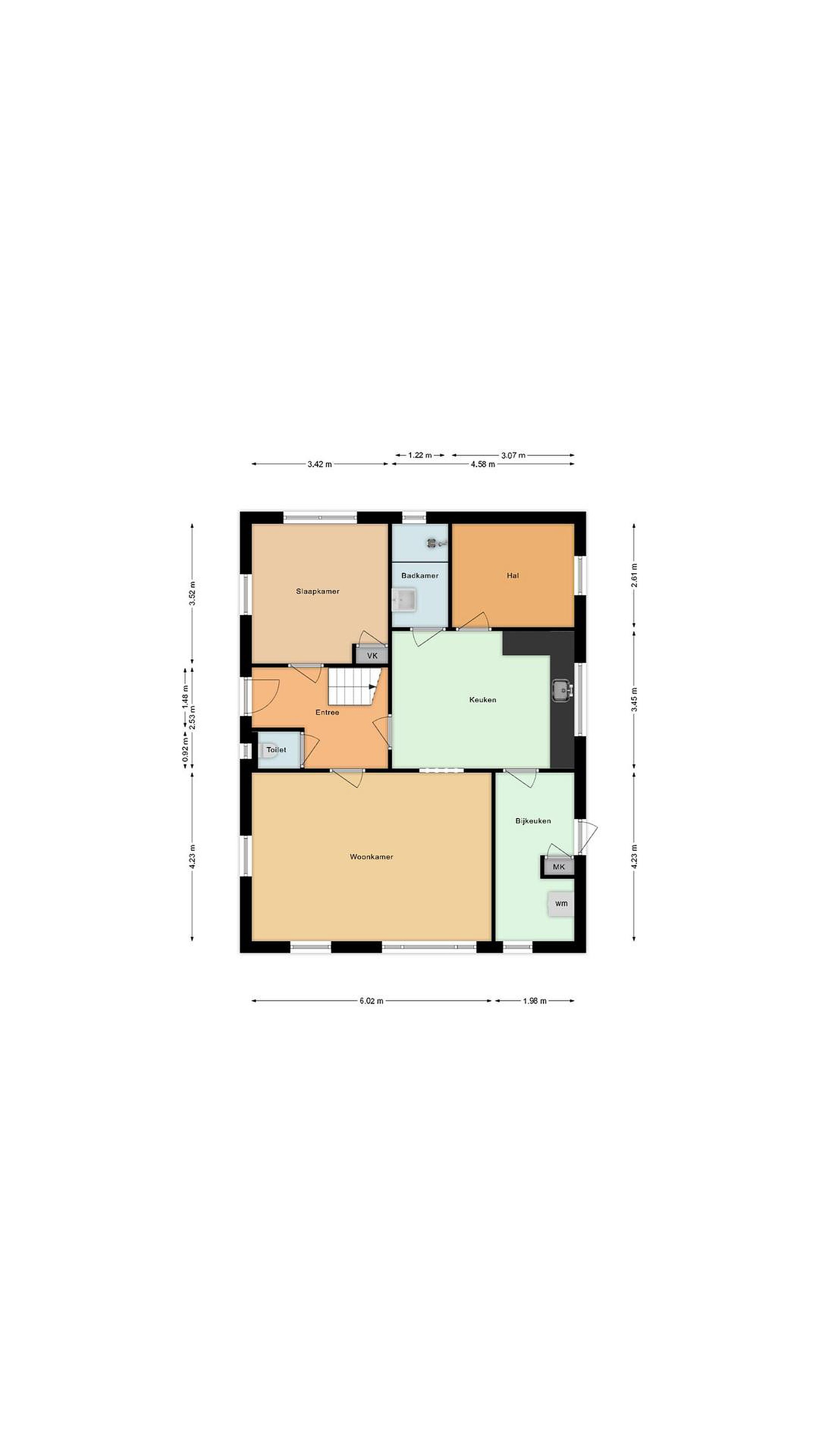 Begane grond Entree/hal met toilet; Woonkamer; Keuken; Bijkeuken; Hal; Badkamer en slaapkamer.