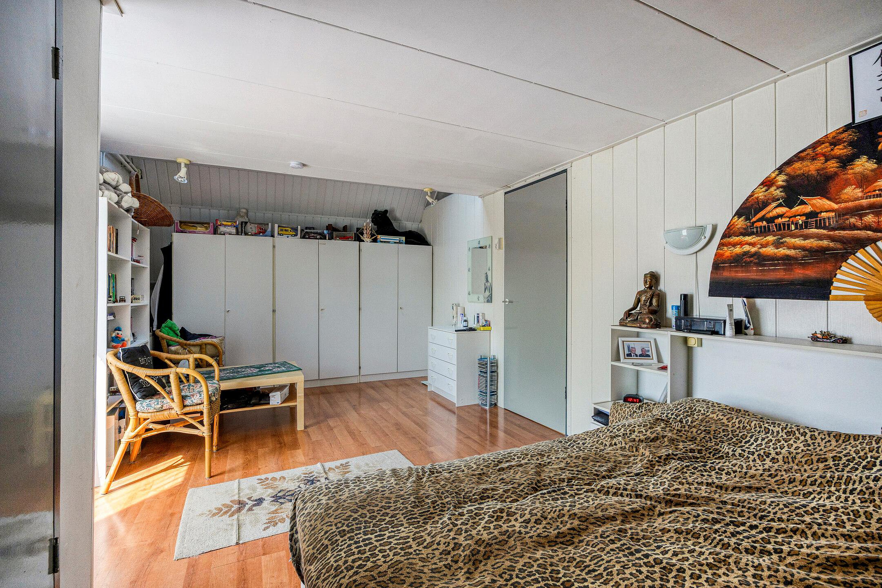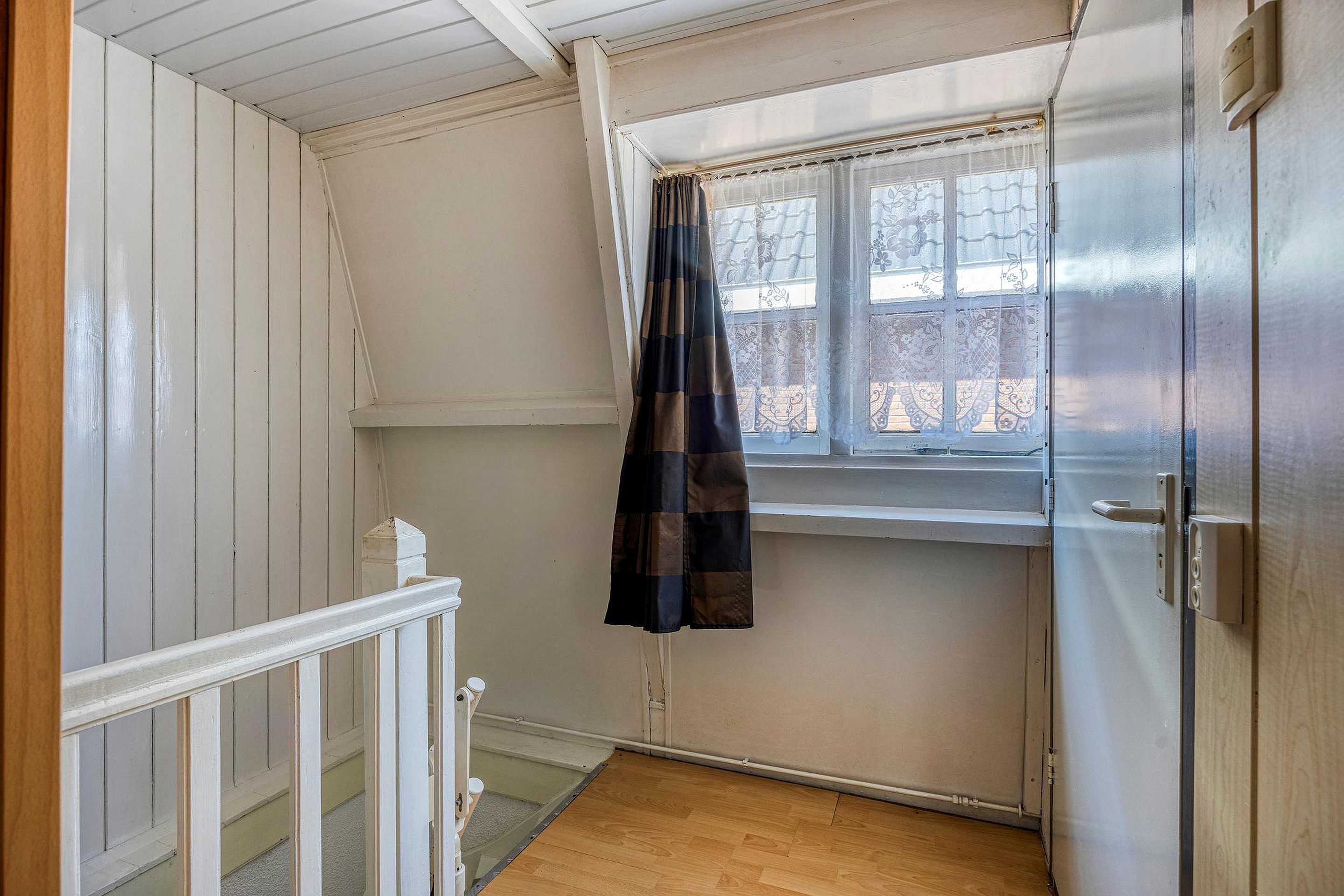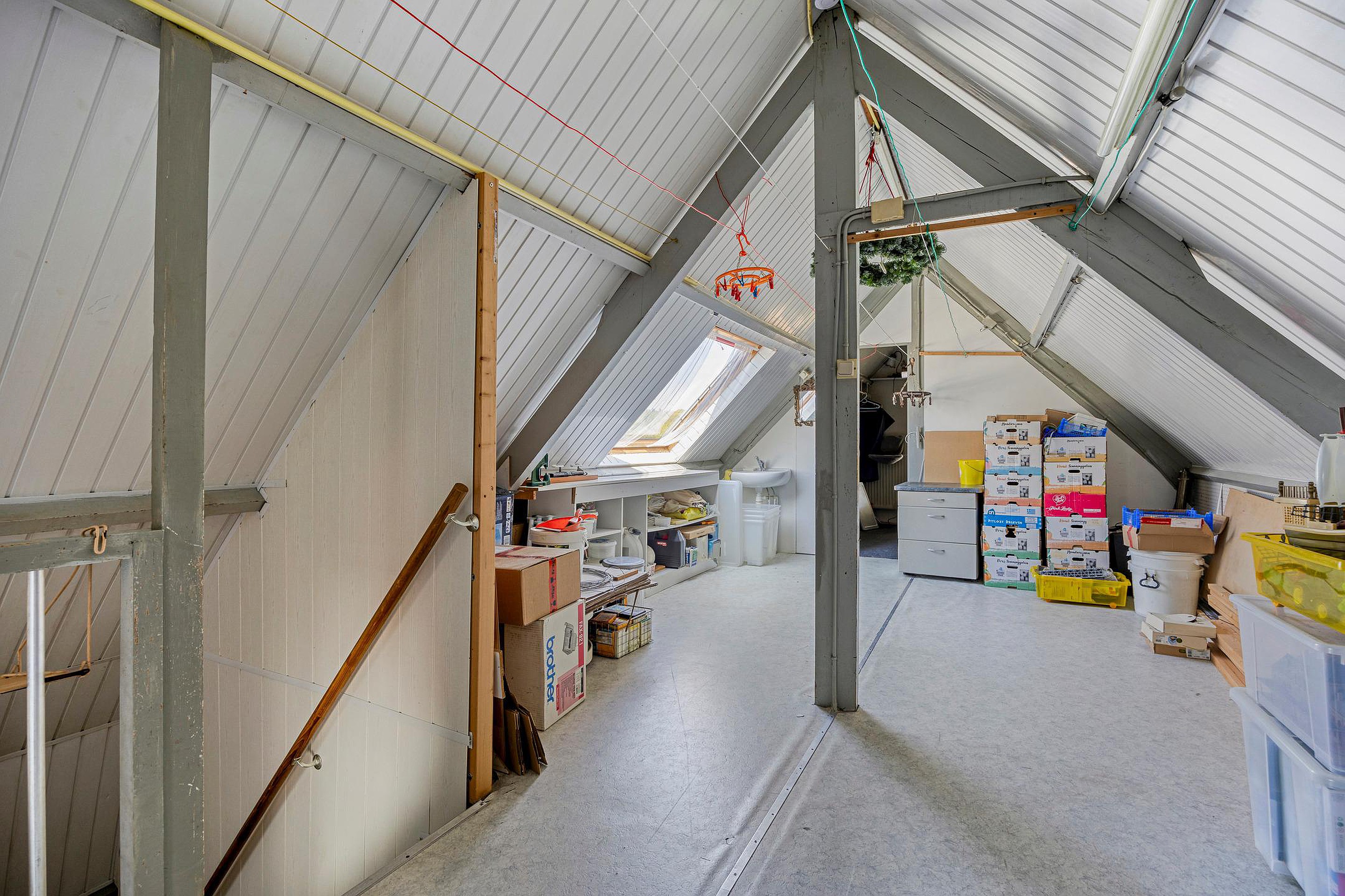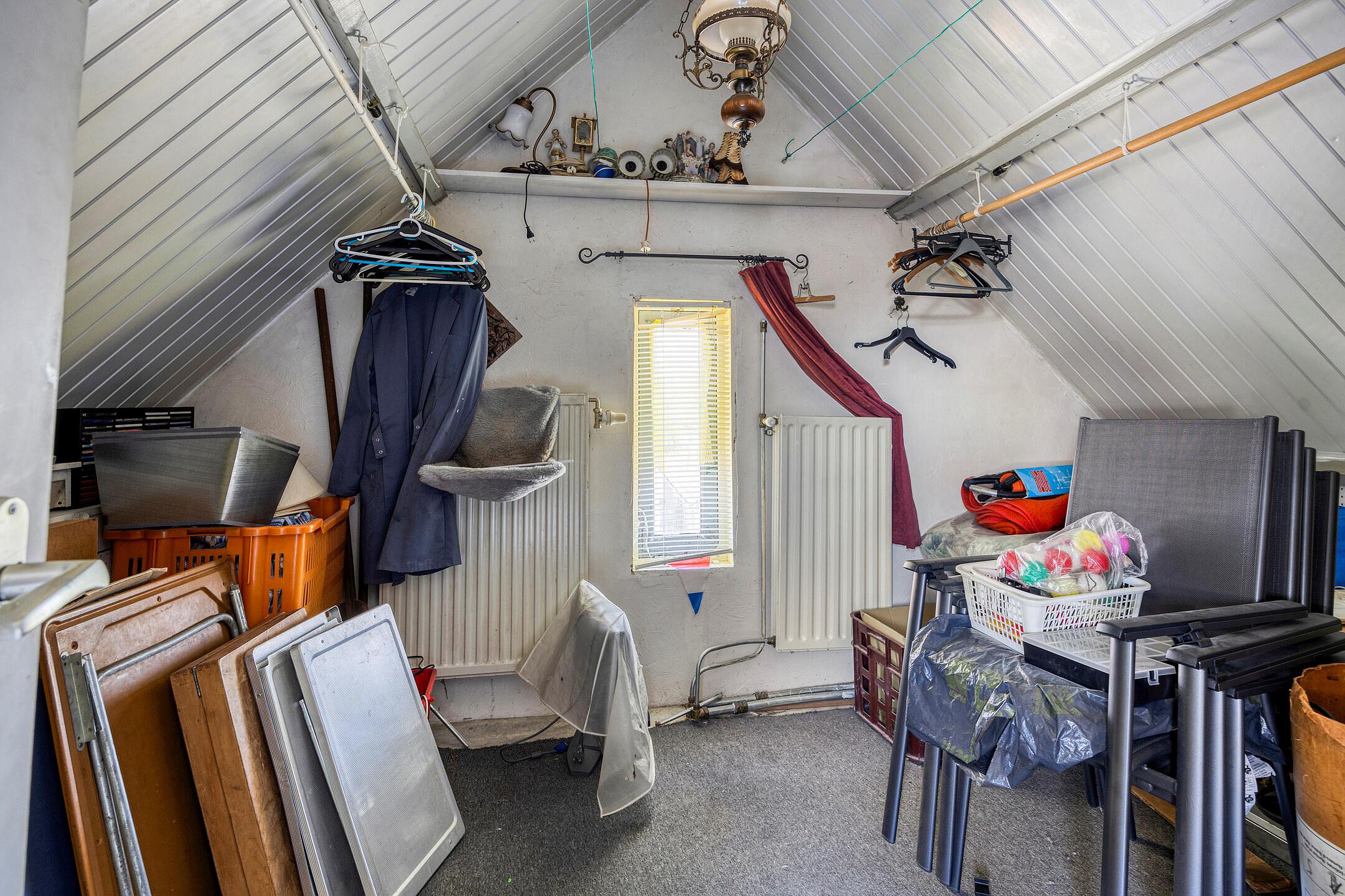 De tweede verdieping is een volwaardige zolderverdieping met een royale ruimte onder de kapconstructie. Er zijn meerdere dakramen aanwezig en de vloeroppervlakte strekt zich uit over de volle breedte van het huis. Deze verdieping leent zich uitstekend voor het creëren van een grote slaapkamer, een werkruimte, speelzolder of zelfs een zelfstandige studio. Ook is er onder de schuine kanten veel bergruimte aanwezig achter knieschotten. Op dit moment zijn er 2 slaap/zolderkamers aanwezig.