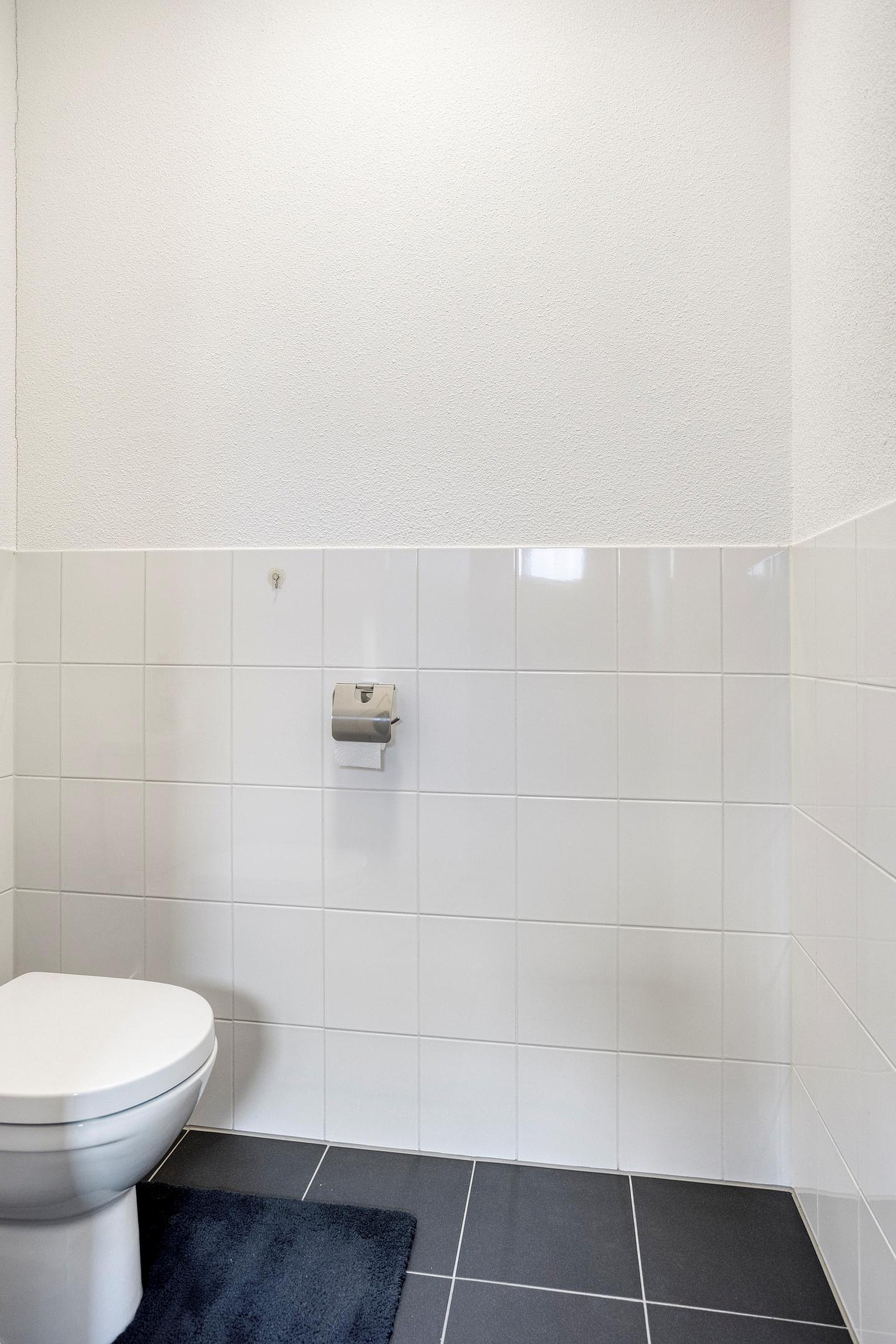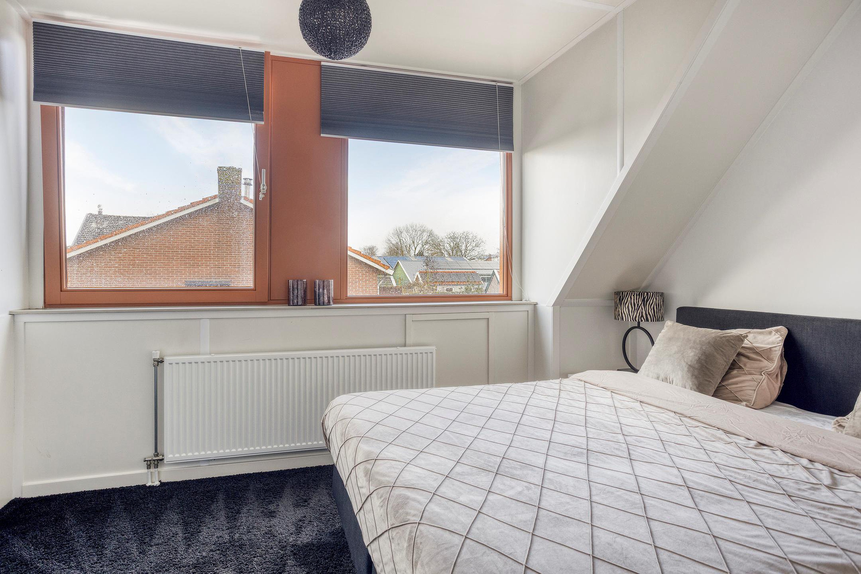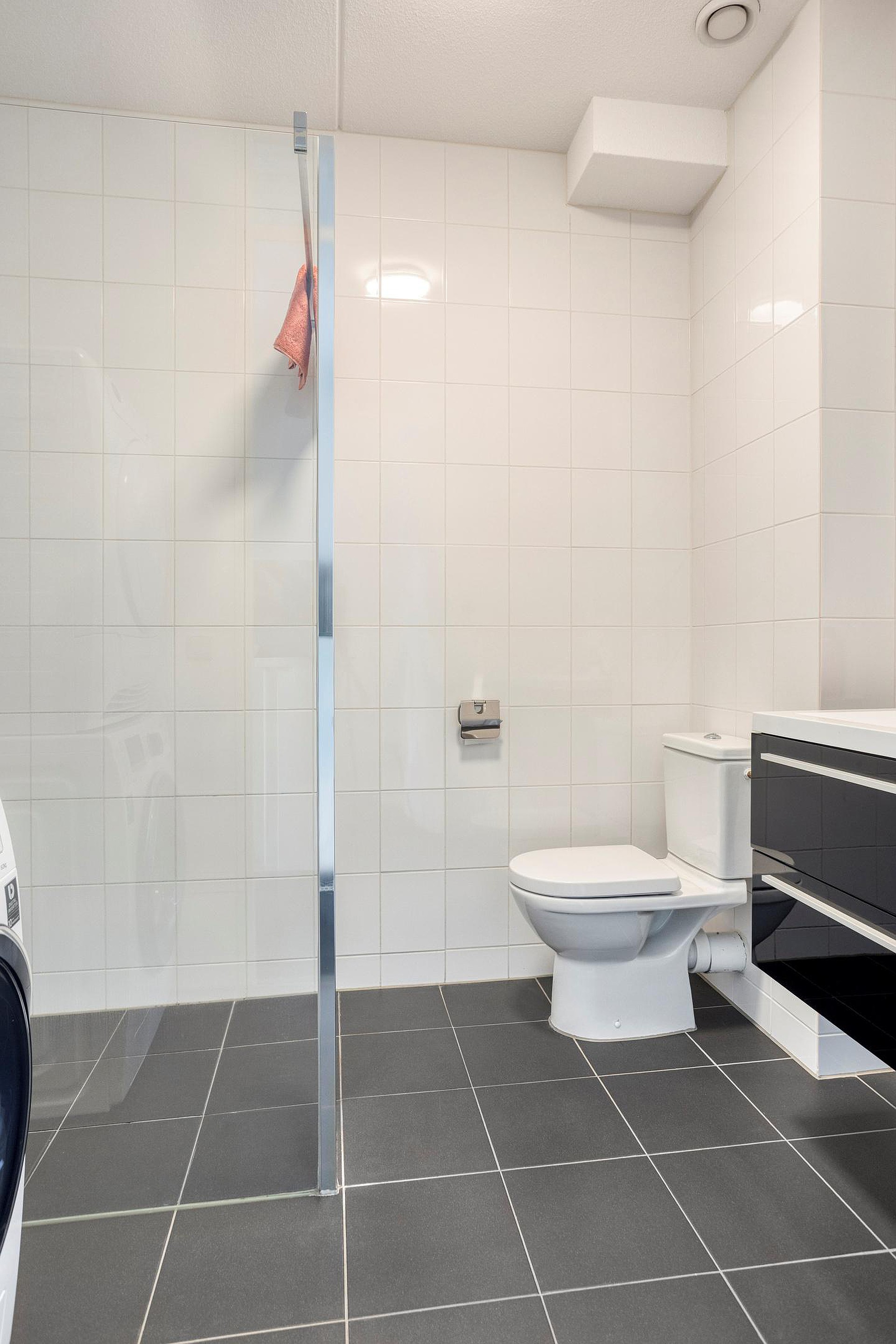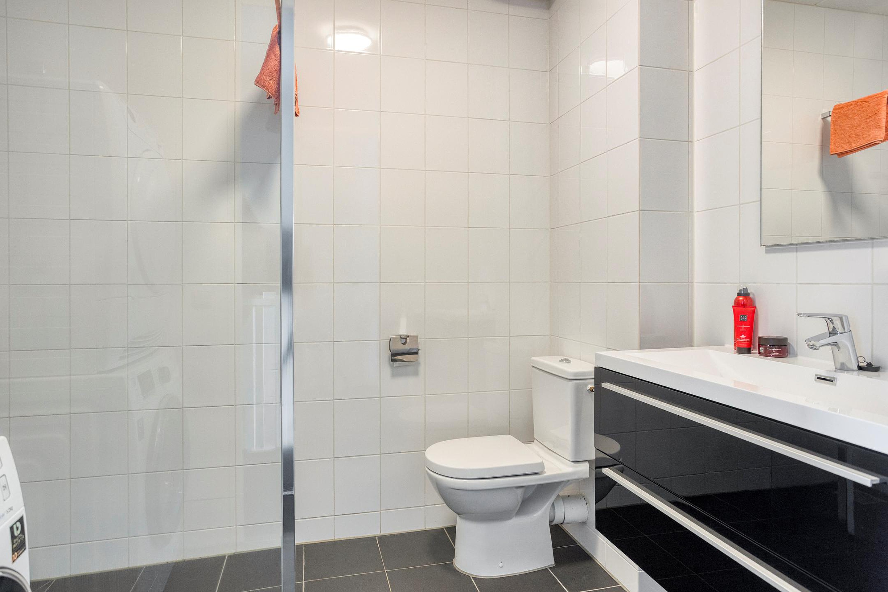 Via de trap in de woonkamer bereikt u de overloop van de eerste verdieping, waar twee volwaardige slaapkamers en de badkamer zich bevinden. Aan de achterzijde bevindt zich de hoofdslaapkamer, de tweede kamer is aan de voorzijde gesitueerd. Dankzij de brede dakkapellen profiteren beide kamers van prettig daglicht en een comfortabele maatvoering. Centraal op de verdieping ligt de modern afgewerkte badkamer, uitgerust met een inloopdouche, wastafelmeubel en tweede toilet. De combinatie van lichte wandtegels en een donkere vloer zorgt voor een rustige, tijdloze uitstraling. Ook de witgoedaansluitingen zijn hier praktisch geïntegreerd, waardoor de indeling efficiënt en doordacht blijft.