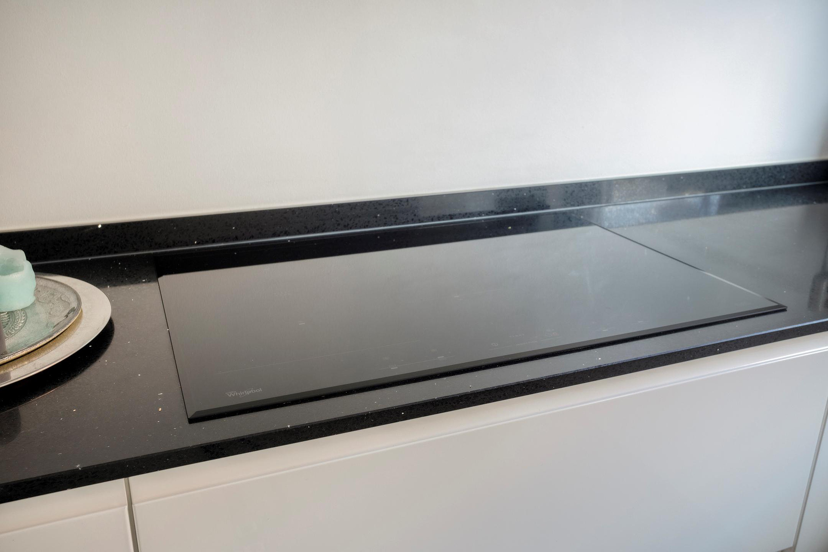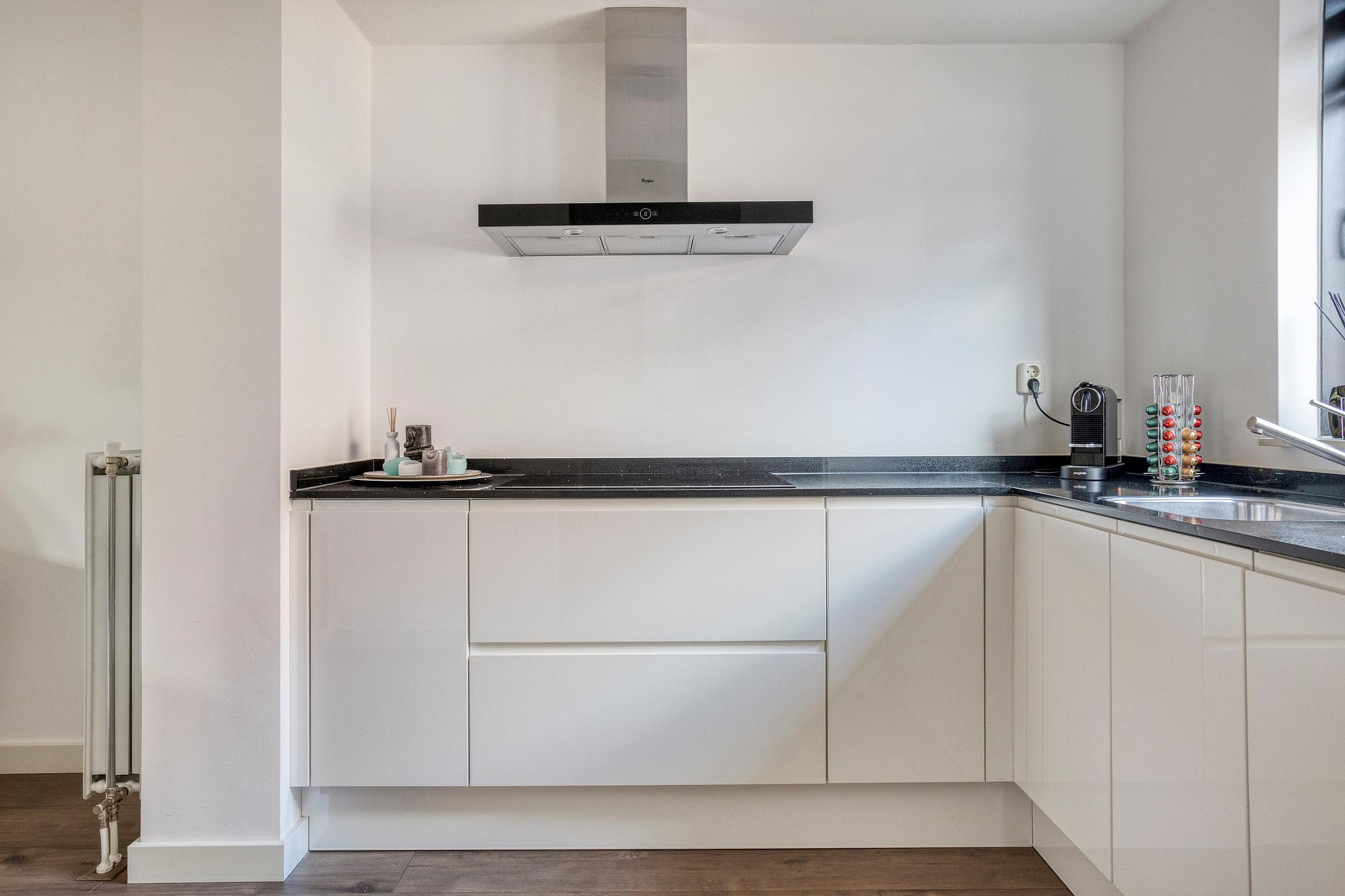 Aan de voorzijde bevindt zich de moderne hoekkeuken, uitgevoerd in hoogglans wit met een donker contrasterend werkblad. De keuken is voorzien van een inductiekookplaat met afzuigkap, combi-oven, vaatwasser en koelkast. Dankzij de slimme indeling beschikt u hier over comfortabele werkruimte en voldoende kastruimte.