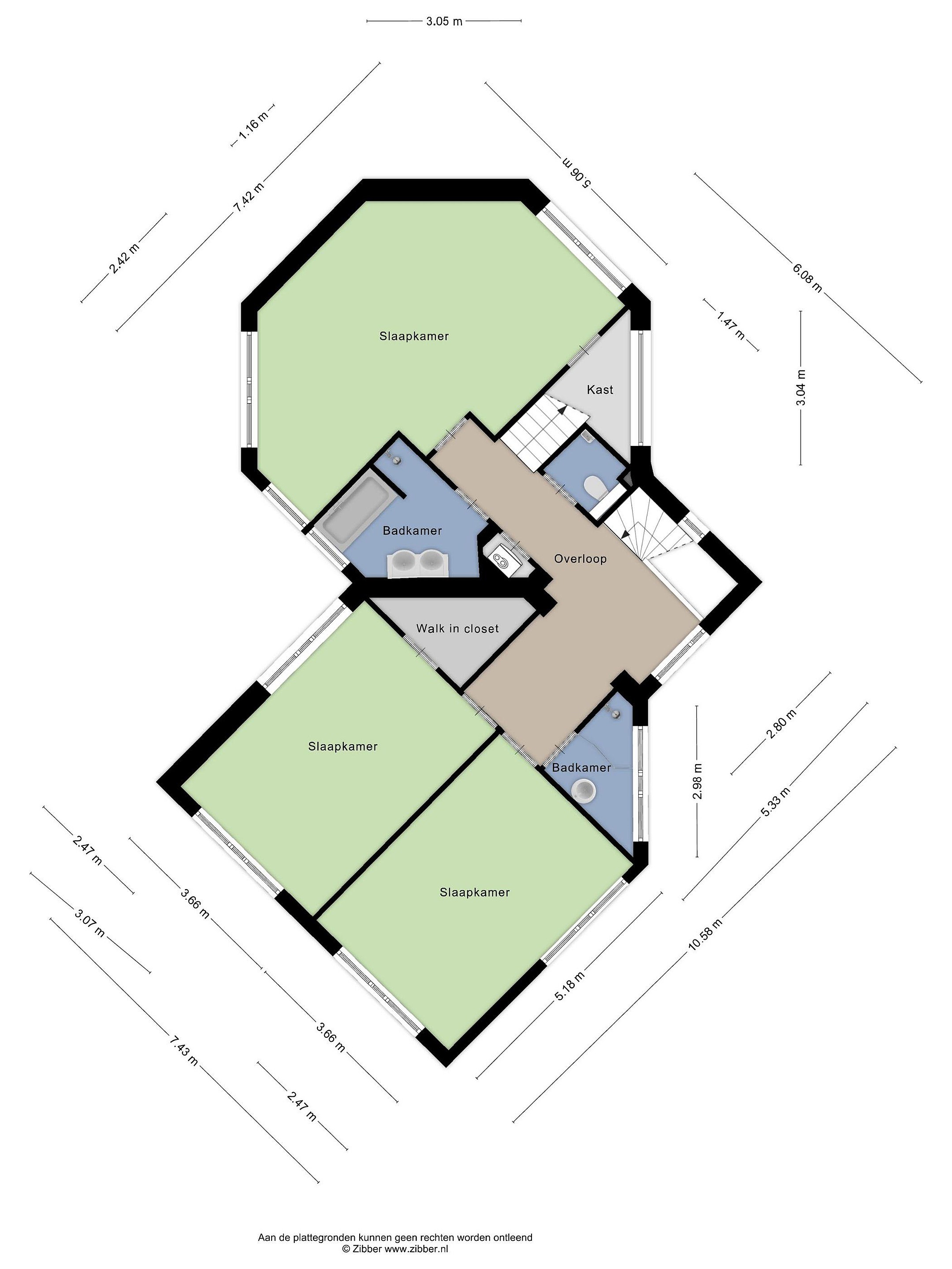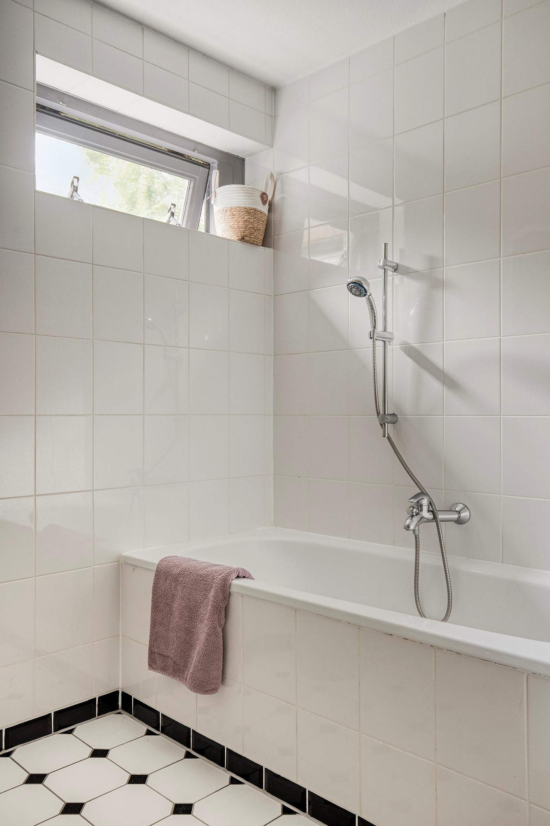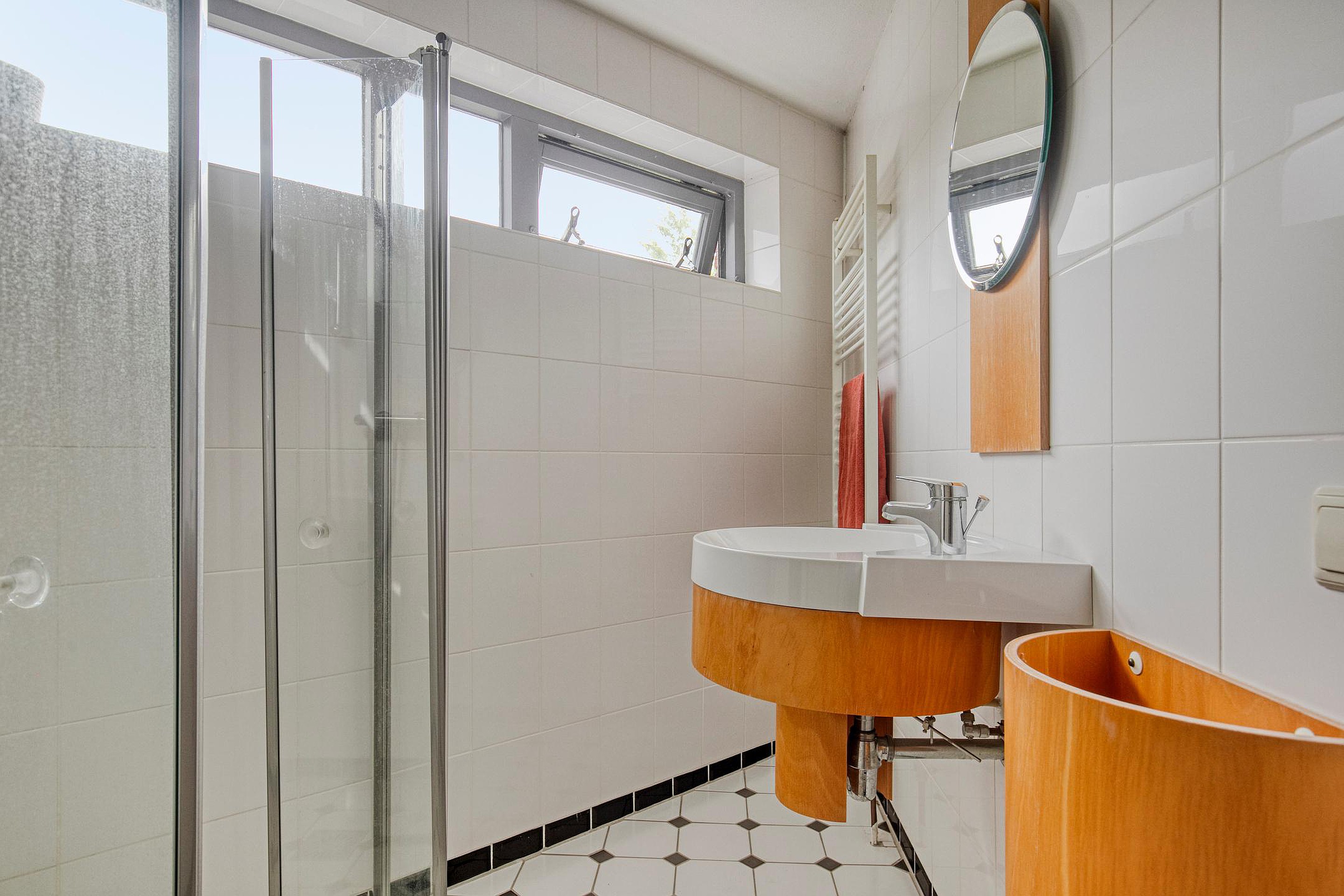 Eerste verdieping De eerste verdieping biedt volop ruimte. De master bedroom is zeer royaal en beschikt over een eigen inloopkast. Daarnaast zijn er nog twee grote slaapkamers, waarvan één eveneens met een inloopkast. Er zijn twee badkamers: één met ligbad, douche en dubbele wastafel, en een tweede badkamer met douche en wastafel. Het toilet is separaat op de overloop.
