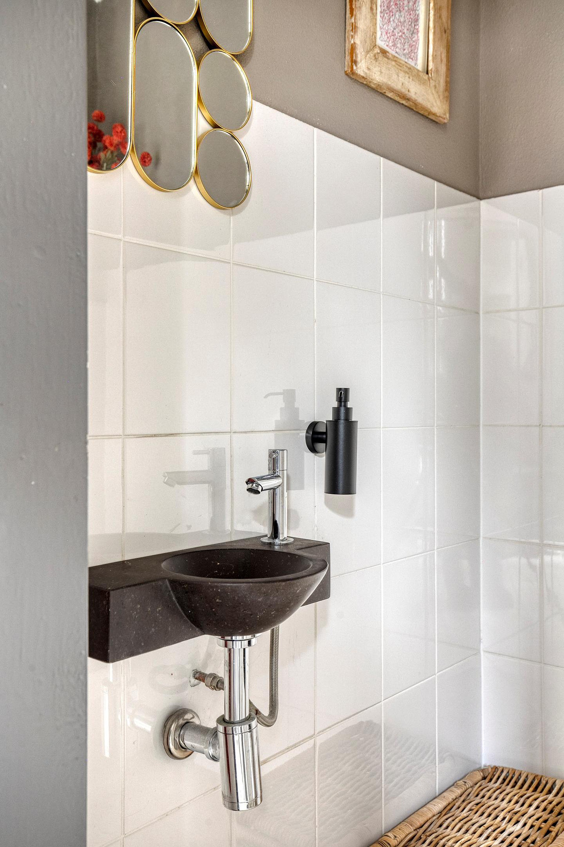 - Luxe afwerkingen, waaronder marmeren vloer en grote antraciet vloertegels, hoogglans keuken en dubbele deuren met glas