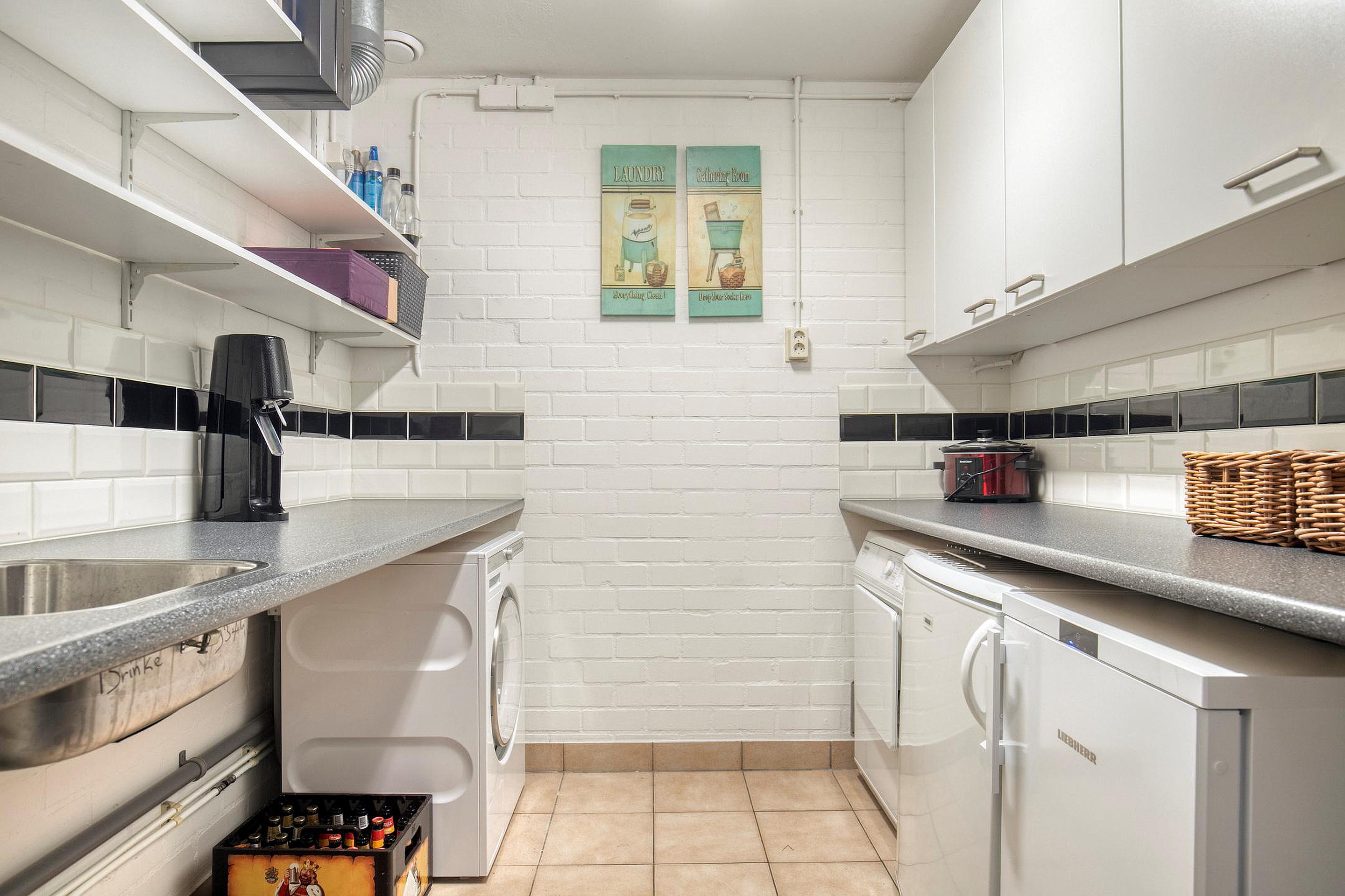Een praktische bijkeuken met witgoedaansluitingen en een doorgang naar de ruime garage maken de begane grond compleet.