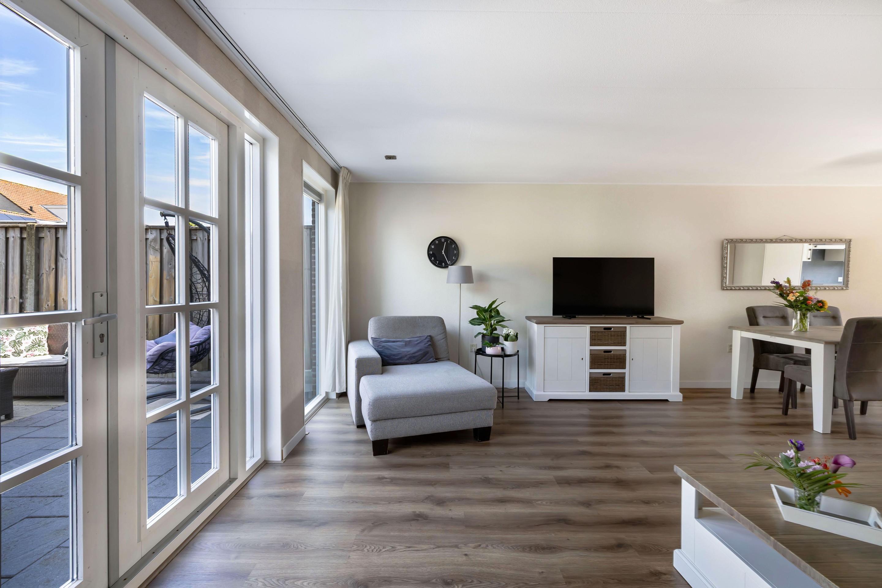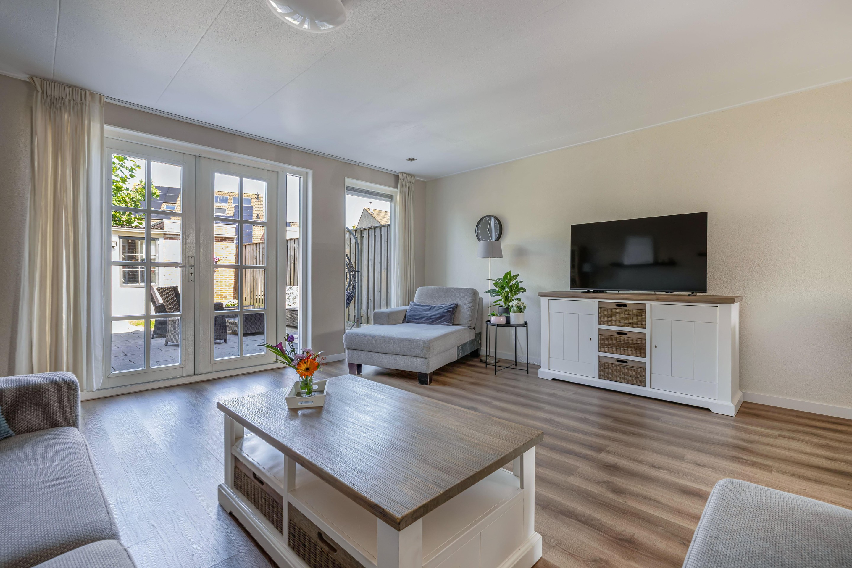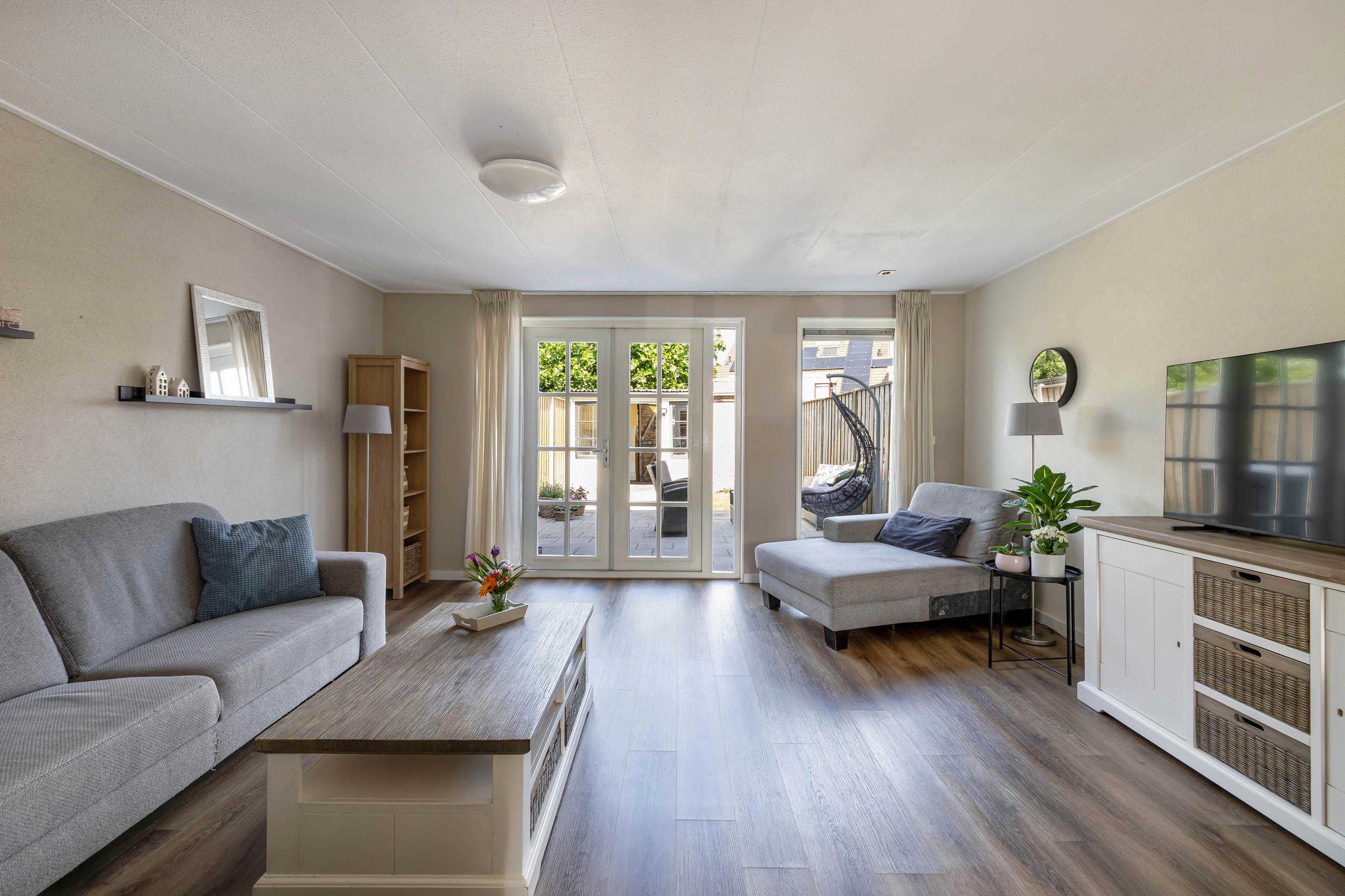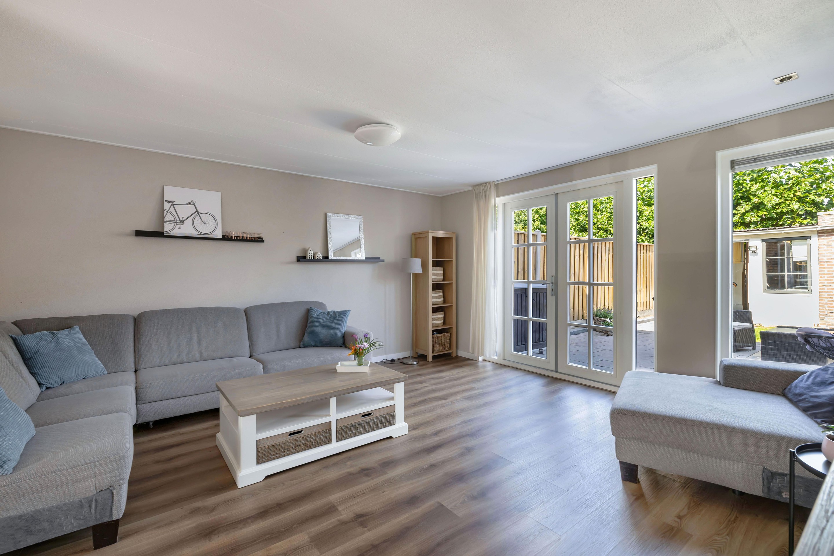 - Woonkamer met veel natuurlijk lichtinval, openslaande deuren naar de tuin en een pvc-vloer