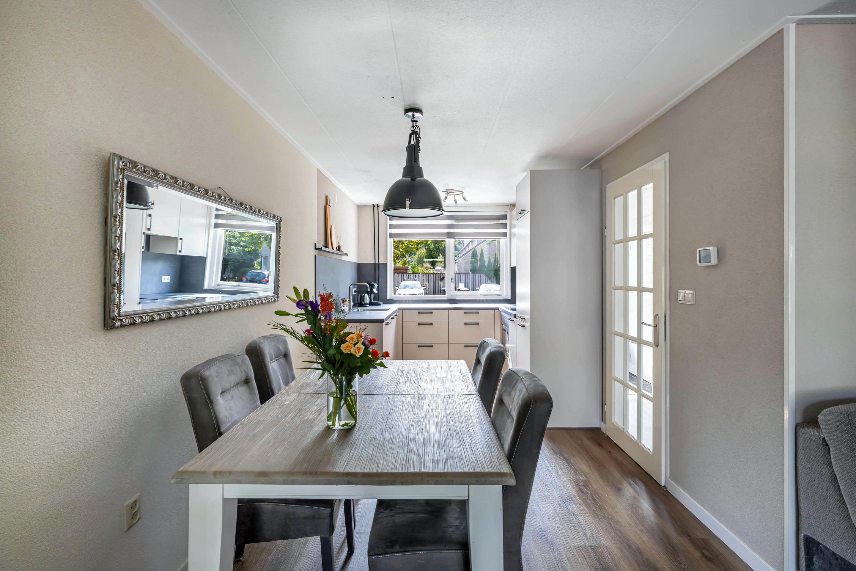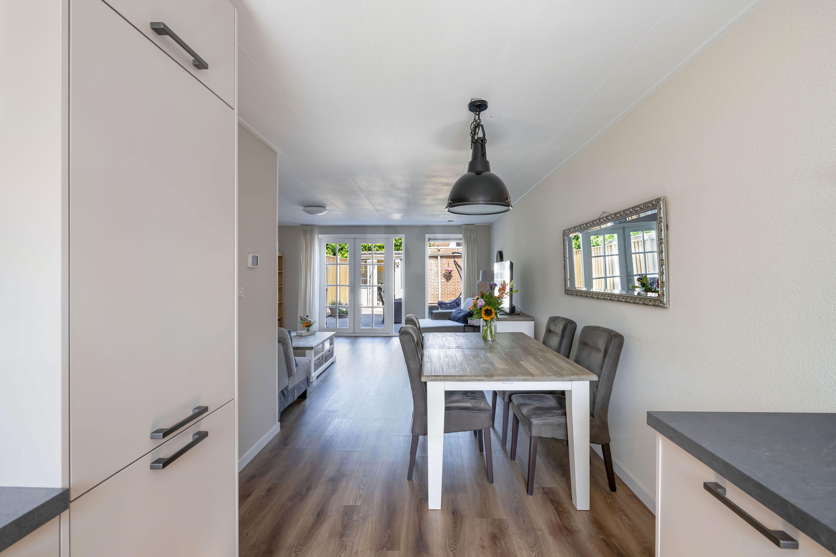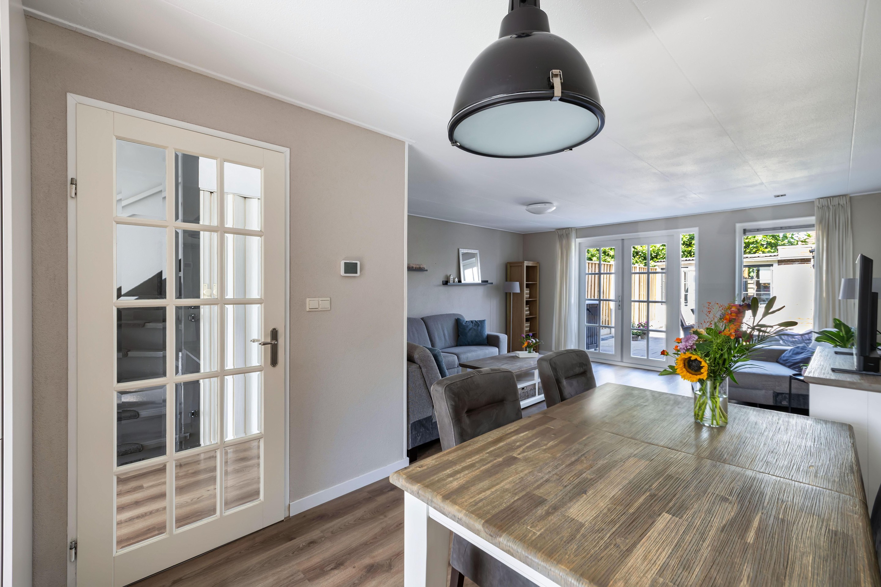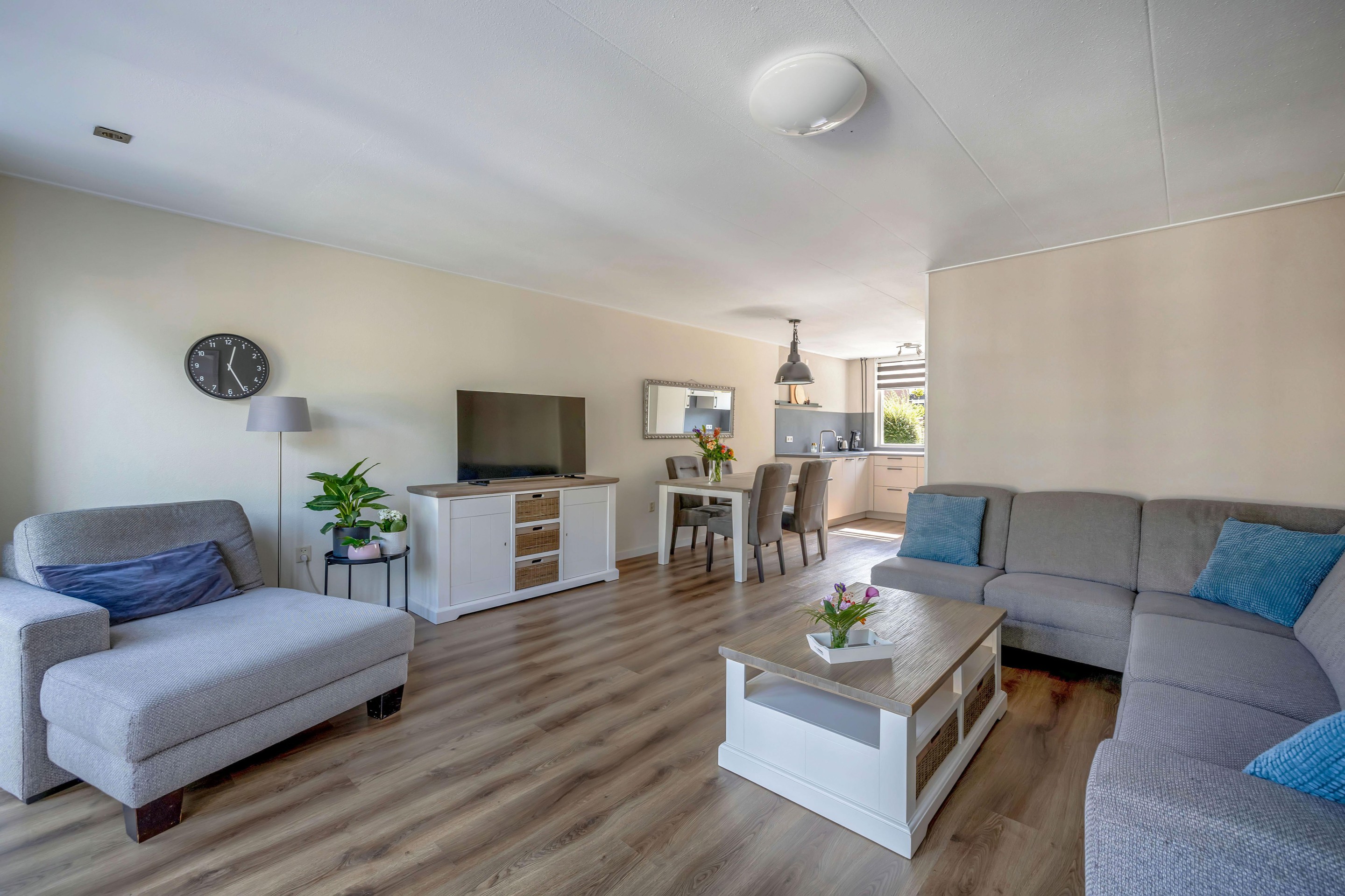 De woonkamer ligt aan de achterzijde en is tuin gericht. Vanwege de grote ramen is er veel natuurlijk lichtinval. Op de vloer ligt een pvc-vloer met houtlook.