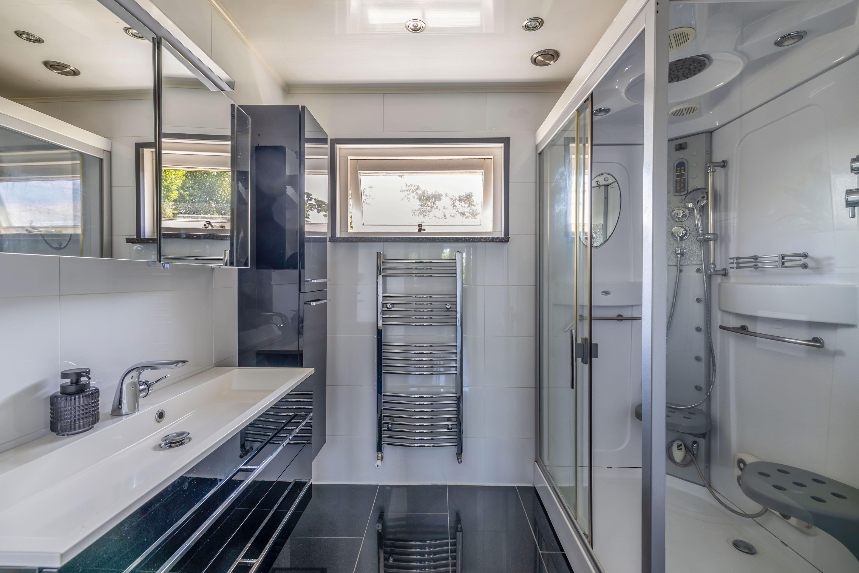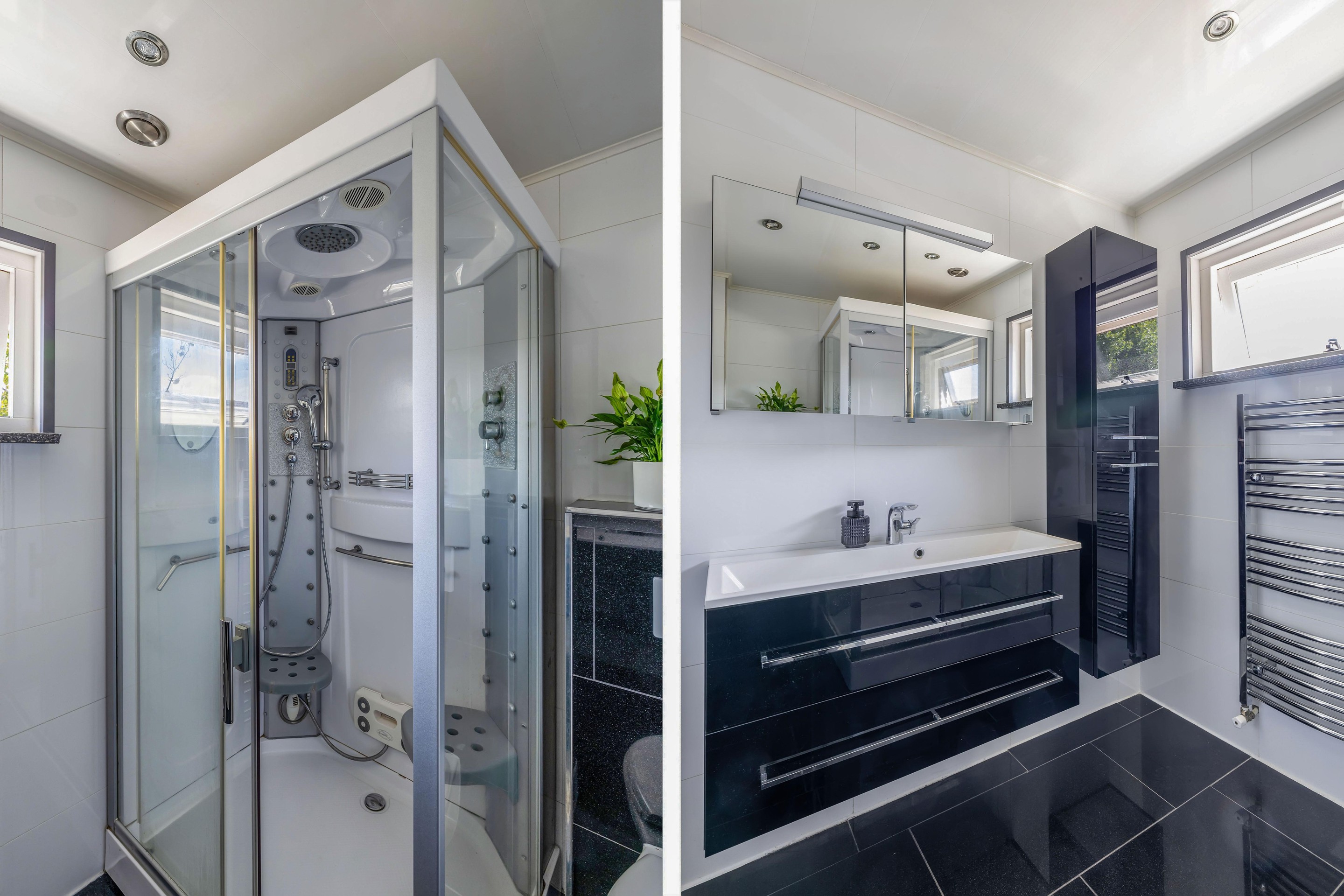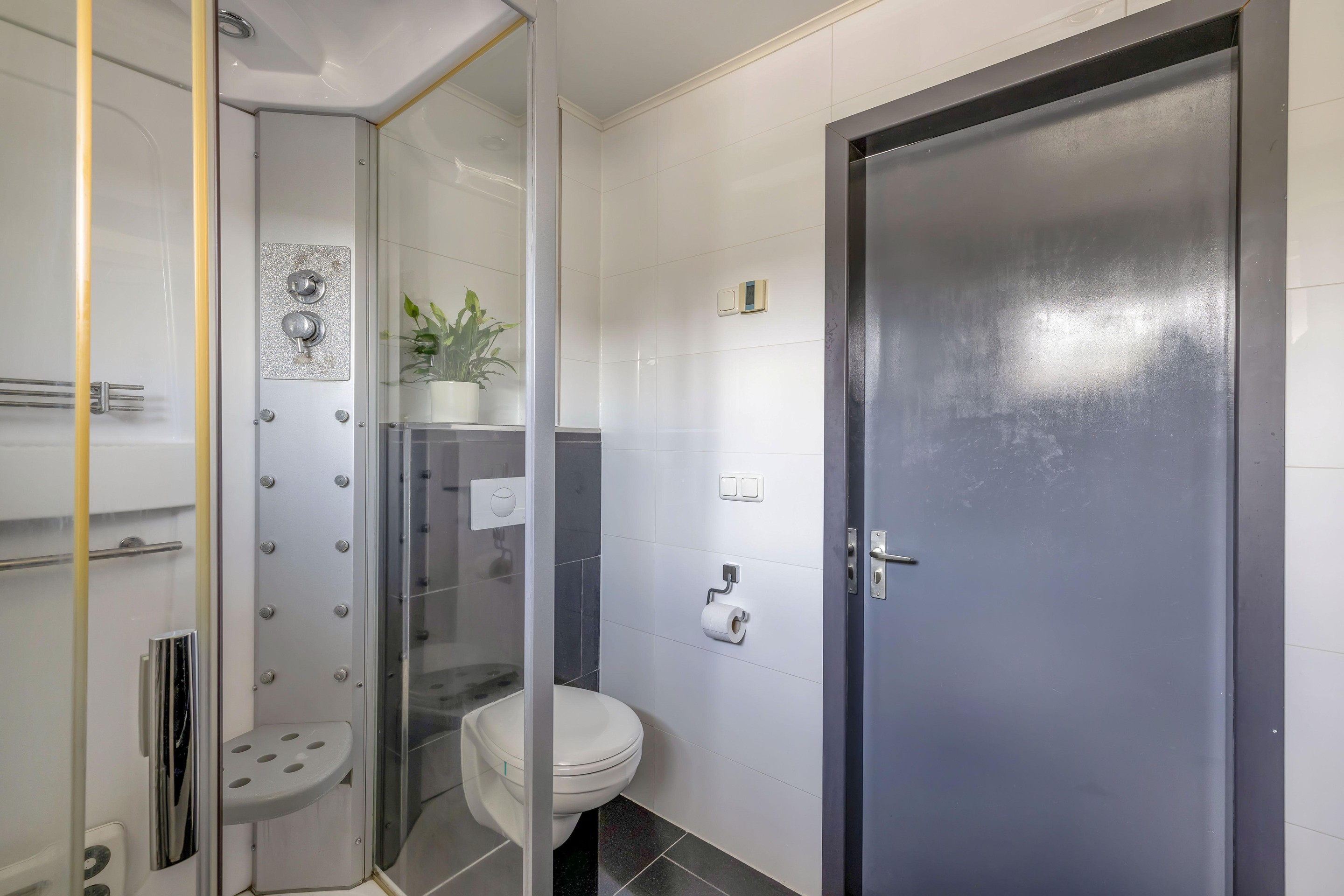 - Badkamer met tweede toilet, douchecabine, designradiator en wastafelmeubel