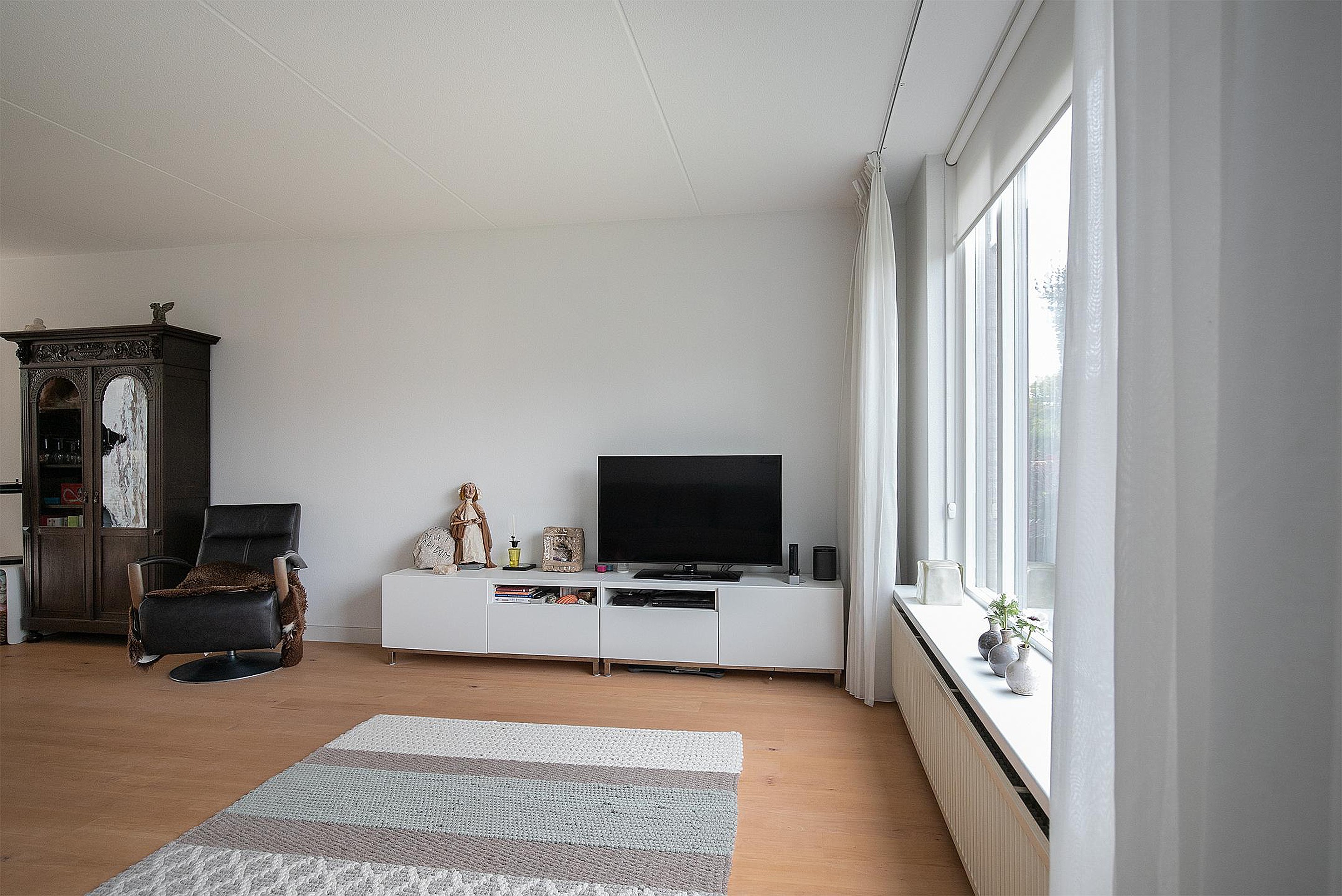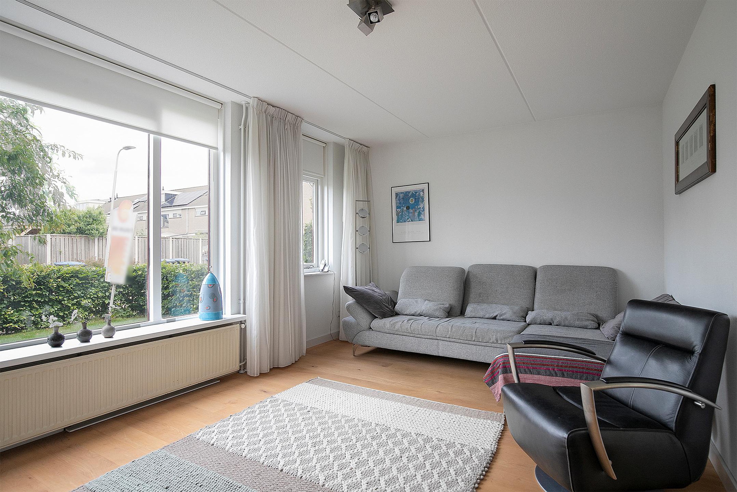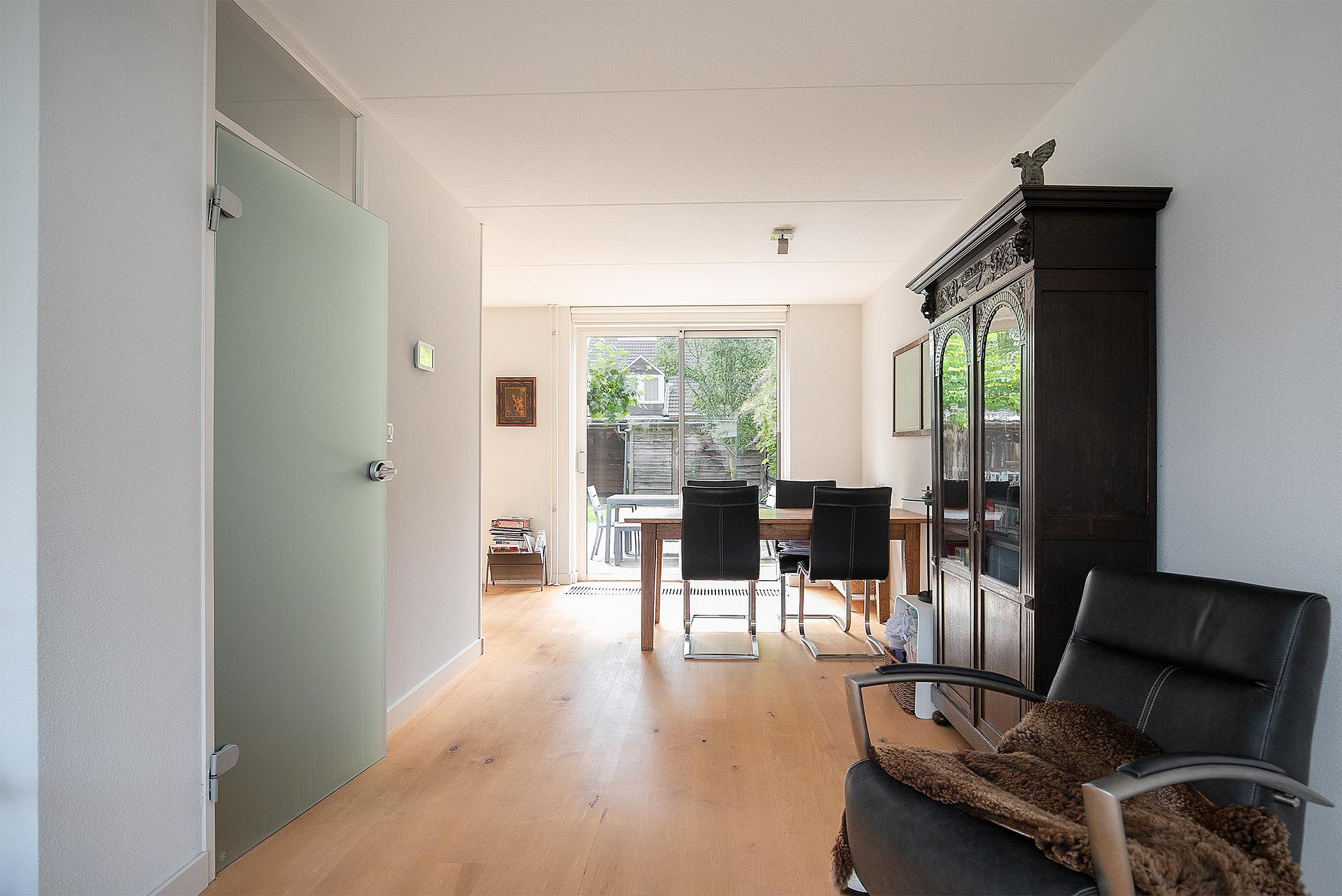 -L-vormige woonkamer met massief houten vloer en schuifpui naar de achtertuin.