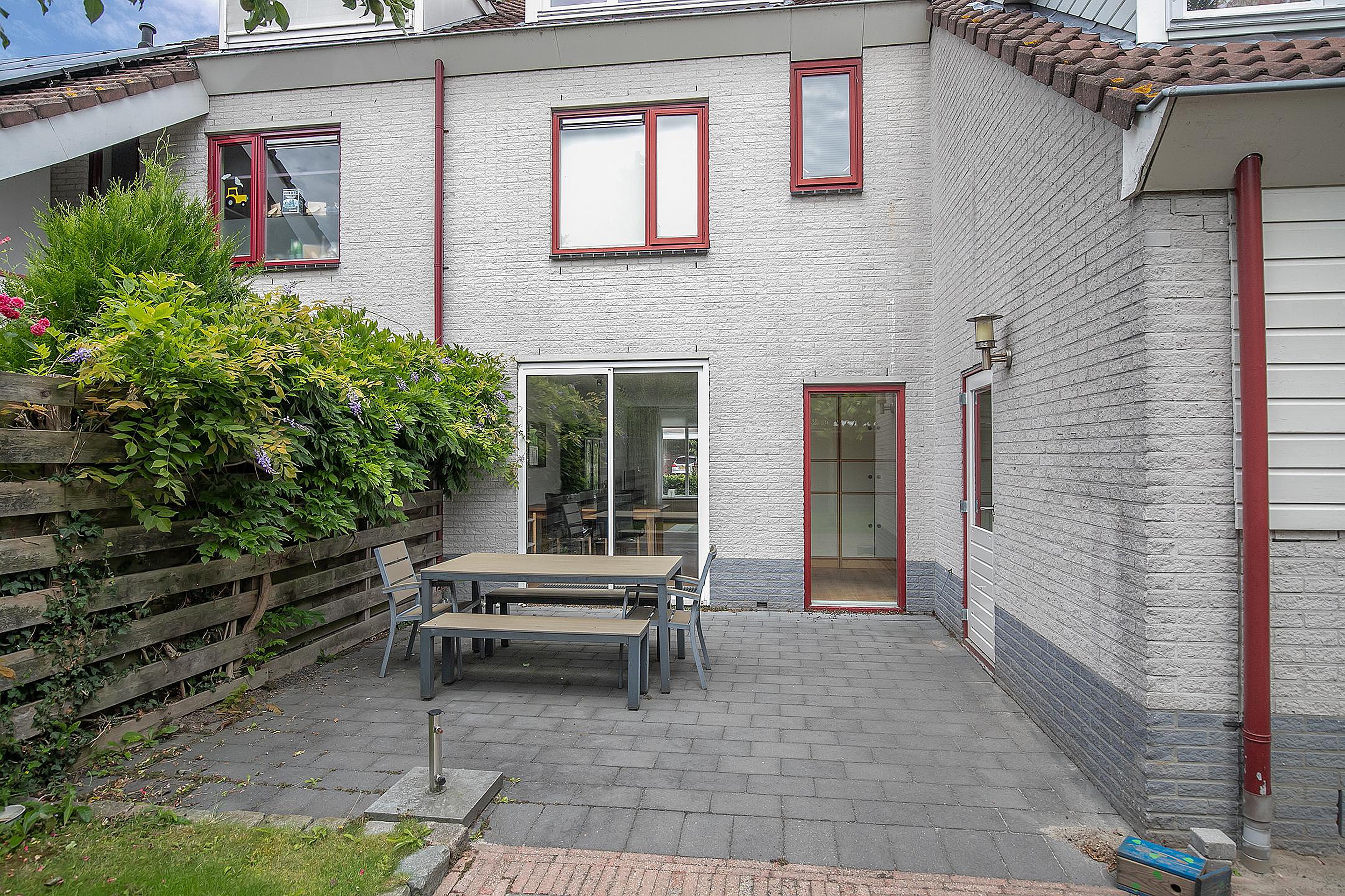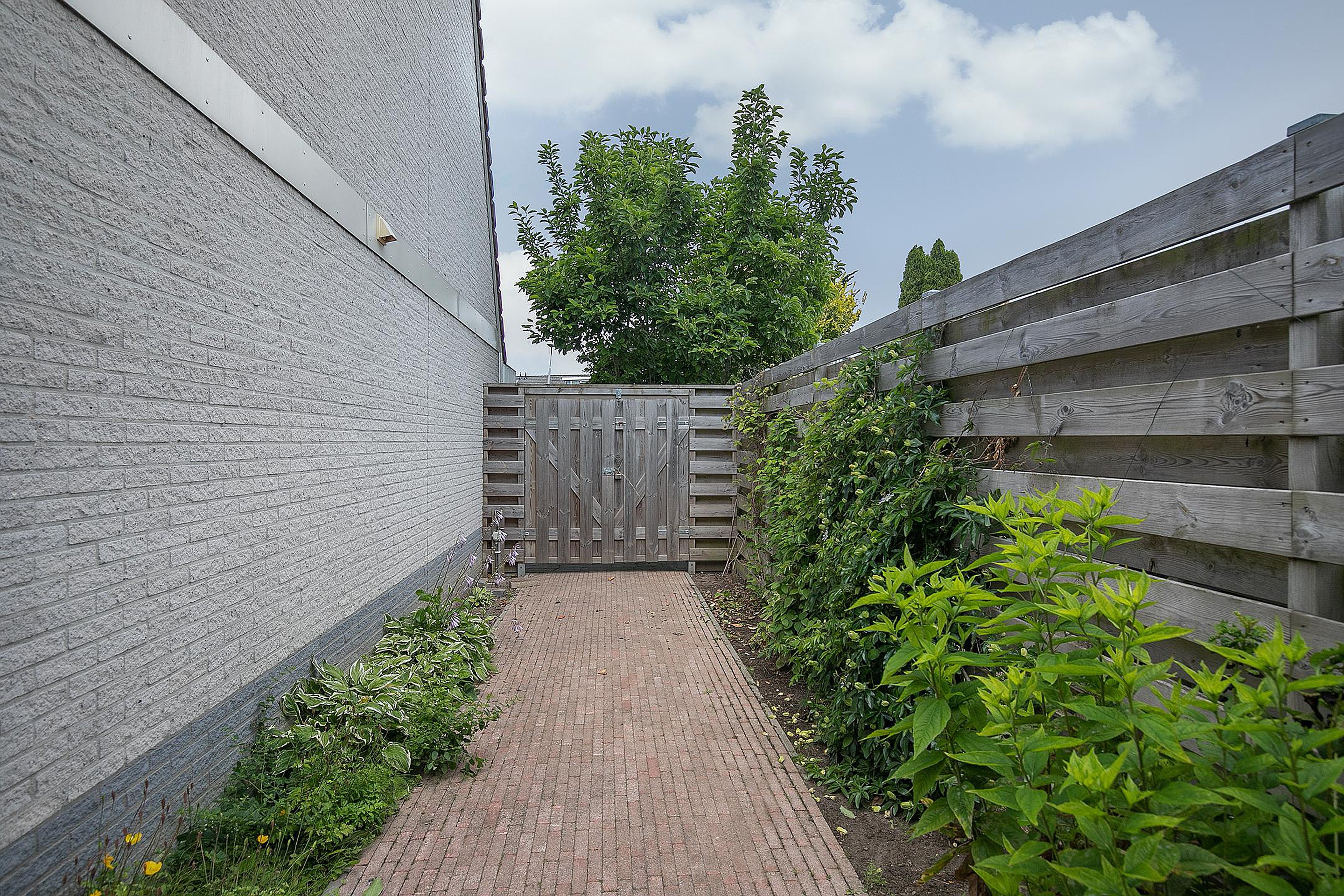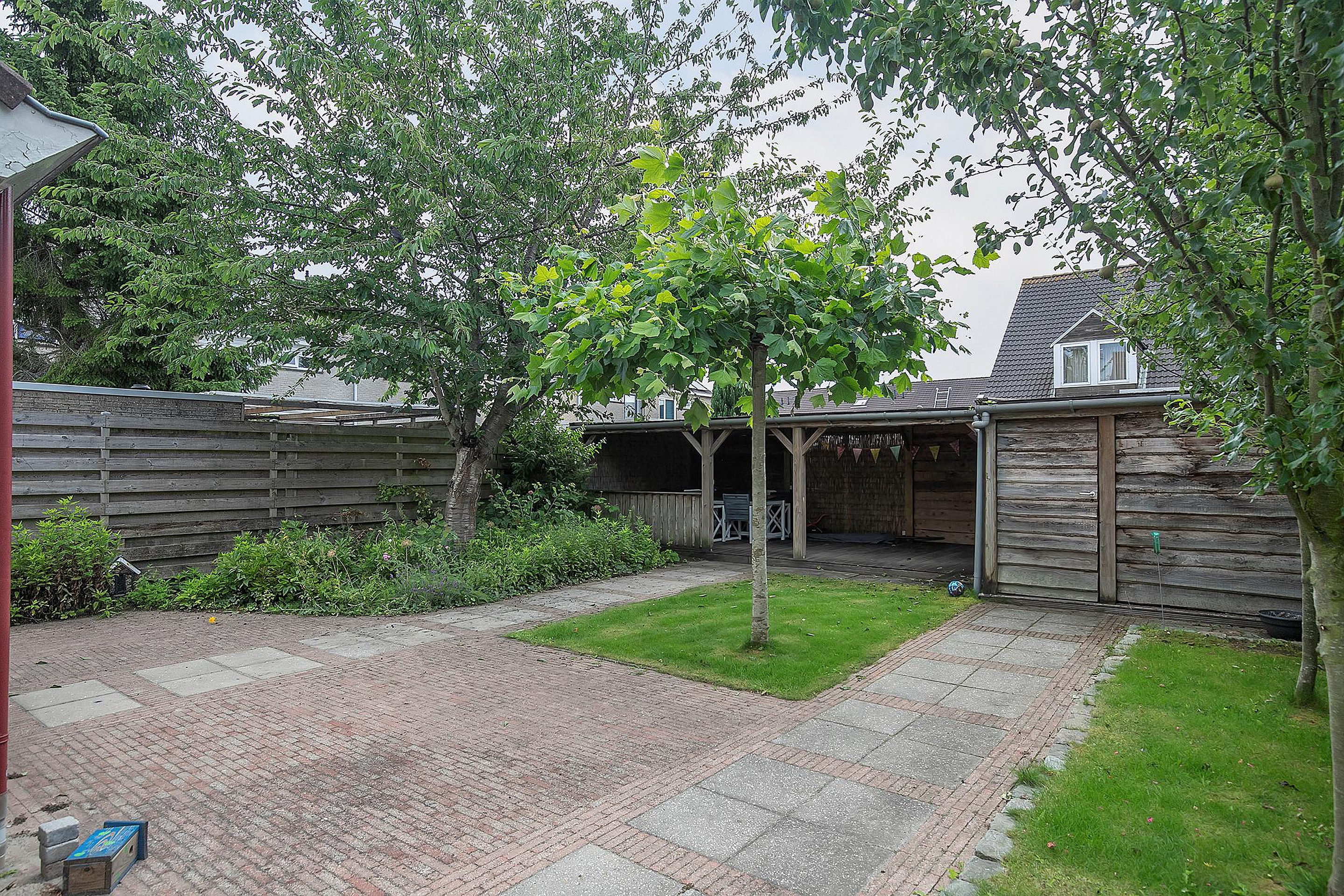 Tuin De achtertuin van ca. 15 x 11 meter ligt op het zuidwesten en biedt veel privacy. Over de volle breedte is een royale veranda met houten schuur gerealiseerd. Naast de woning is voldoende ruimte voor caravan of aanhanger. De brede oprit en poortdeur maken het eenvoudig om met een aanhanger achterom te komen.