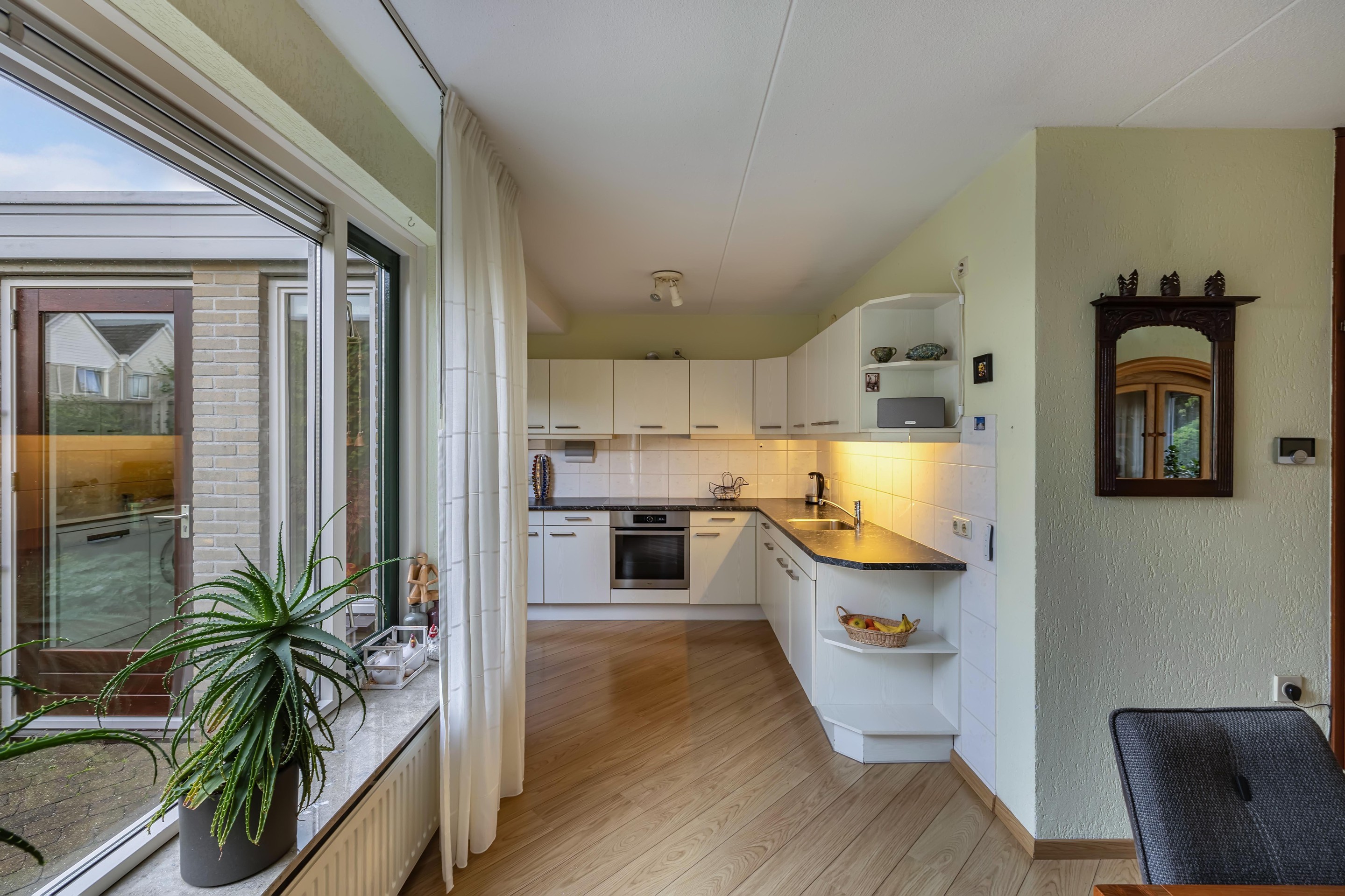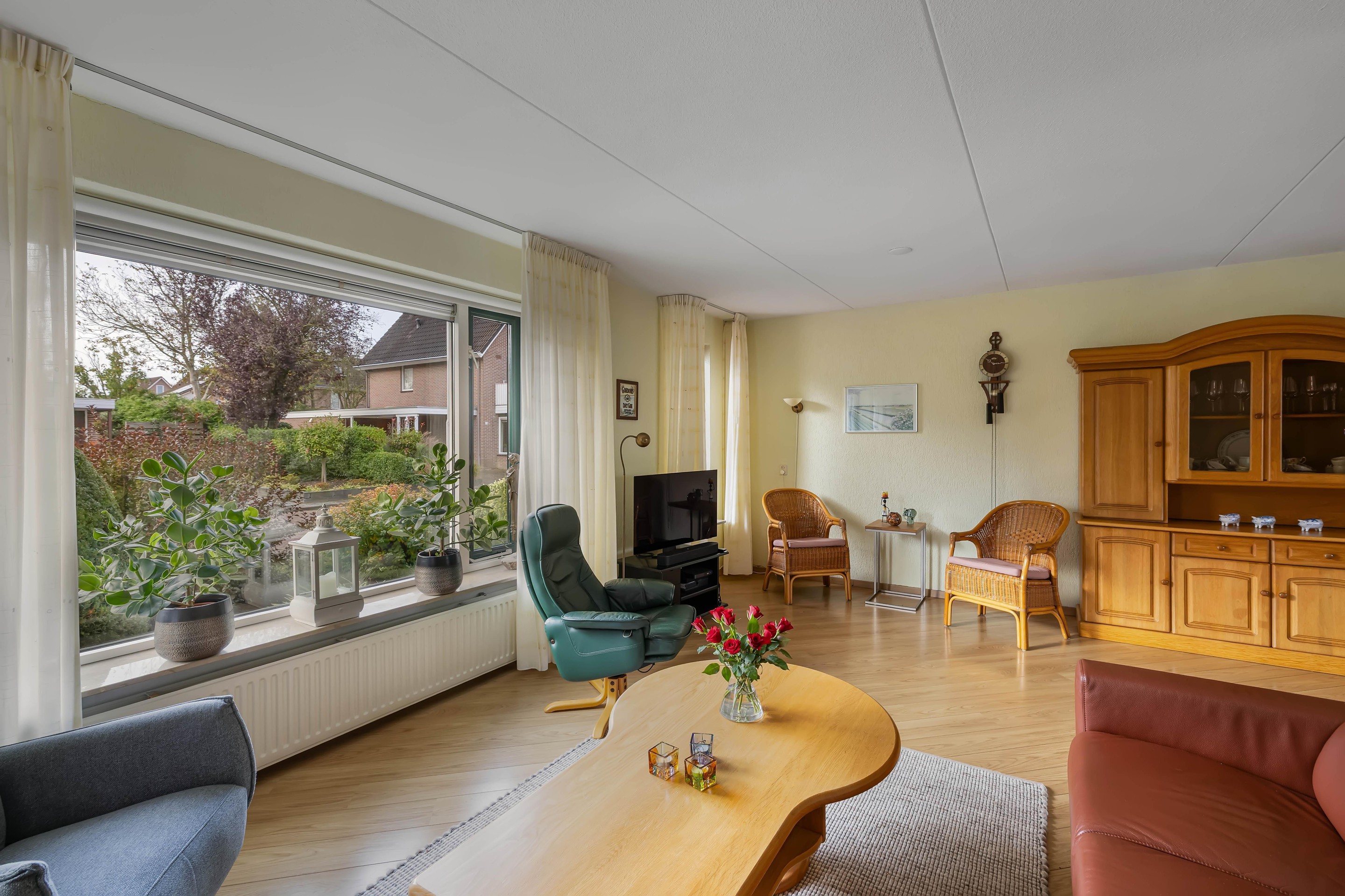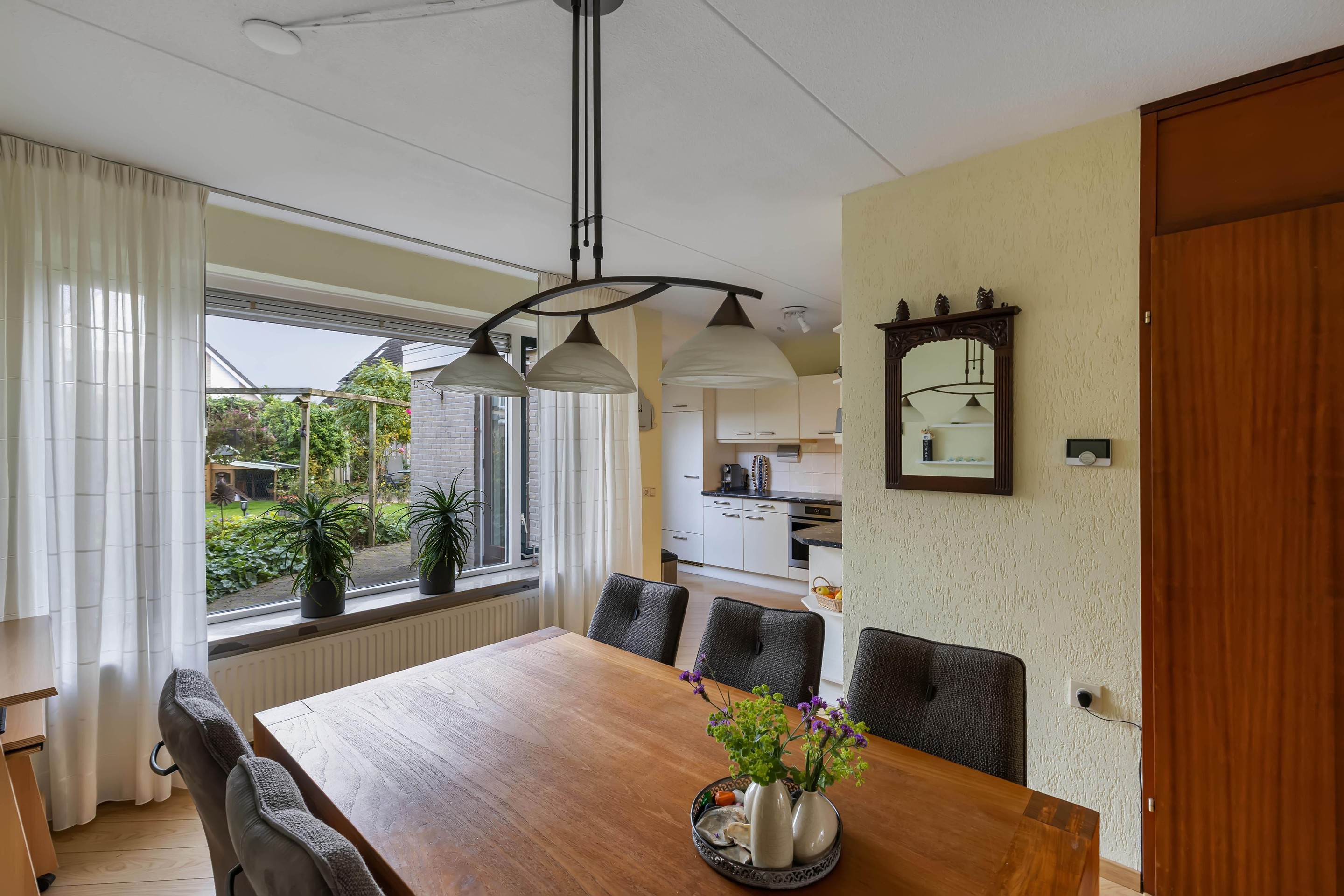 De woonkamer ligt aan de voorzijde van de woning. Via de eetkamer kom je in de halfopen keuken. Via de aangrenzende bijkeuken kun je ook naar de garage.