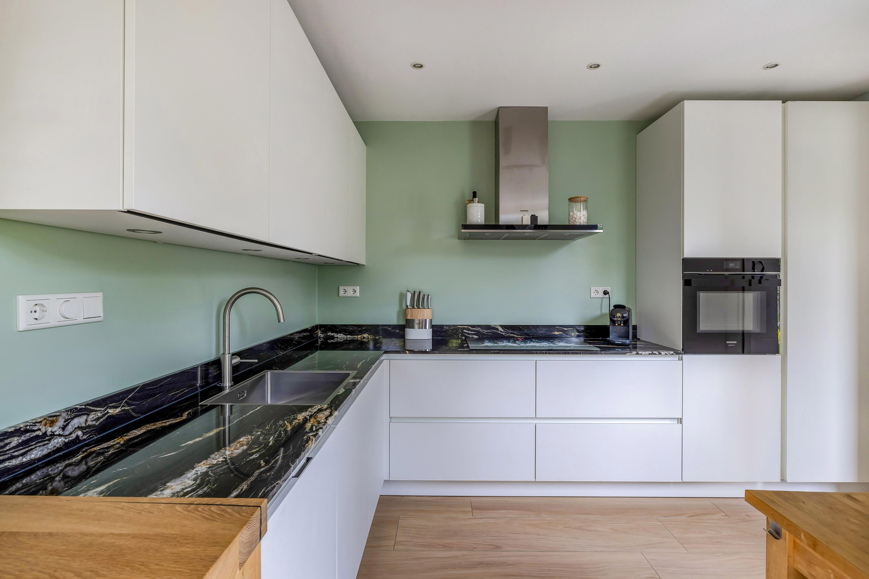 De moderne open keuken is met hoogwaardige Siemens inbouwapparatuur van alle gemakken voorzien.