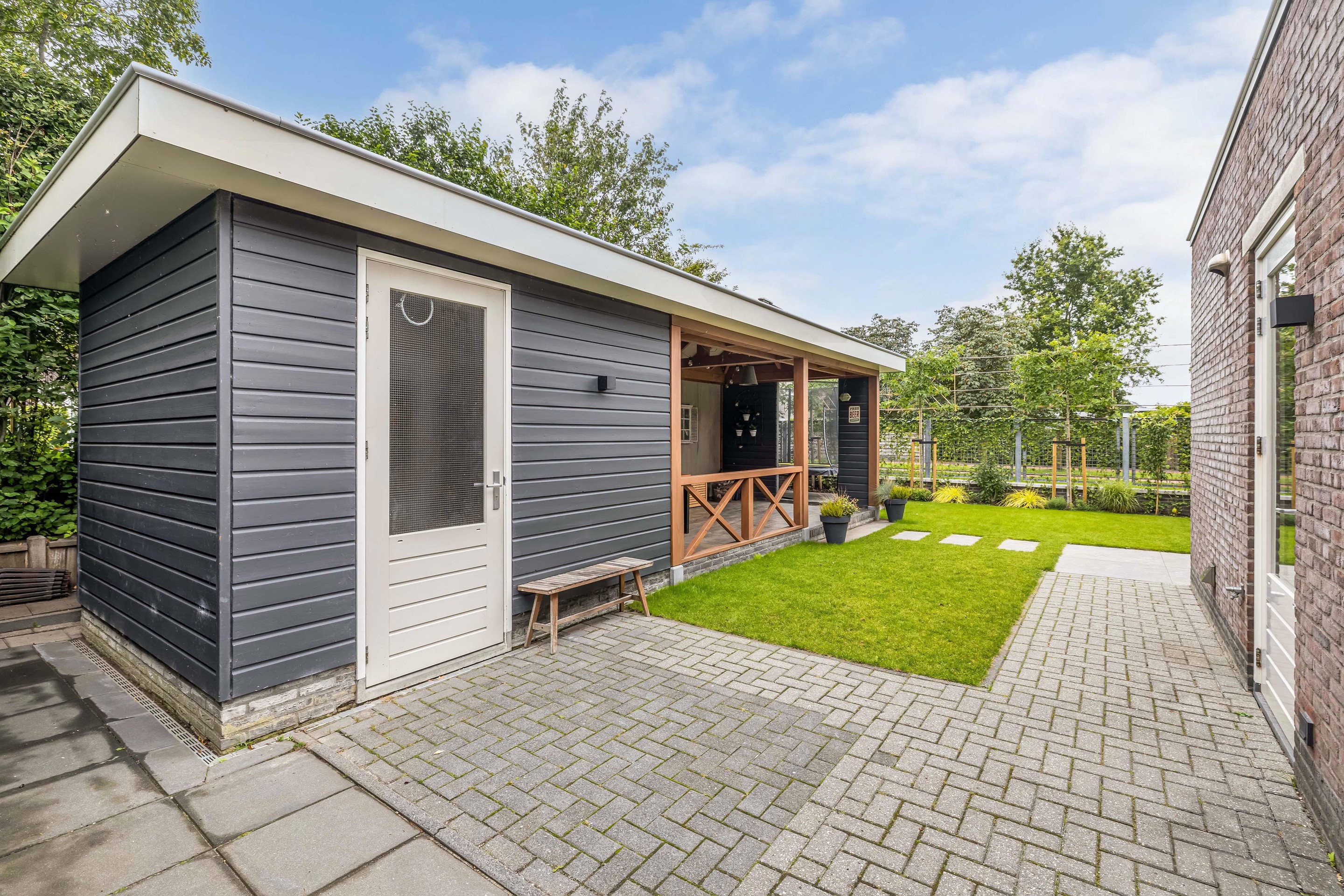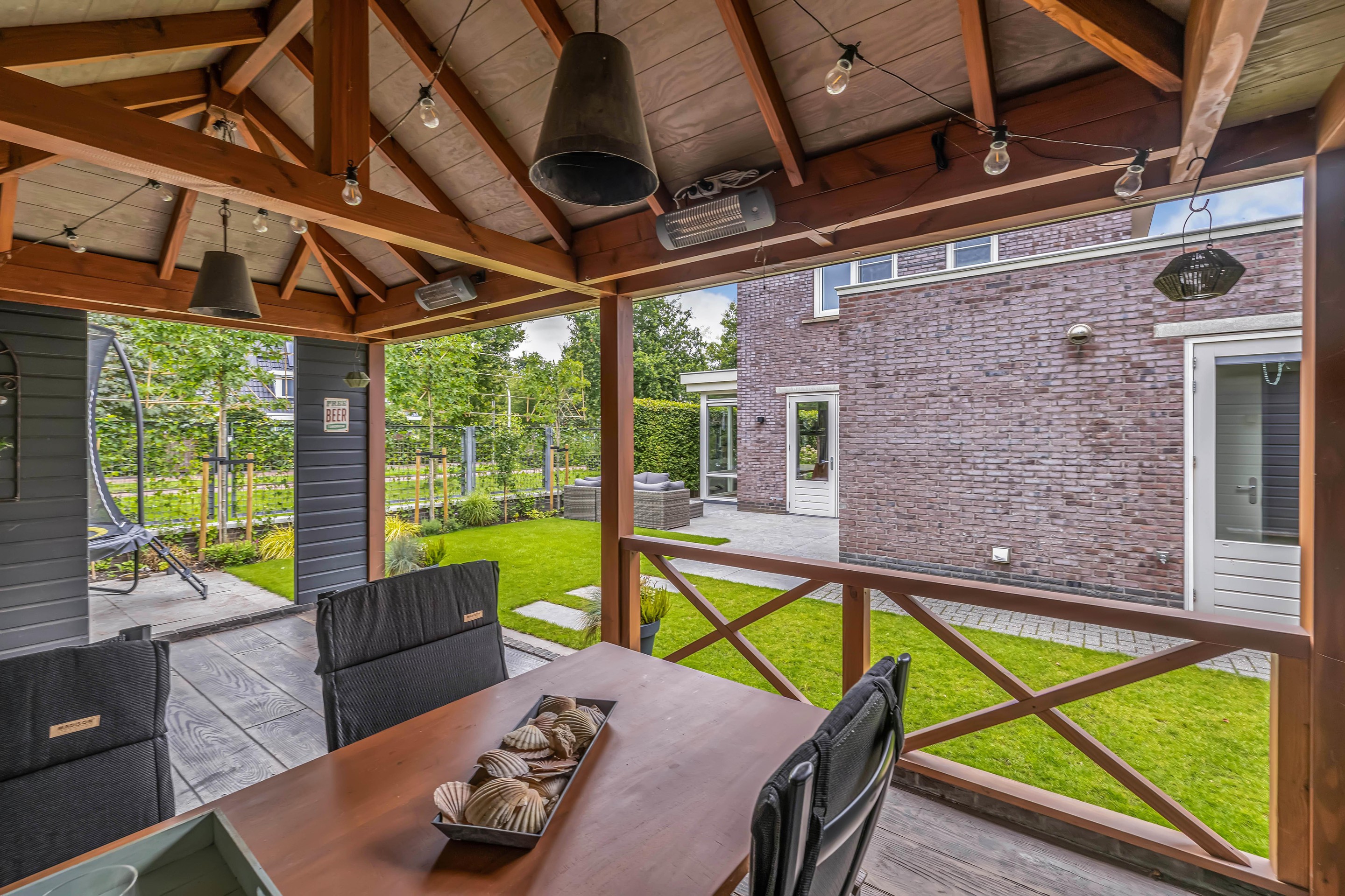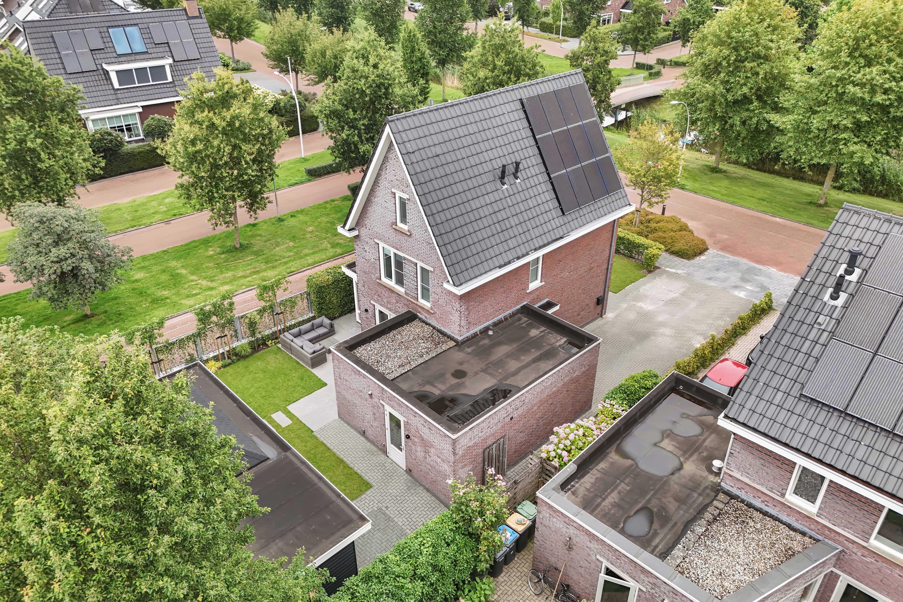Achterin de tuin vind je een ruime vrijstaande overkapping met betonvloer waar je heerlijk kunt zitten en aangrenzend een ruime afsluitbare berging. Naast de woning is een park met fiets/loopbrug over het water.