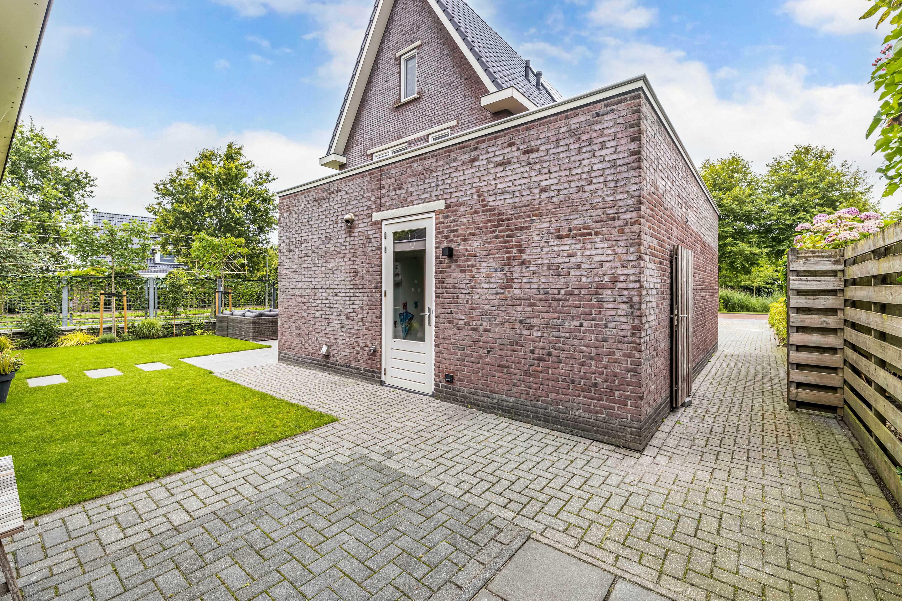 De tuin loopt rondom het huis en is perfect onderhouden. De achtertuin ligt op het westen, zodat je heerlijk kunt genieten van de avondzon. Dankzij de groene begroeiing heeft u volledige privacy.