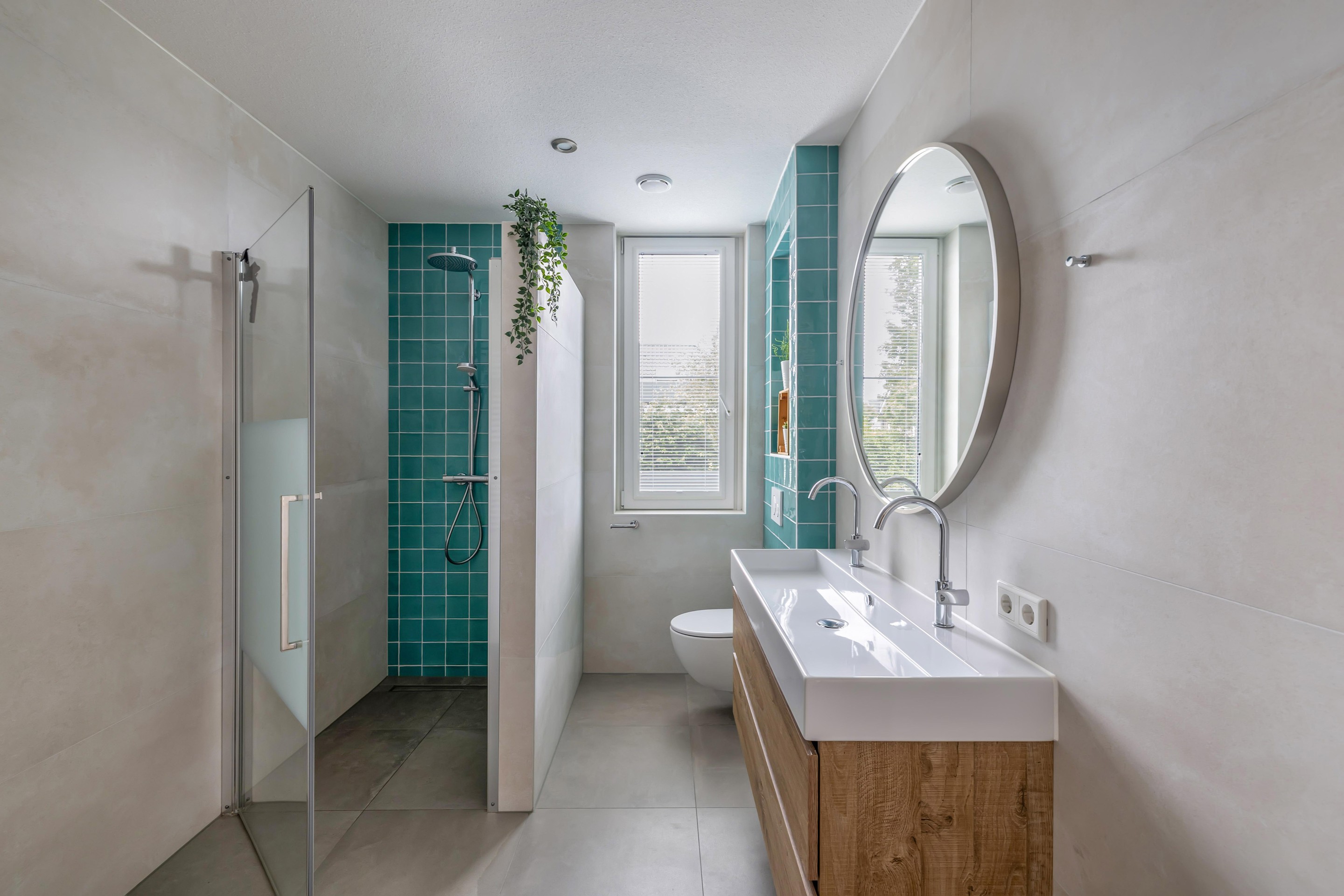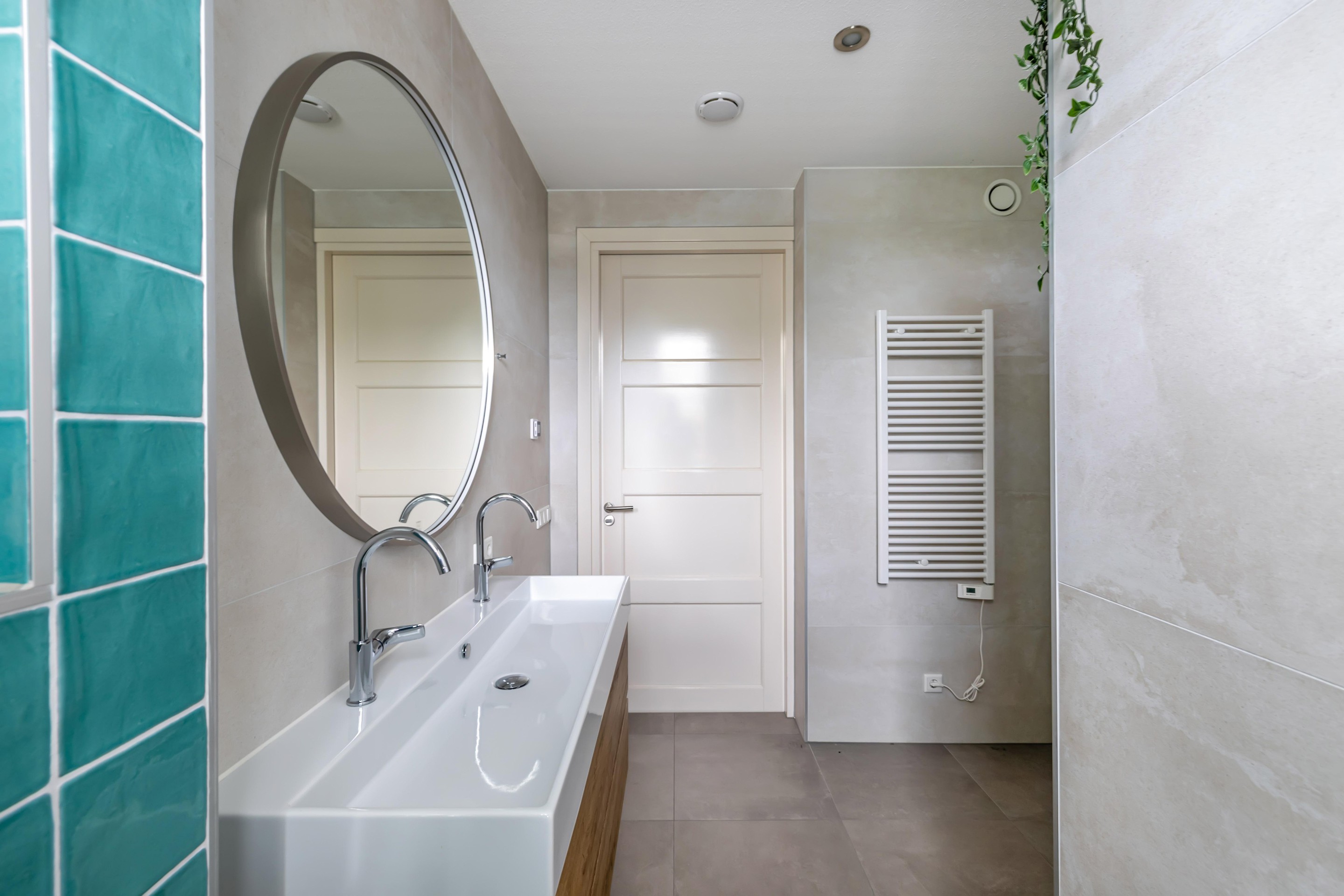- Moderne badkamer met vloerverwarming, inloopdouche, tweede toilet, dubbel wastafelmeubel en electrische designradiator