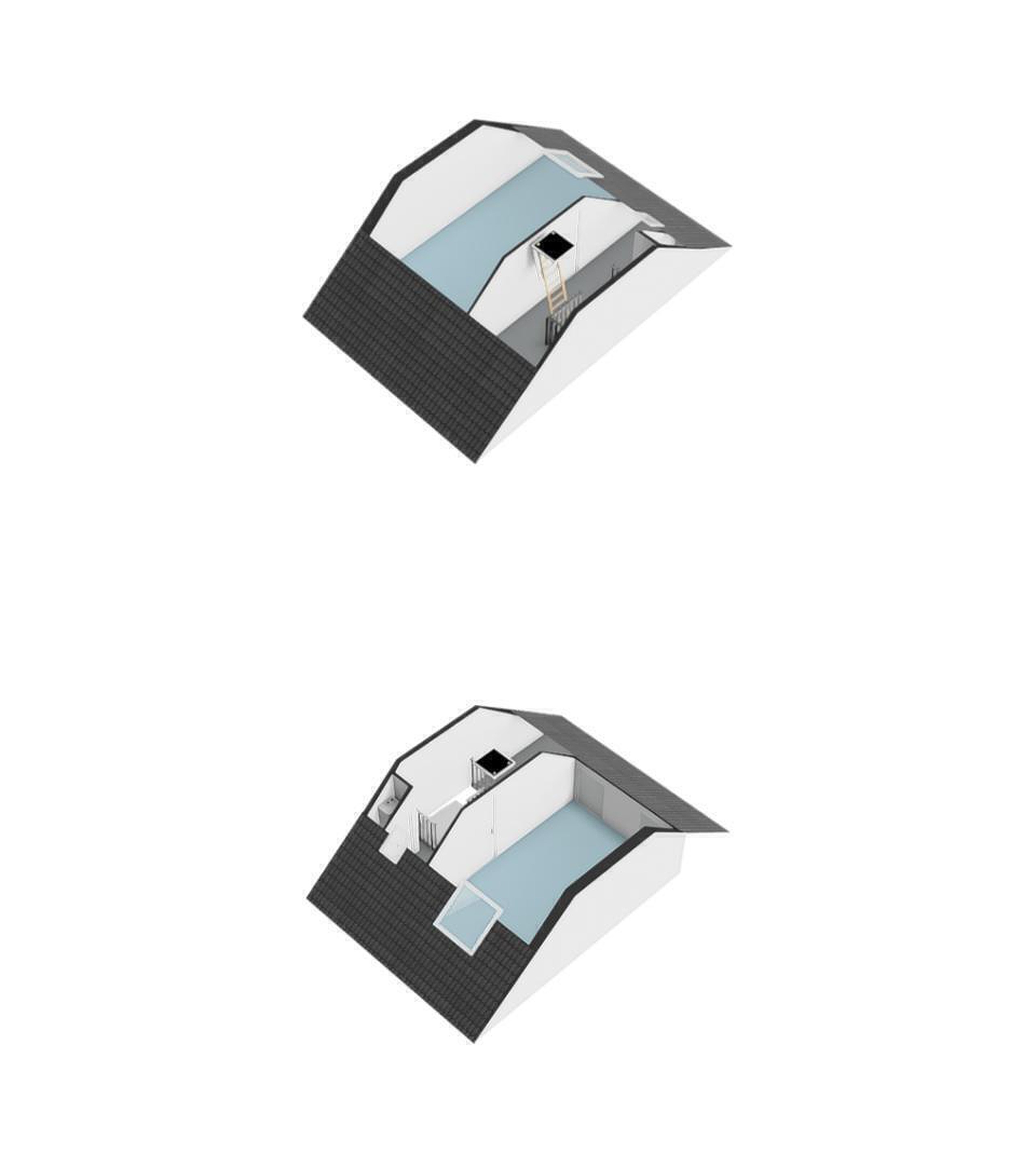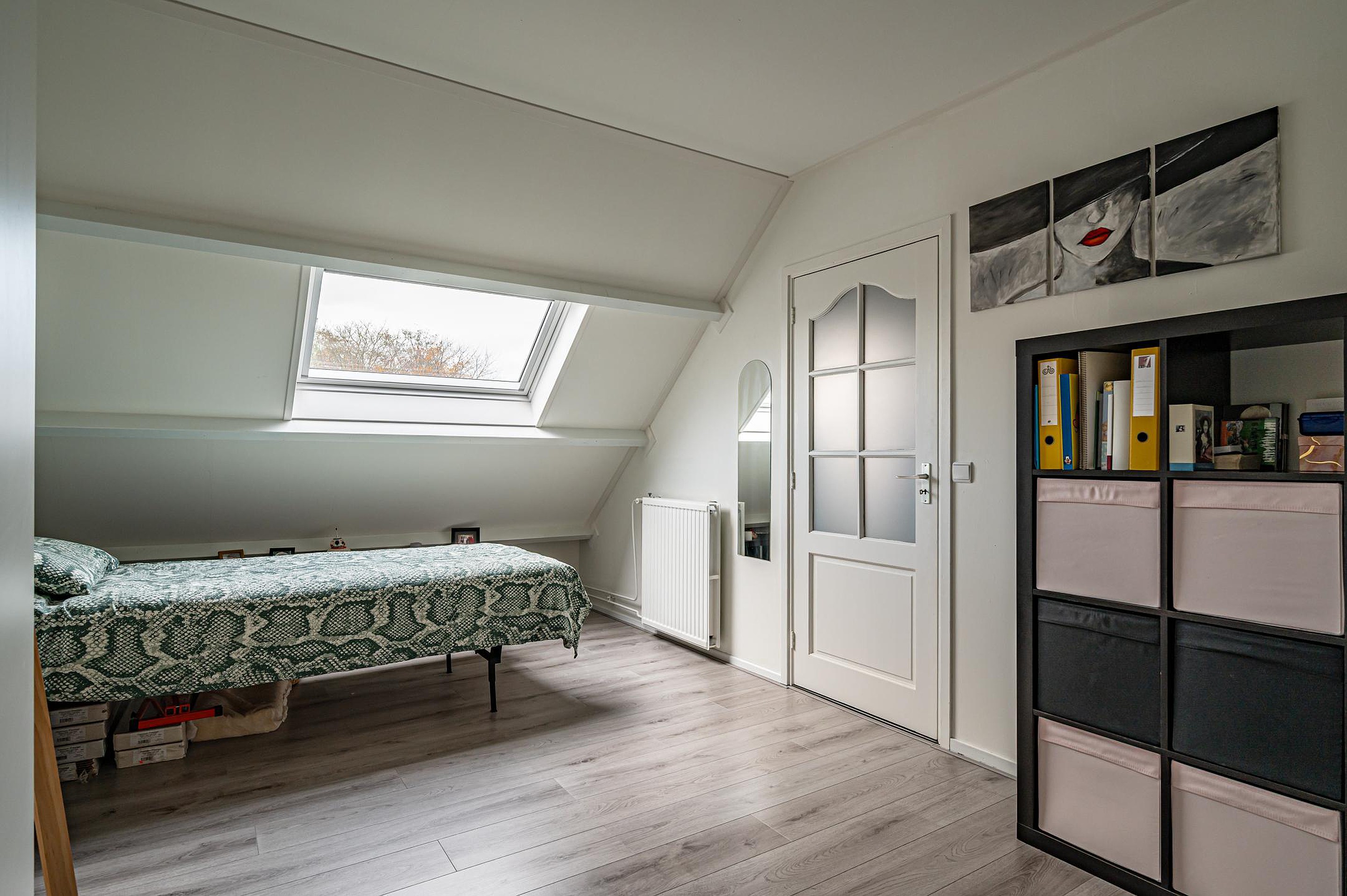 Extra slaapkamer met groot Velux-dakraam en opbergruimte achter de knieschotten.
