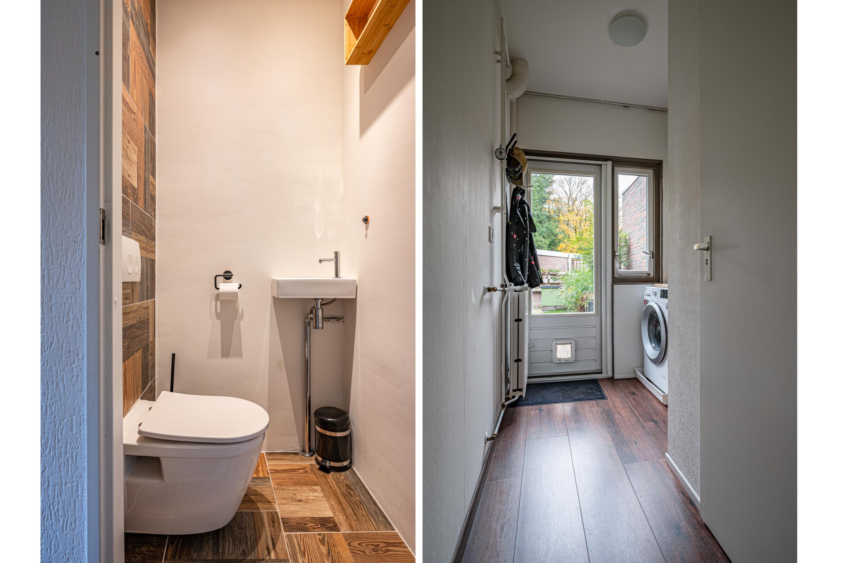 Bijkeuken met toilet, wasmachineaansluiting en achterdeur naar de tuin.