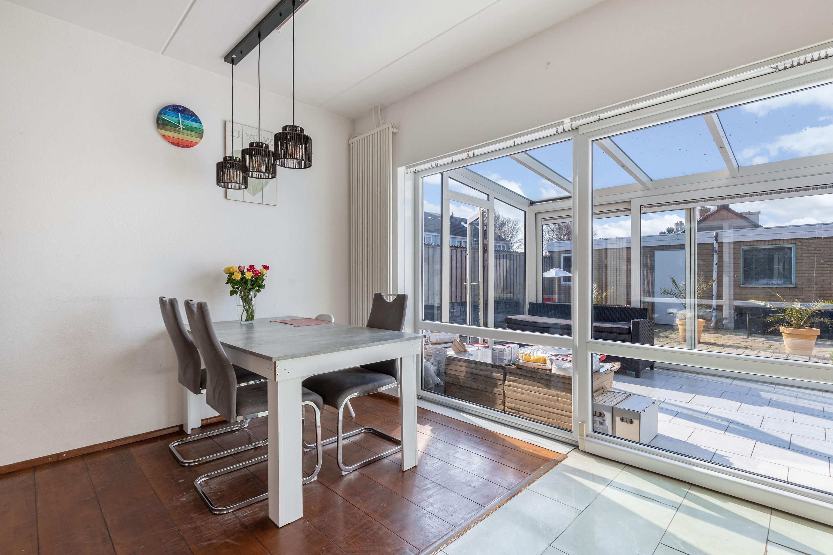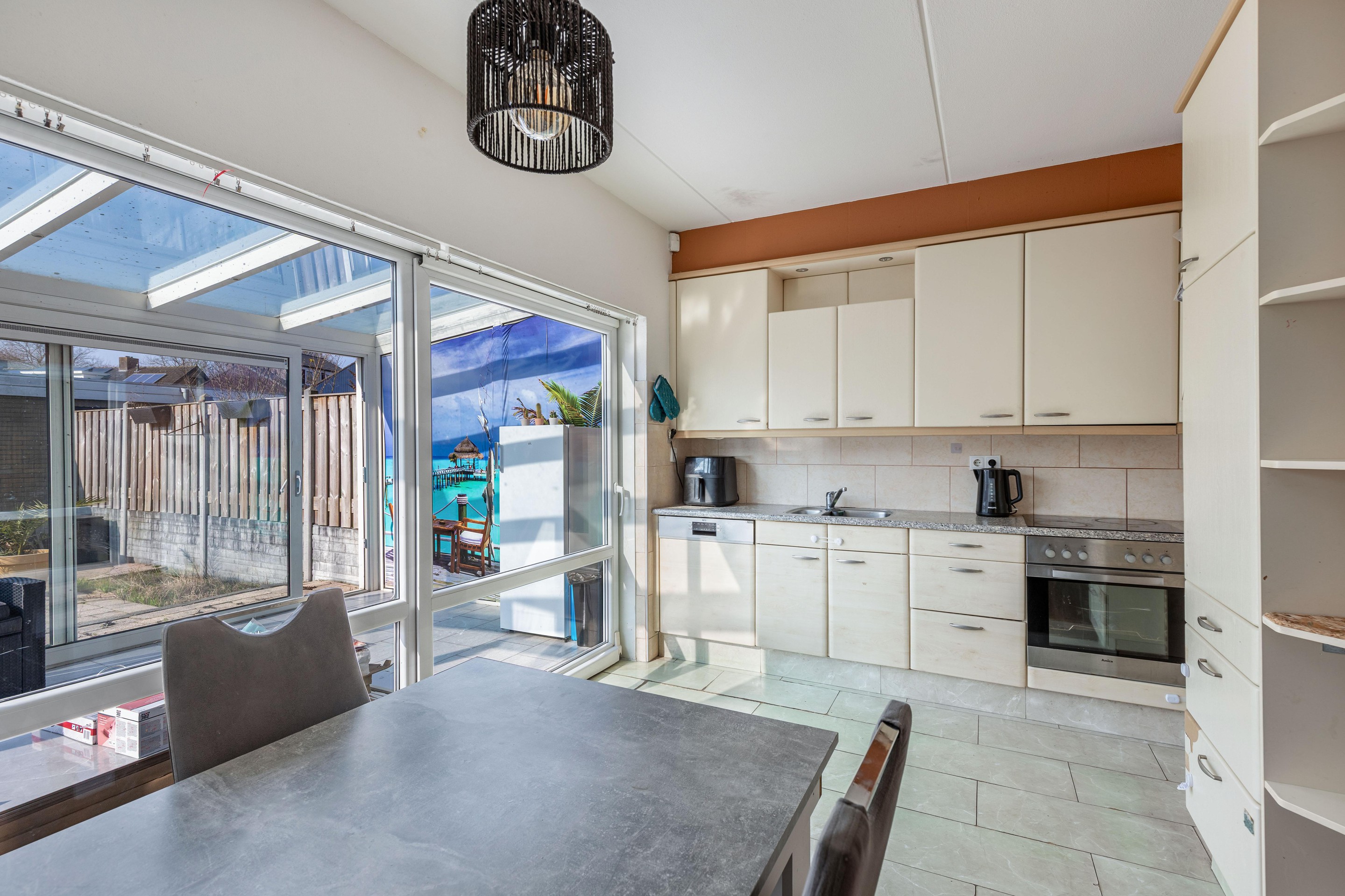 Dankzij de hoekligging en de grote raampartijen is de woonkamer opvallend licht. Aan de achterzijde bevindt zich de open keuken. Vanuit de keuken loop je door naar de serre met schuifpui. Dit is een fijne extra leefruimte, waar binnen en buiten mooi in elkaar overlopen en waar je veel lichtinval ervaart.