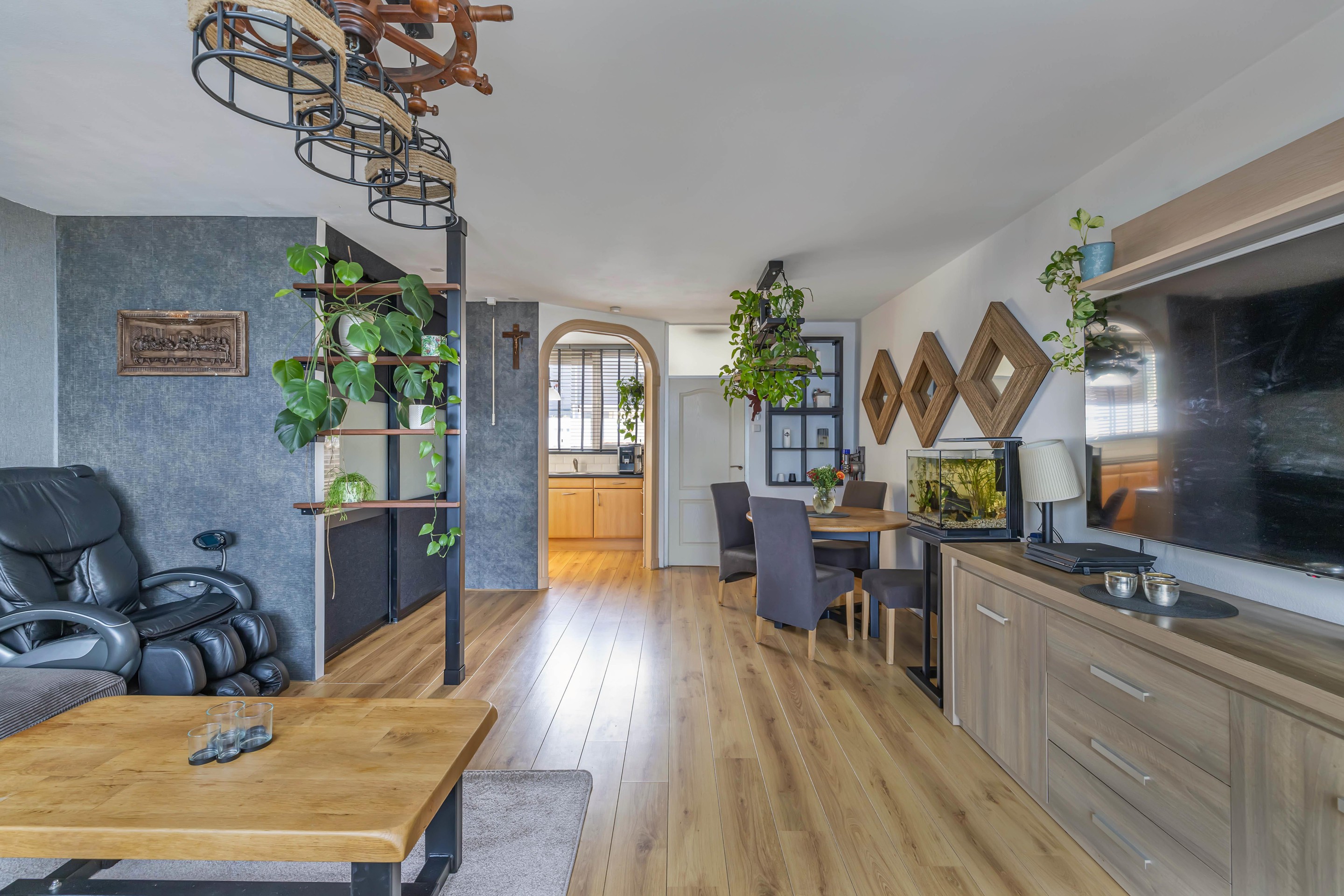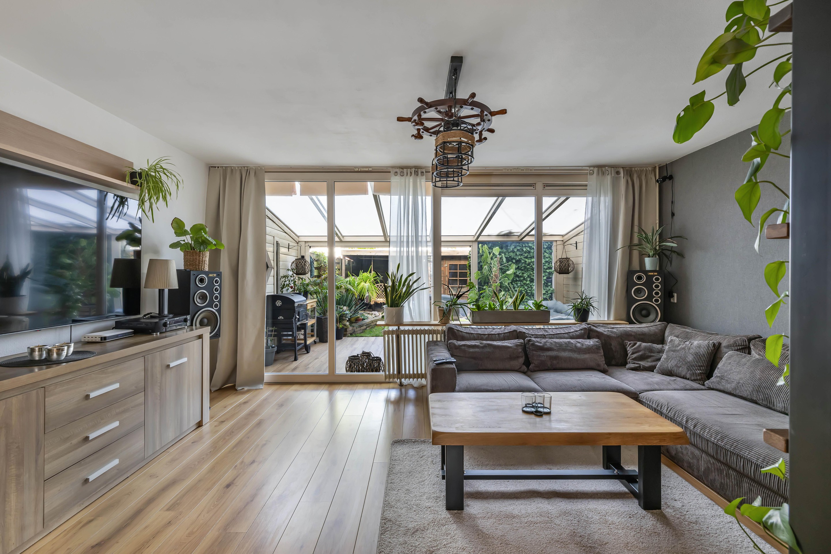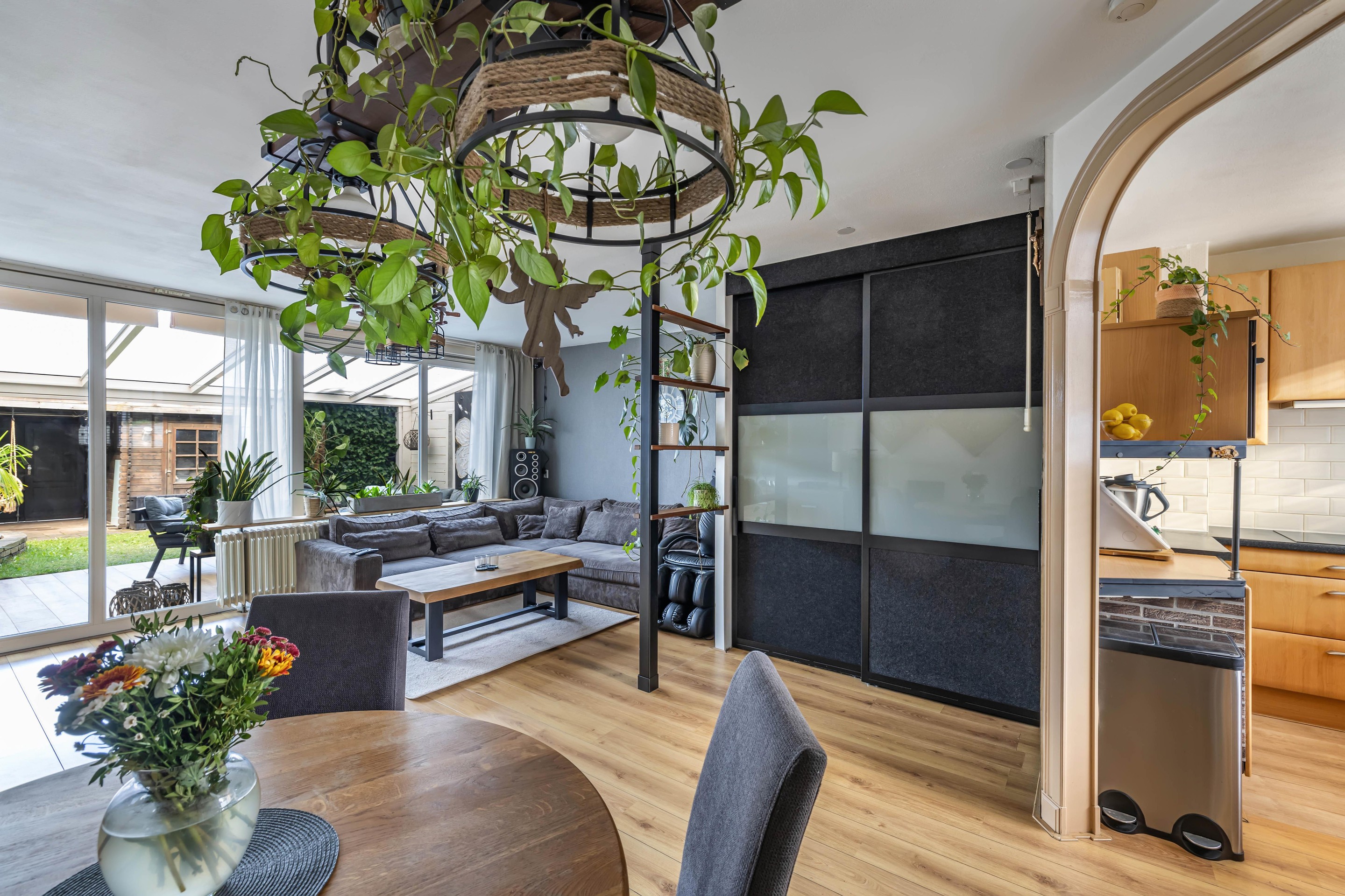 De woonkamer is erg licht door de grote raampartij met schuifpui aan de achterzijde, via welke je zo de ruime tuin op het westen inloopt.