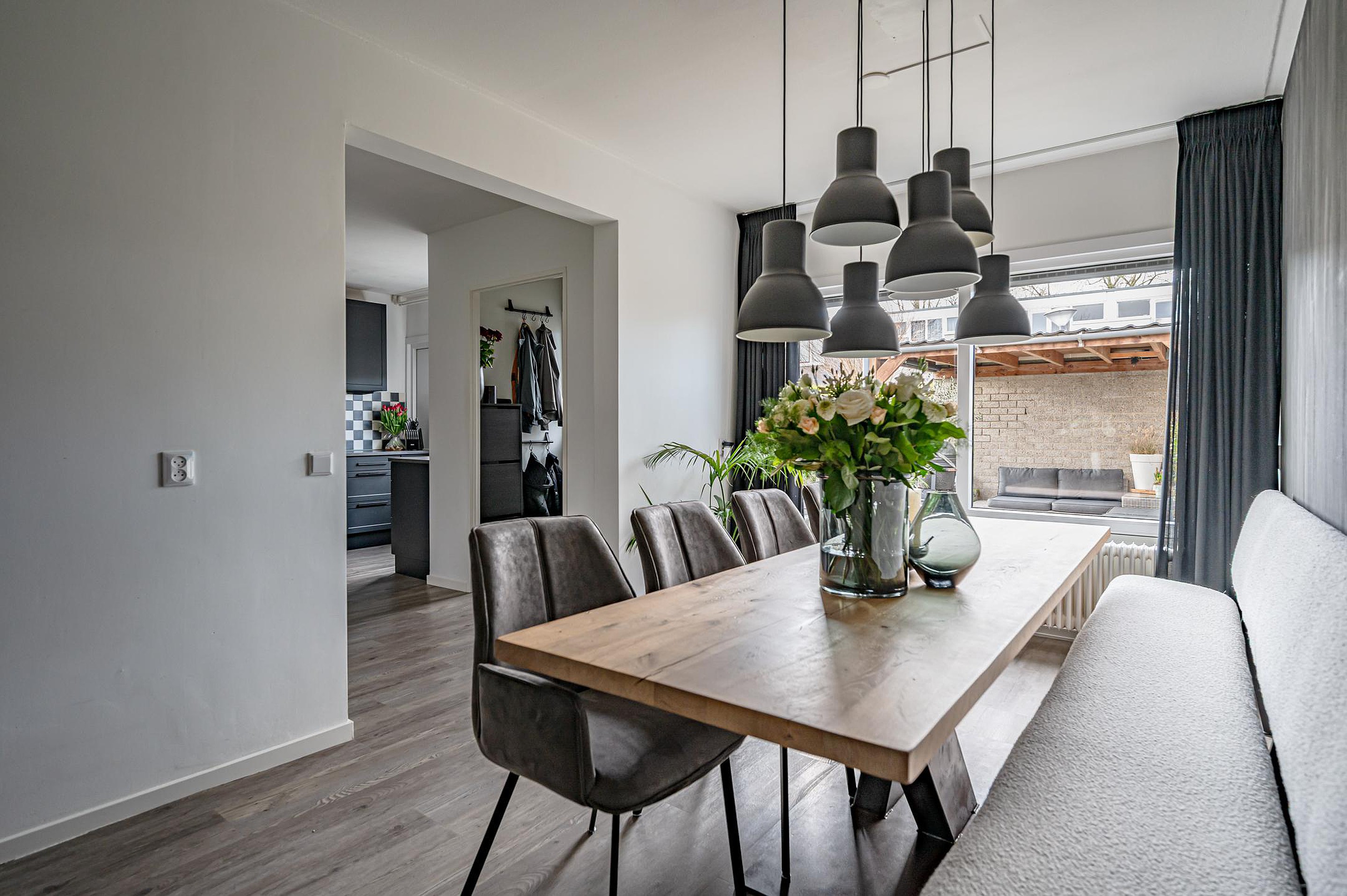 Aan de voorzijde bevindt zich een aparte eetkamer. De halfopen keuken aan de voorzijde is netjes uitgevoerd en voorzien van onder- en bovenkasten, vaatwasser, magnetron en spoelbak. De grote 5-pits gaskookplaat met geïntegreerde oven is ter overname. Vanuit de keuken is er toegang tot een praktische trapkast.