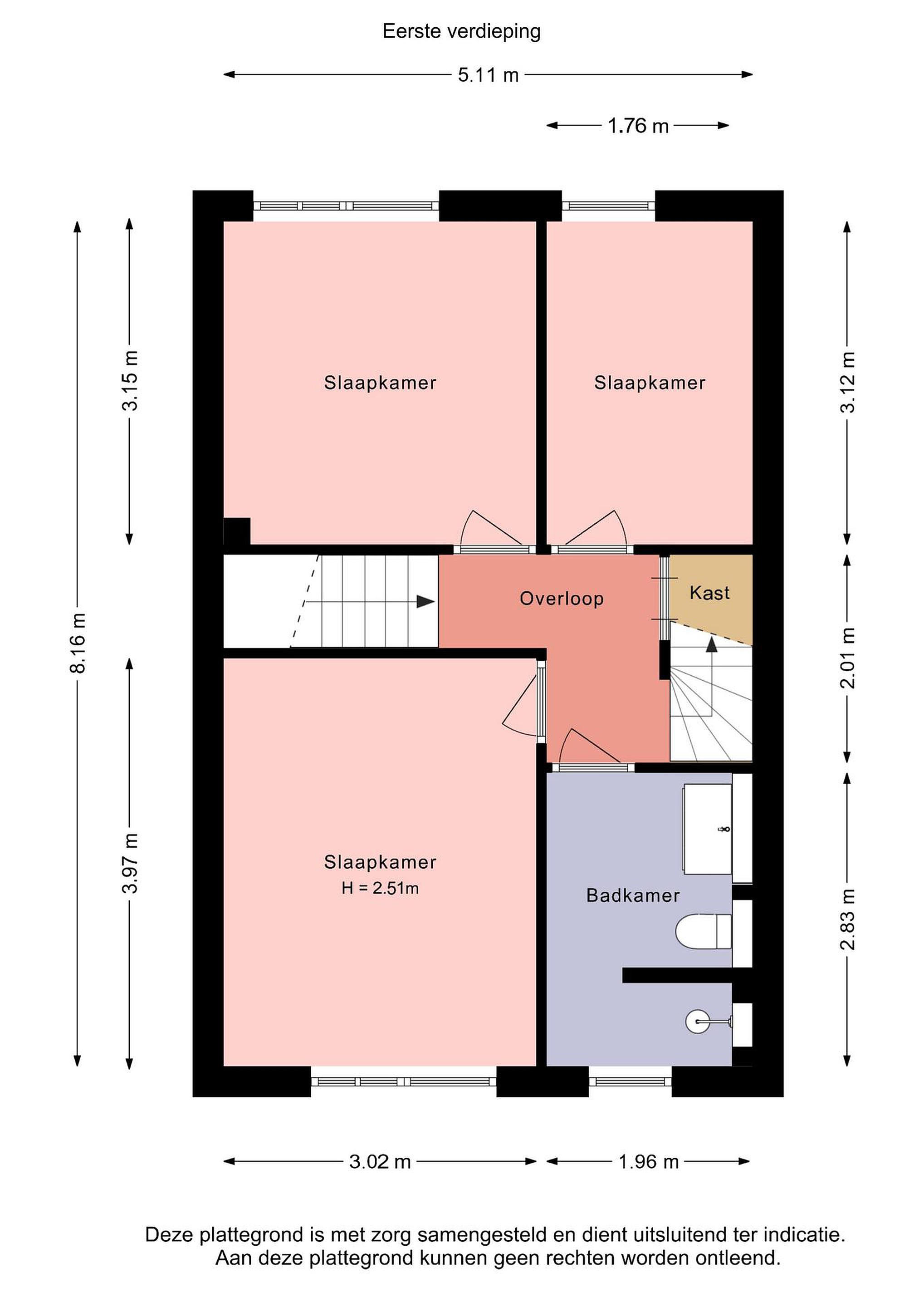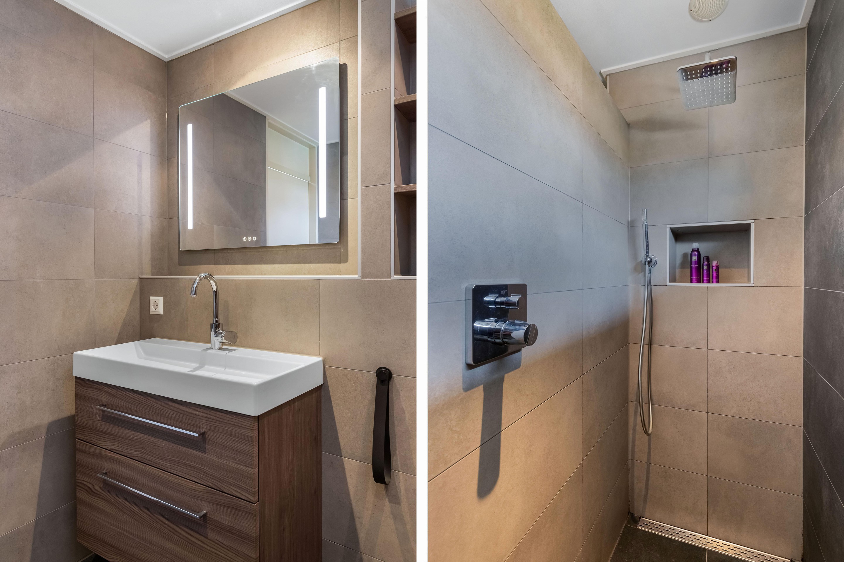 Via de overloop heeft u toegang tot de drie ruime slaapkamers. Op de overloop is ook een ingebouwde kast aanwezig, ideaal als extra bergruimte. De moderne badkamer is het pronkstuk van deze woning. Hij is voorzien van een ruime wastafel, toilet, mechanische ventilatie en inloopdouche. De nisjes in de muur brengen extra sfeer en bergruimte met zich mee.