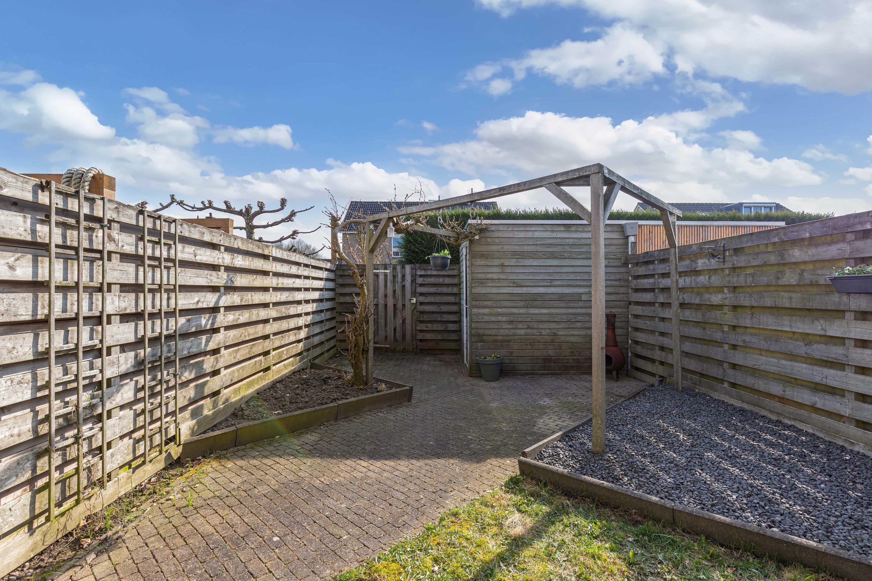 De achtertuin ligt op het zuiden, ideaal voor de echte zonliefhebber. Voor wie liever in de schaduw zit is er zonwering aan de gevel aangebracht. Deze is net zo breed als de tuin. De achtertuin is fraai aangelegd met ruimte voor groen, maar toch ook onderhoudsvrij. Er staat ook een pergola in de tuin.