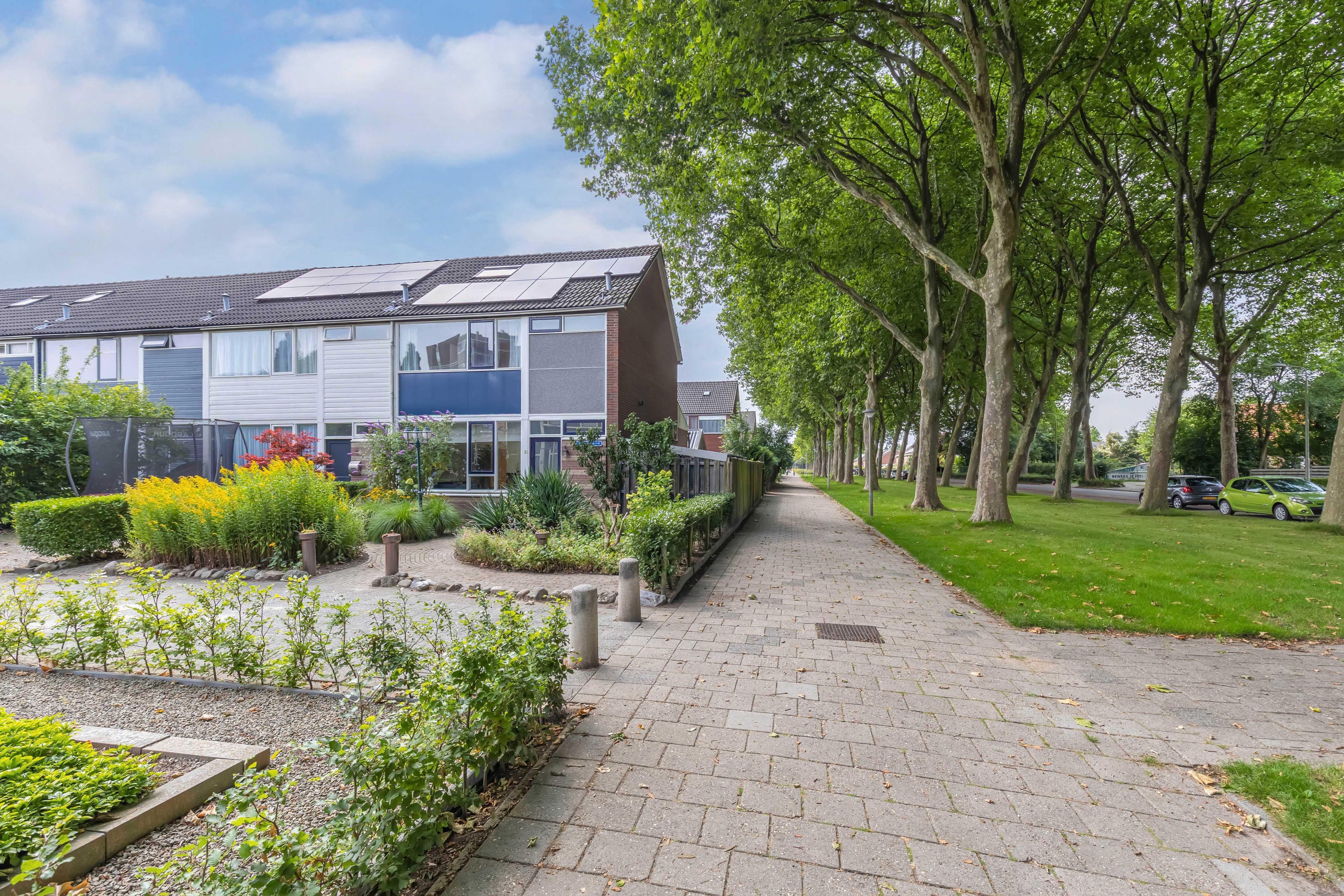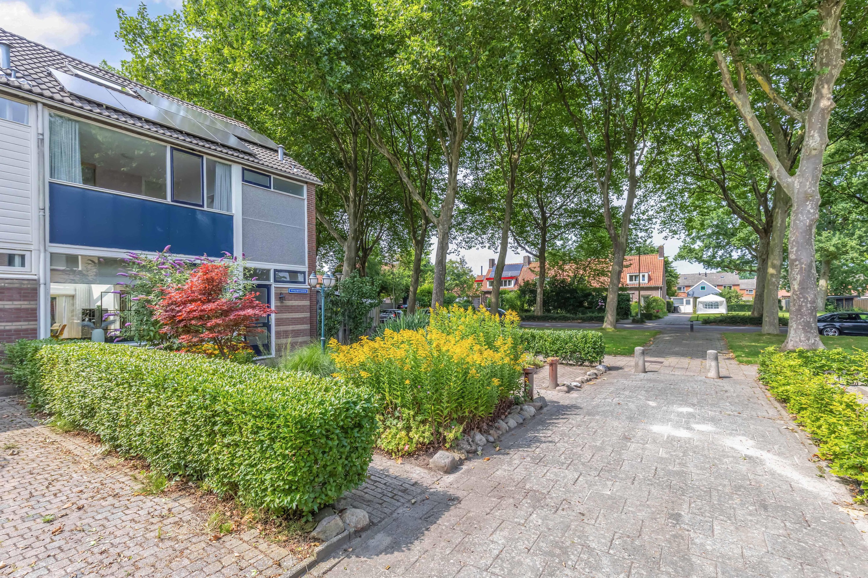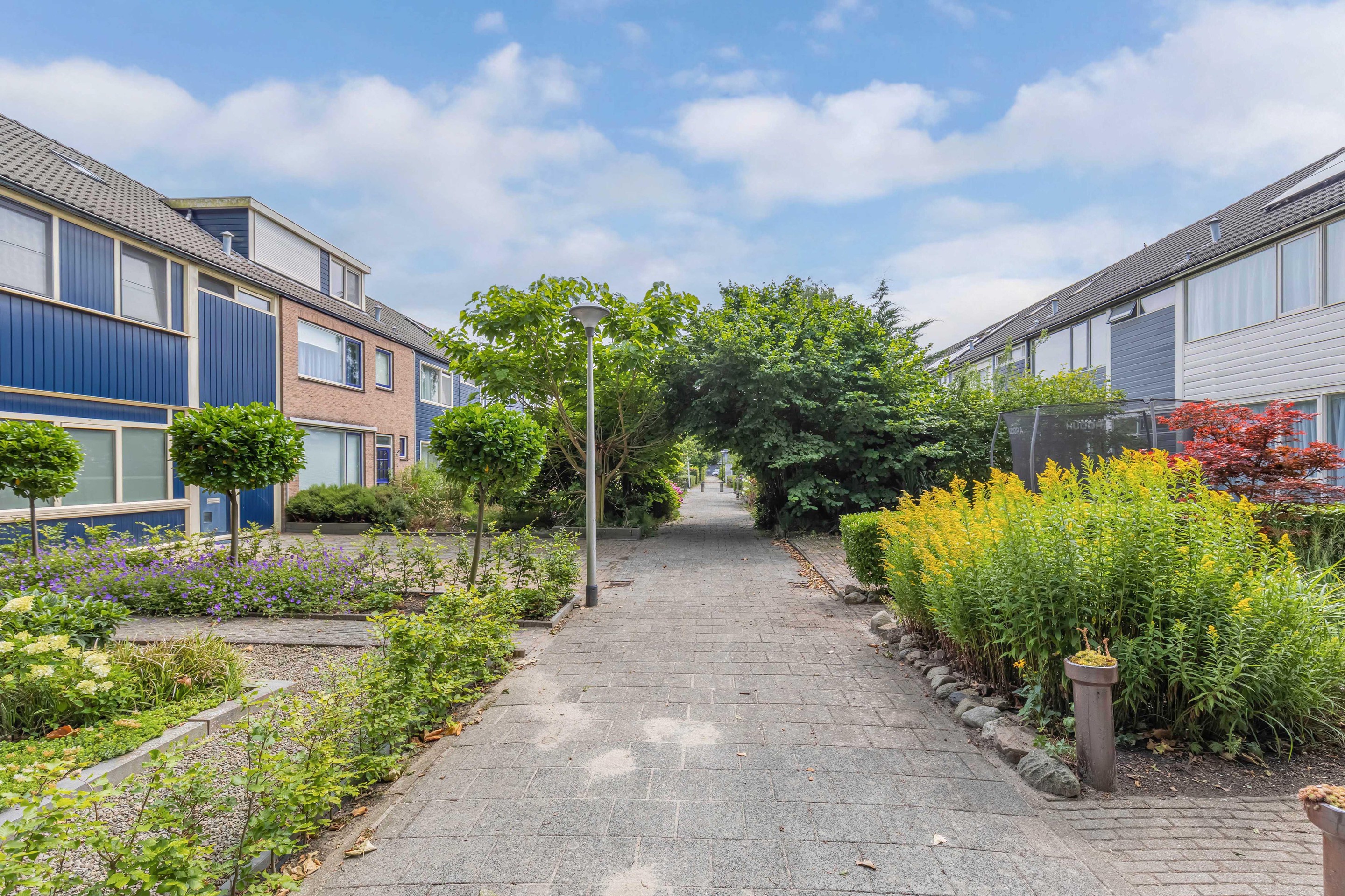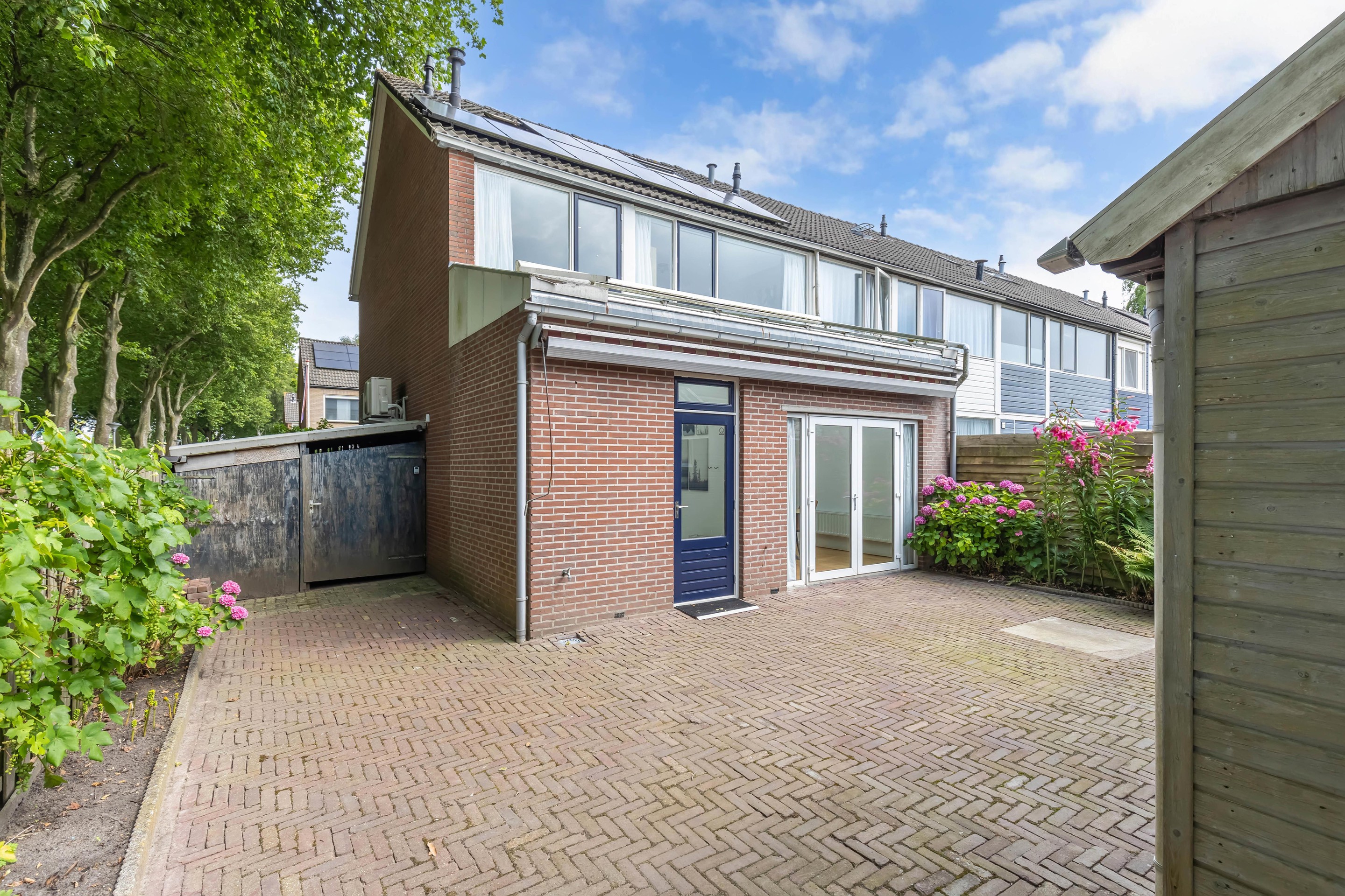 De besloten achtertuin op het westen biedt veel privacy en heeft een achterom. Achterin staat een vrijstaande houten berging. Aan de voorzijde ligt een nette voortuin. Aan de zijkant van de woning is een breed wandelpad met groen met veel bomen.