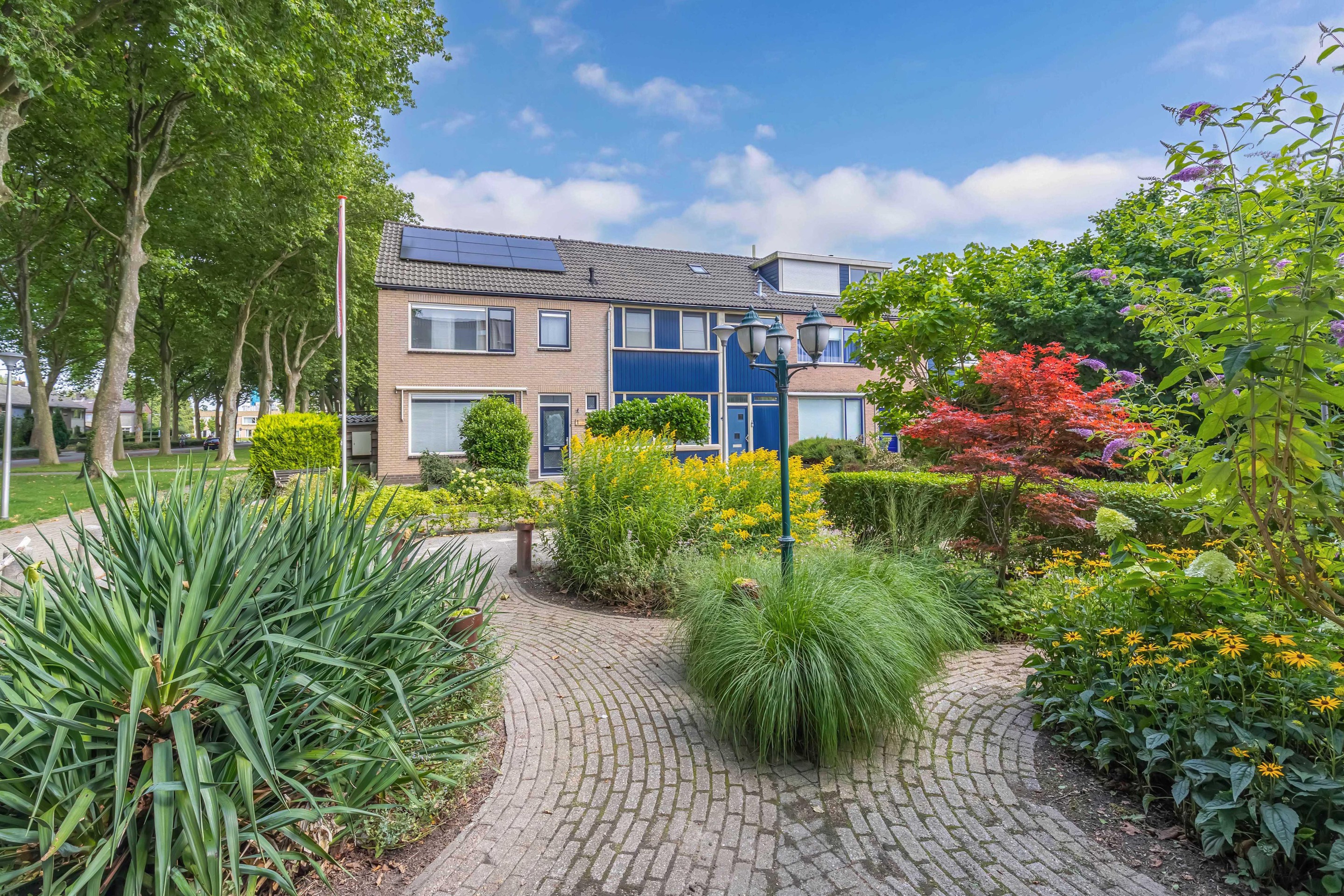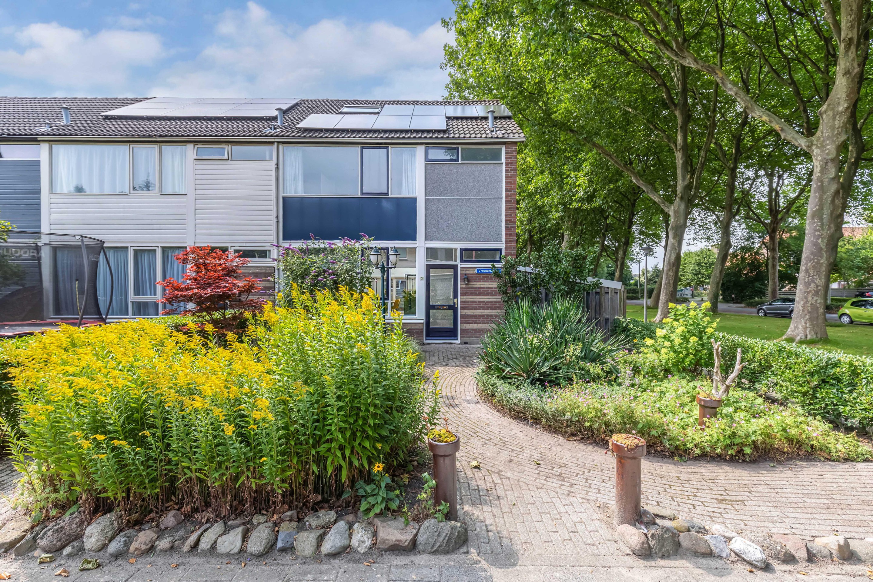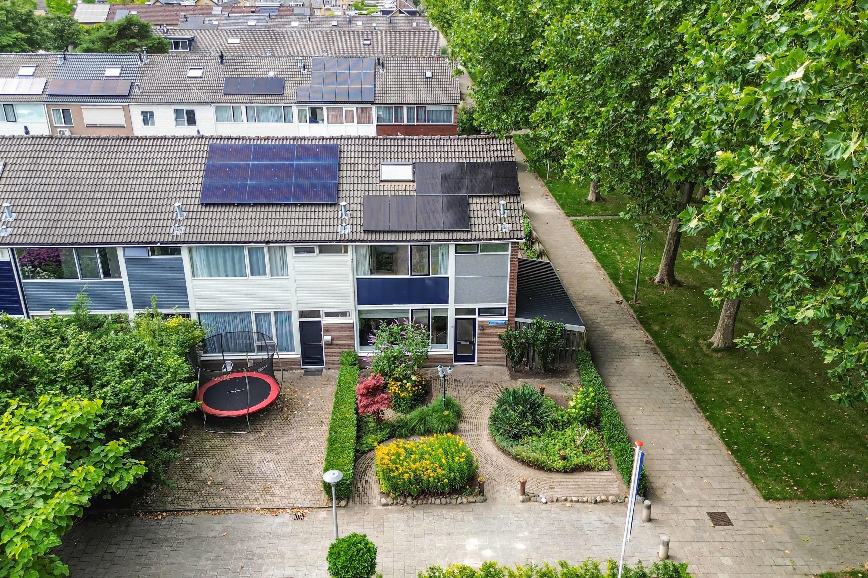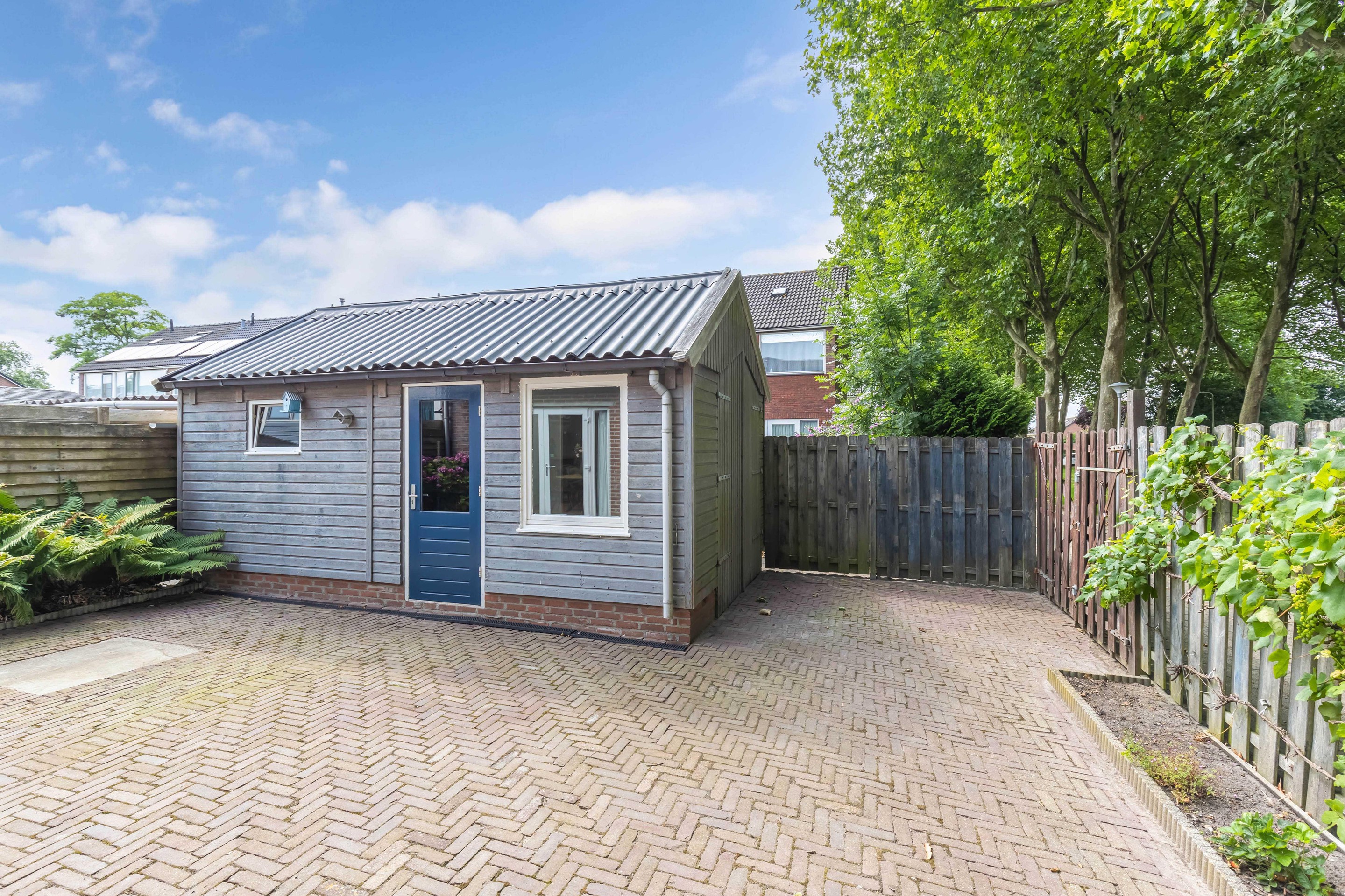 De besloten achtertuin op het westen biedt veel privacy en heeft een achterom. Achterin staat een vrijstaande houten berging. Aan de voorzijde ligt een nette voortuin. Aan de zijkant van de woning is een breed wandelpad met groen met veel bomen.