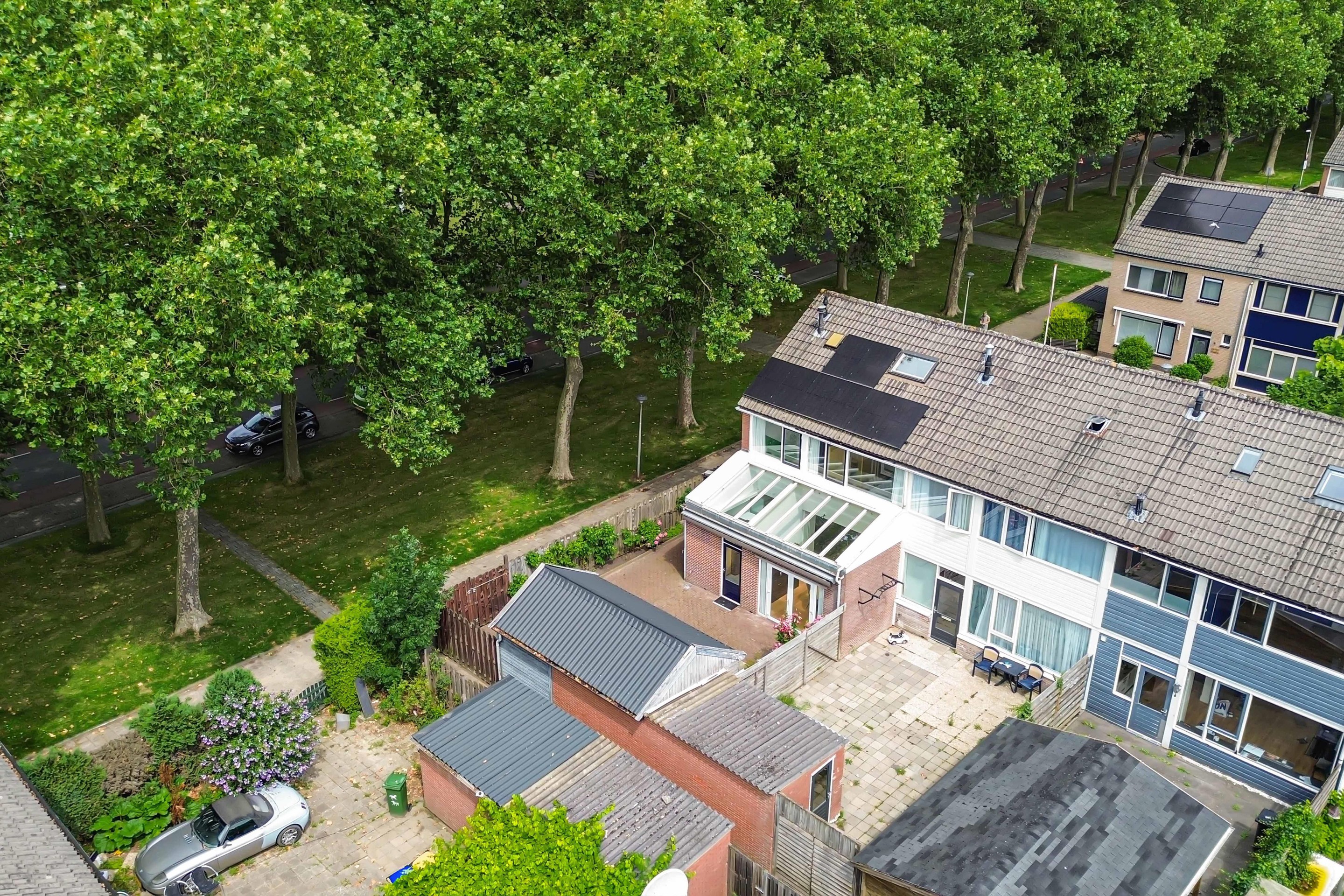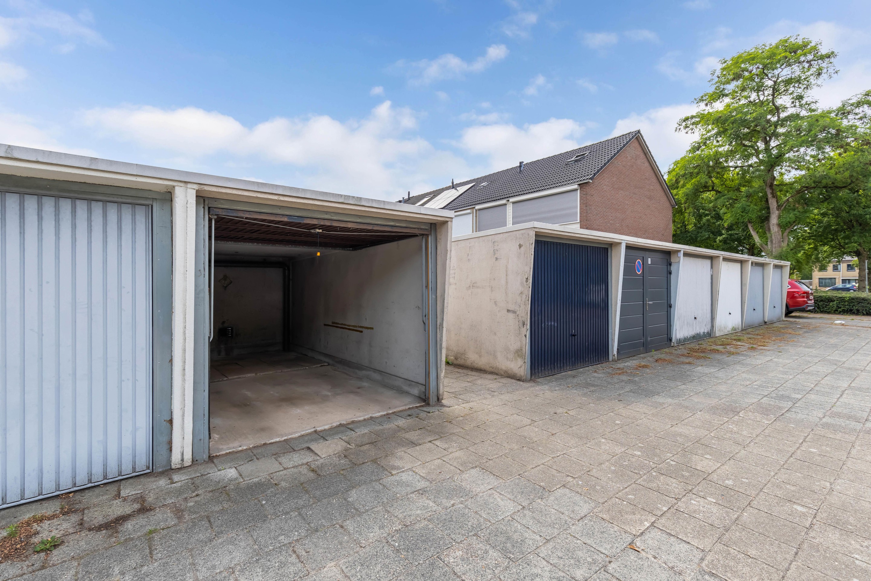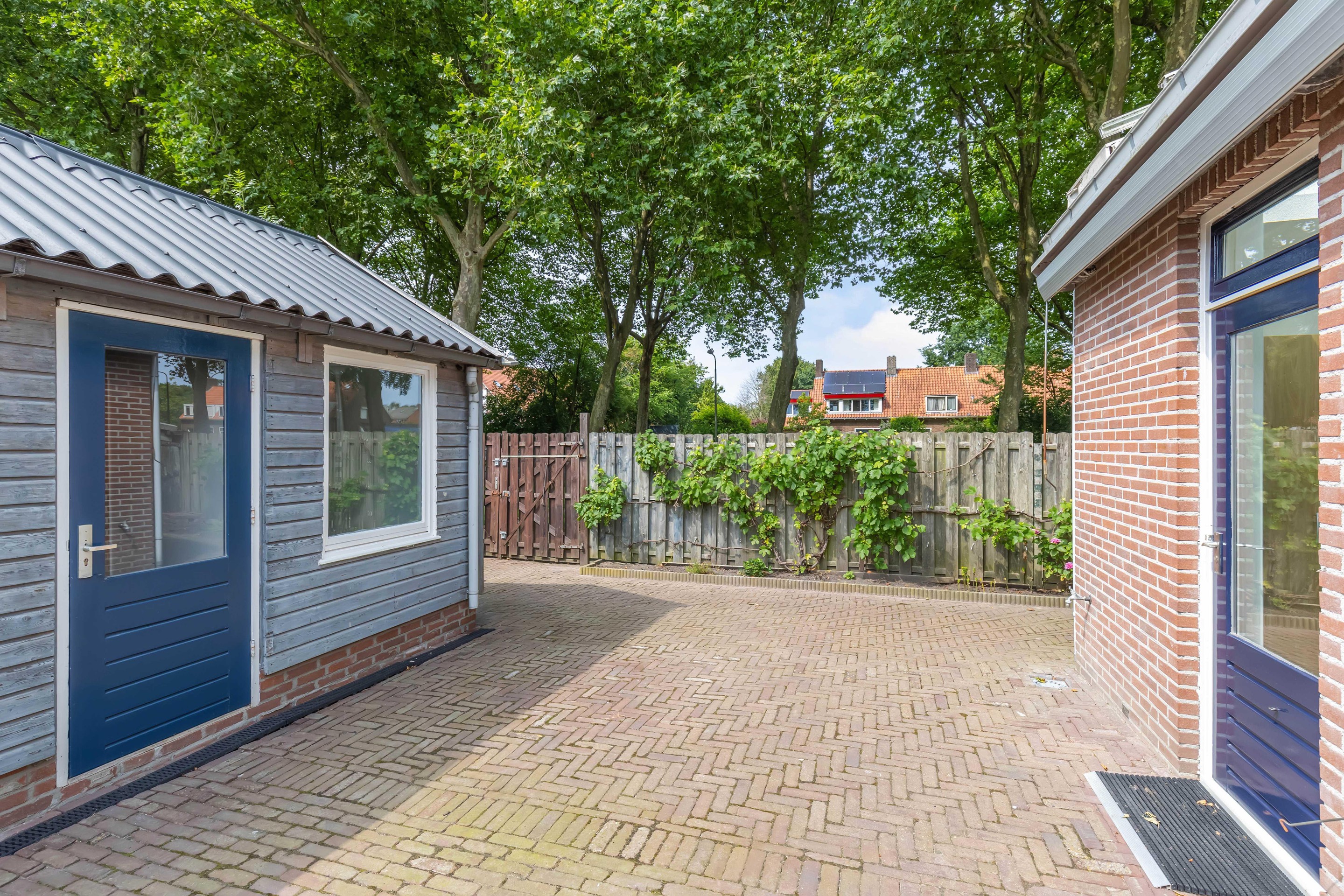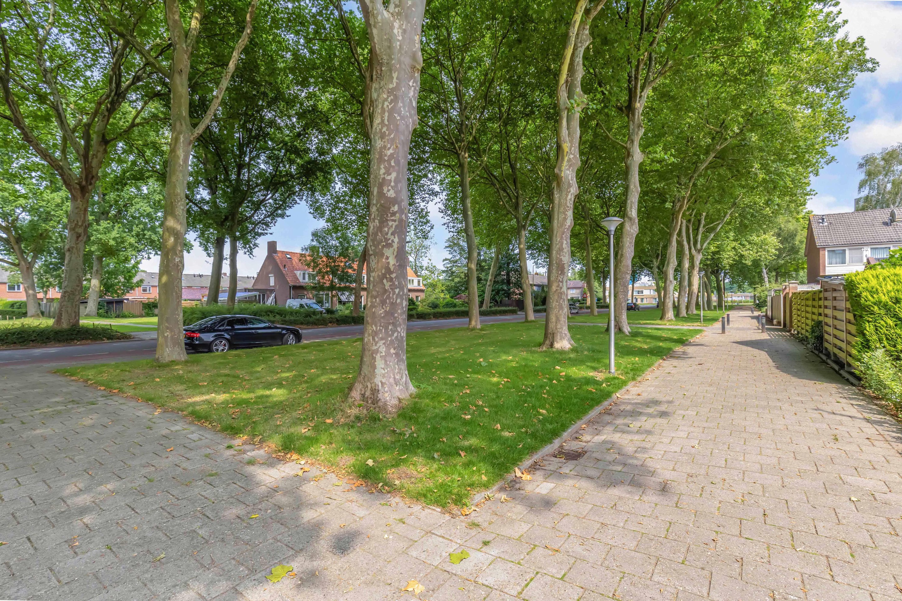 De besloten achtertuin op het westen biedt veel privacy en heeft een achterom. Achterin staat een vrijstaande houten berging. Aan de voorzijde ligt een nette voortuin. Aan de zijkant van de woning is een breed wandelpad met groen met veel bomen.