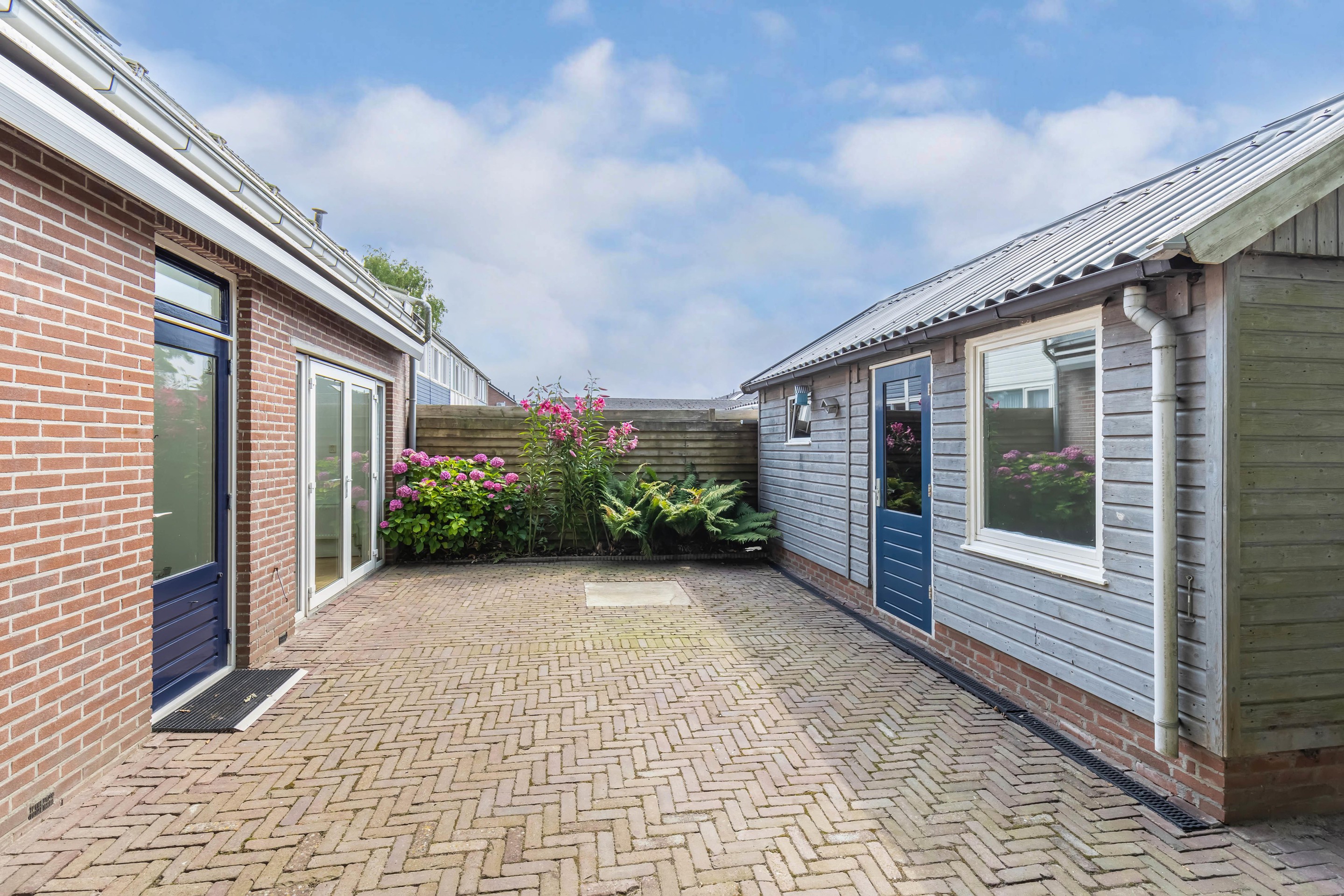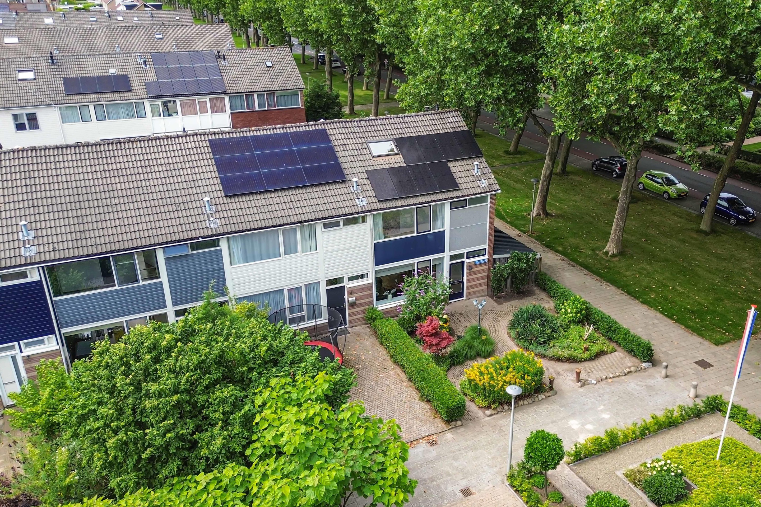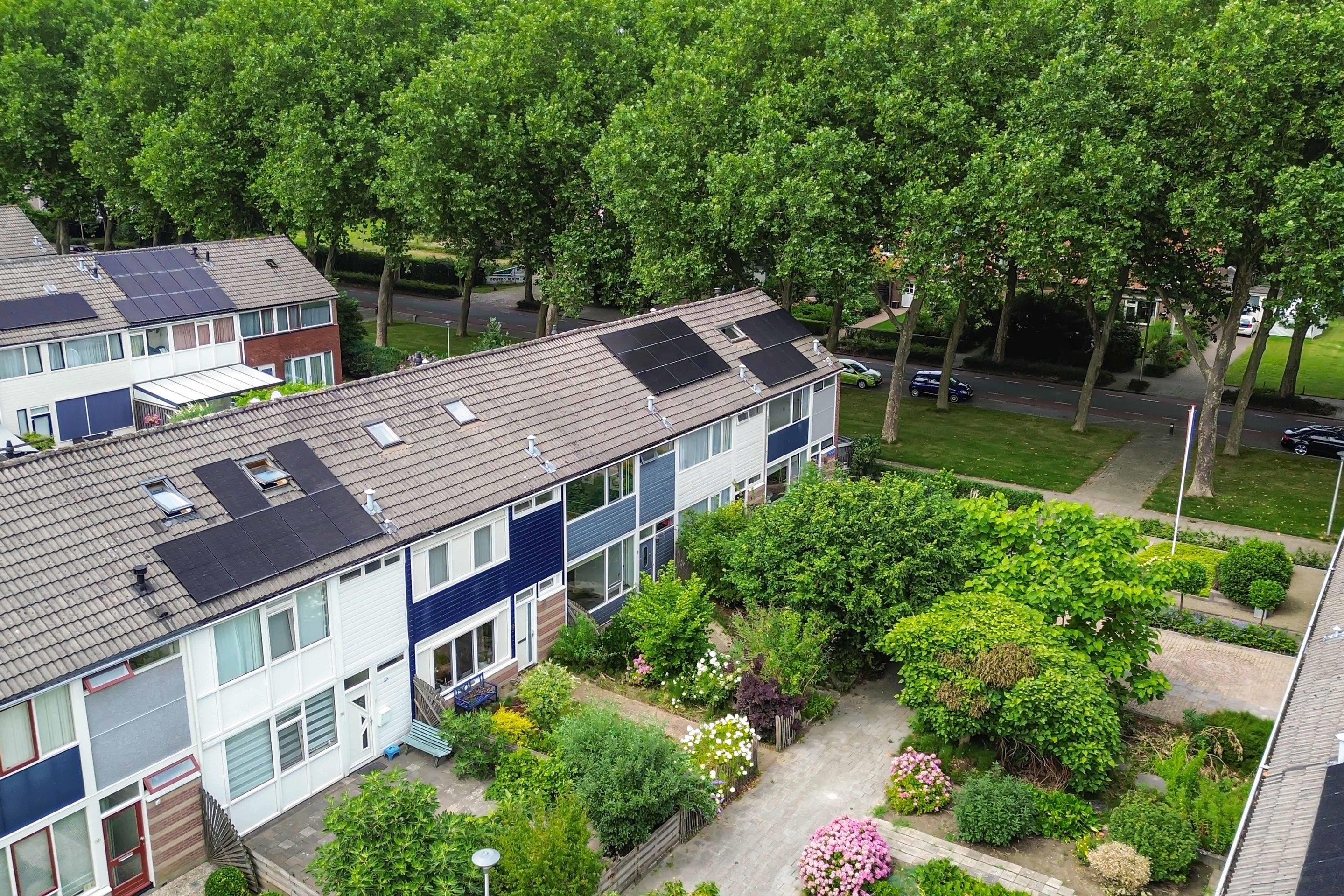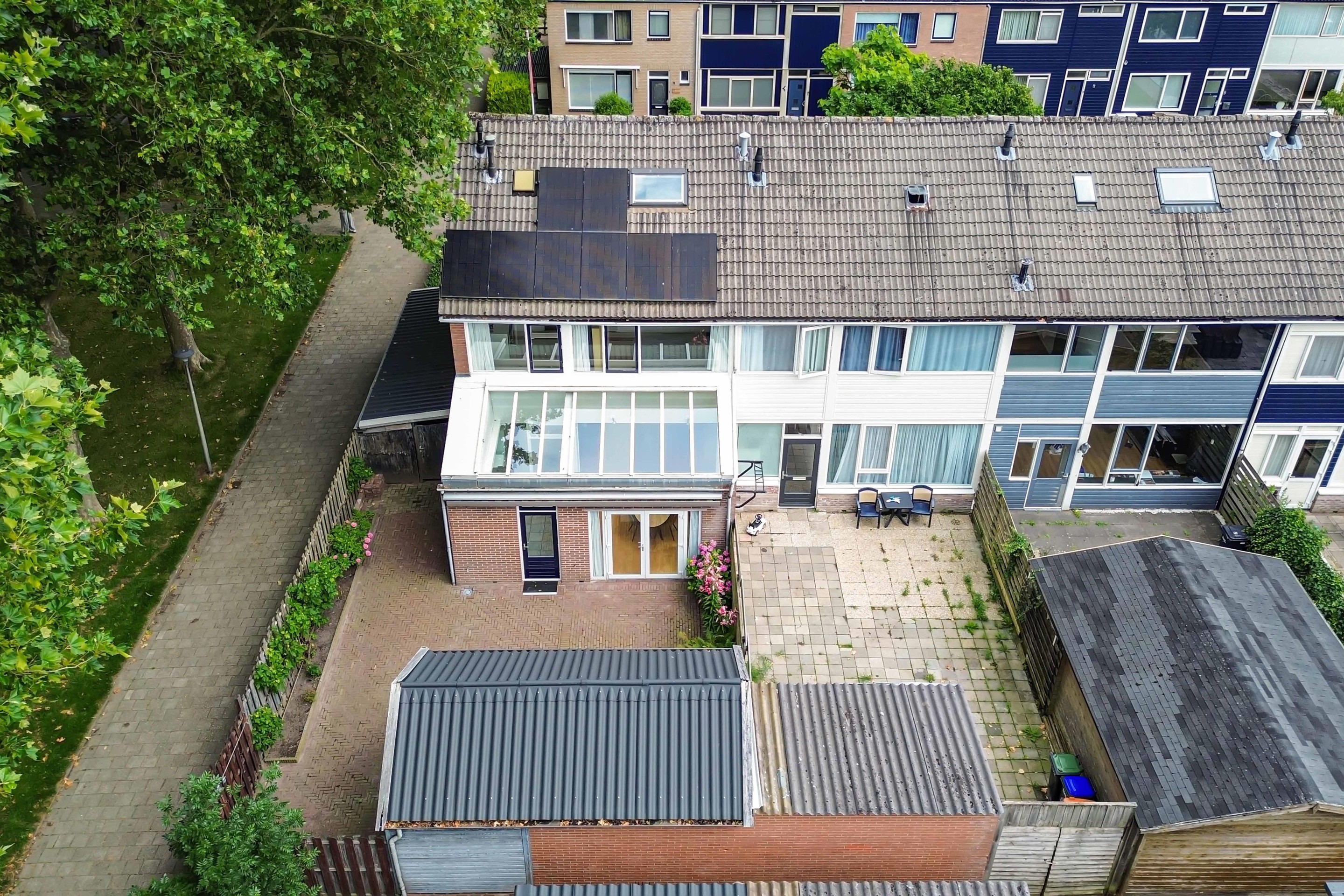 De besloten achtertuin op het westen biedt veel privacy en heeft een achterom. Achterin staat een vrijstaande houten berging. Aan de voorzijde ligt een nette voortuin. Aan de zijkant van de woning is een breed wandelpad met groen met veel bomen.