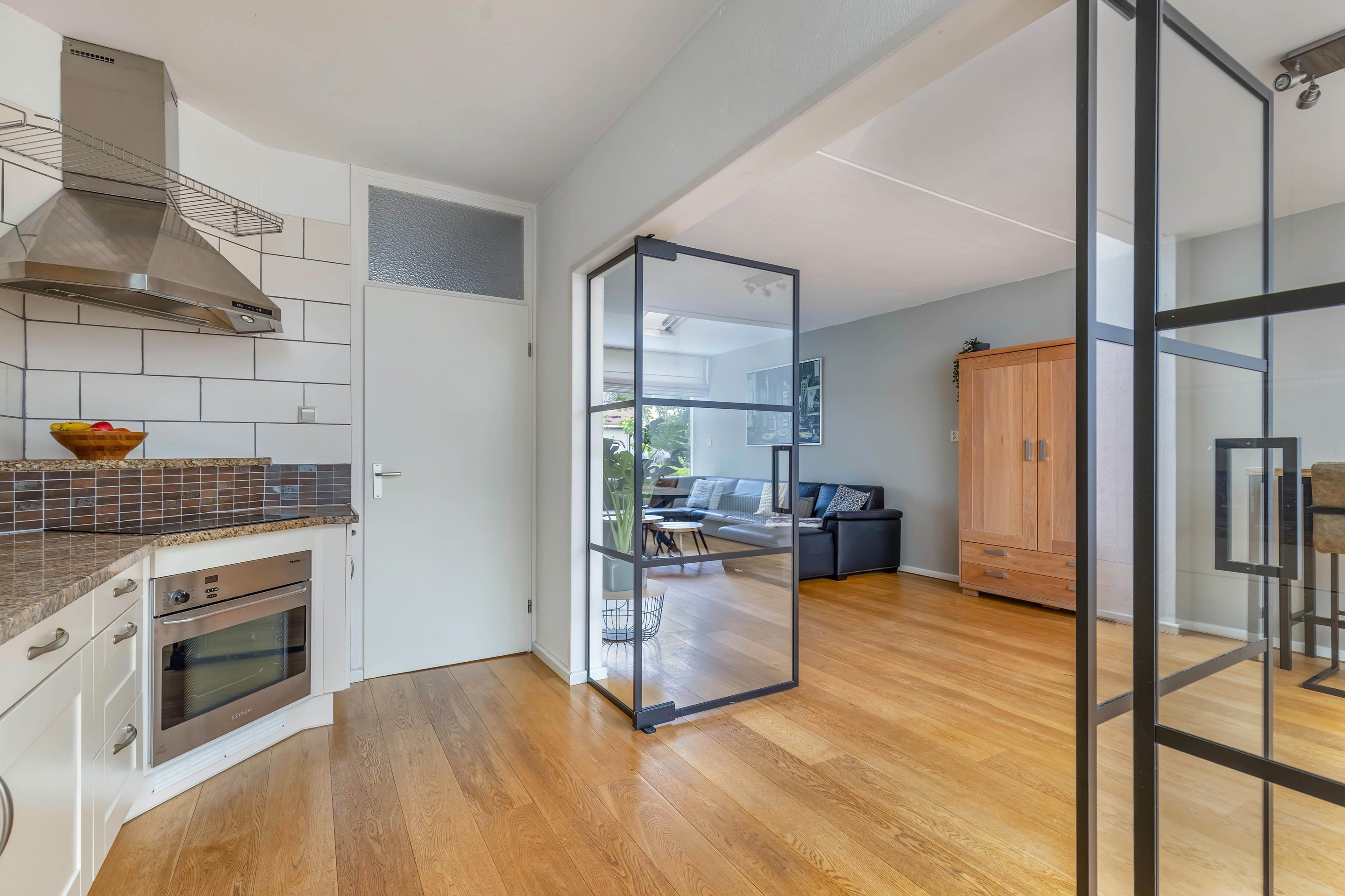 De keuken is afsloten met industriële glazen deuren, wat een moderne en ruimtelijke uitstraling geeft.