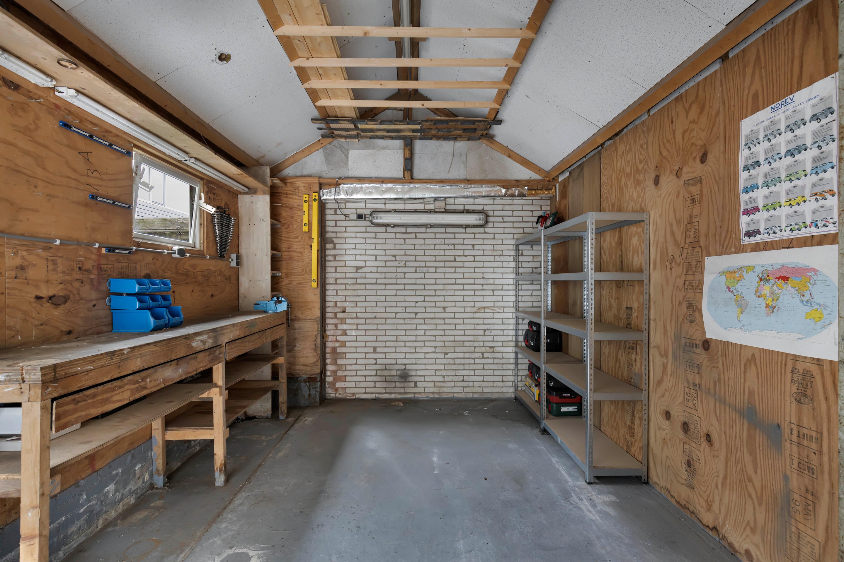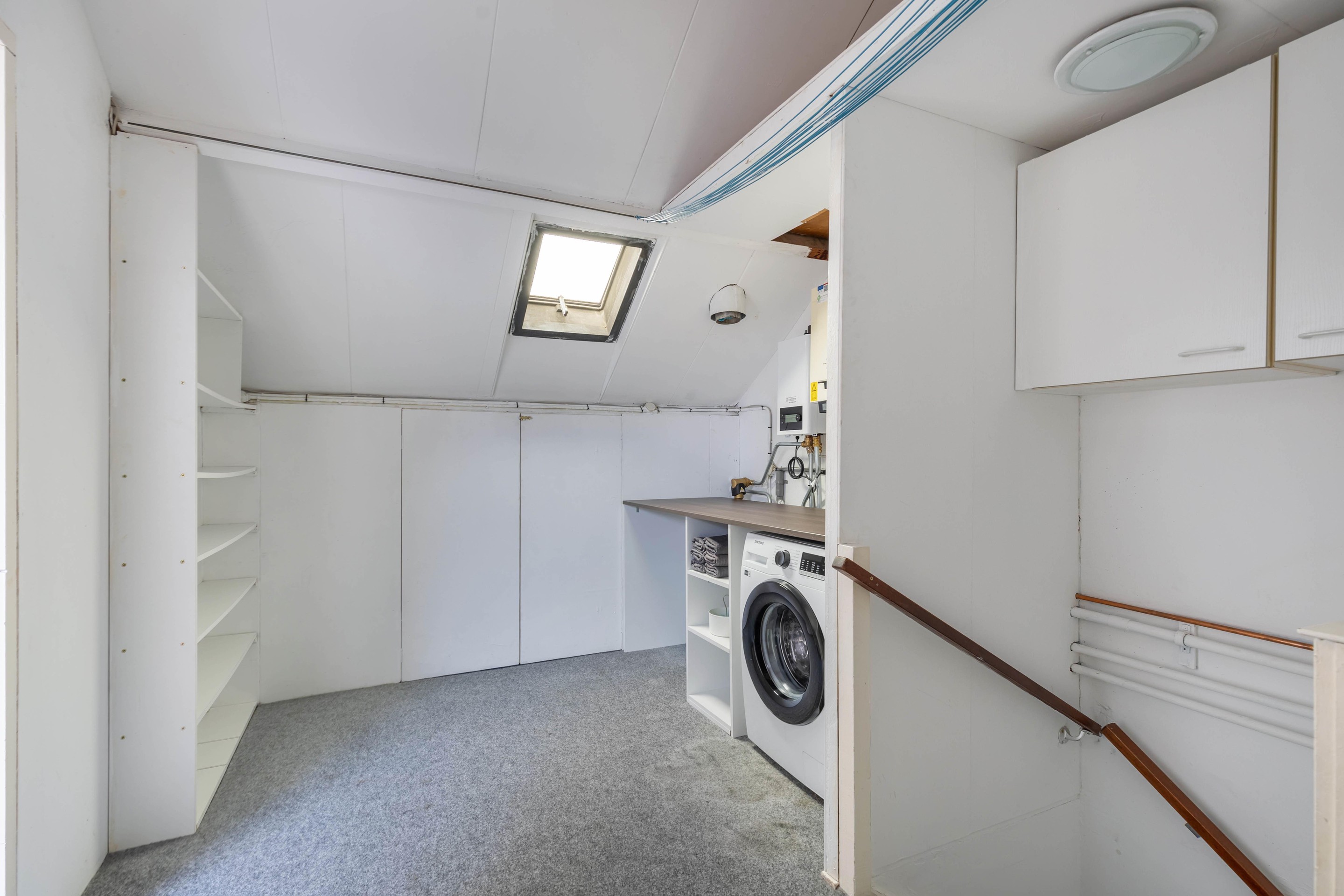 - Voorzolder met hybride warmtepomp, CV (Remeha 2019), wasmachine aansluiting, omvormer en bergruimte achter de knieschotten.