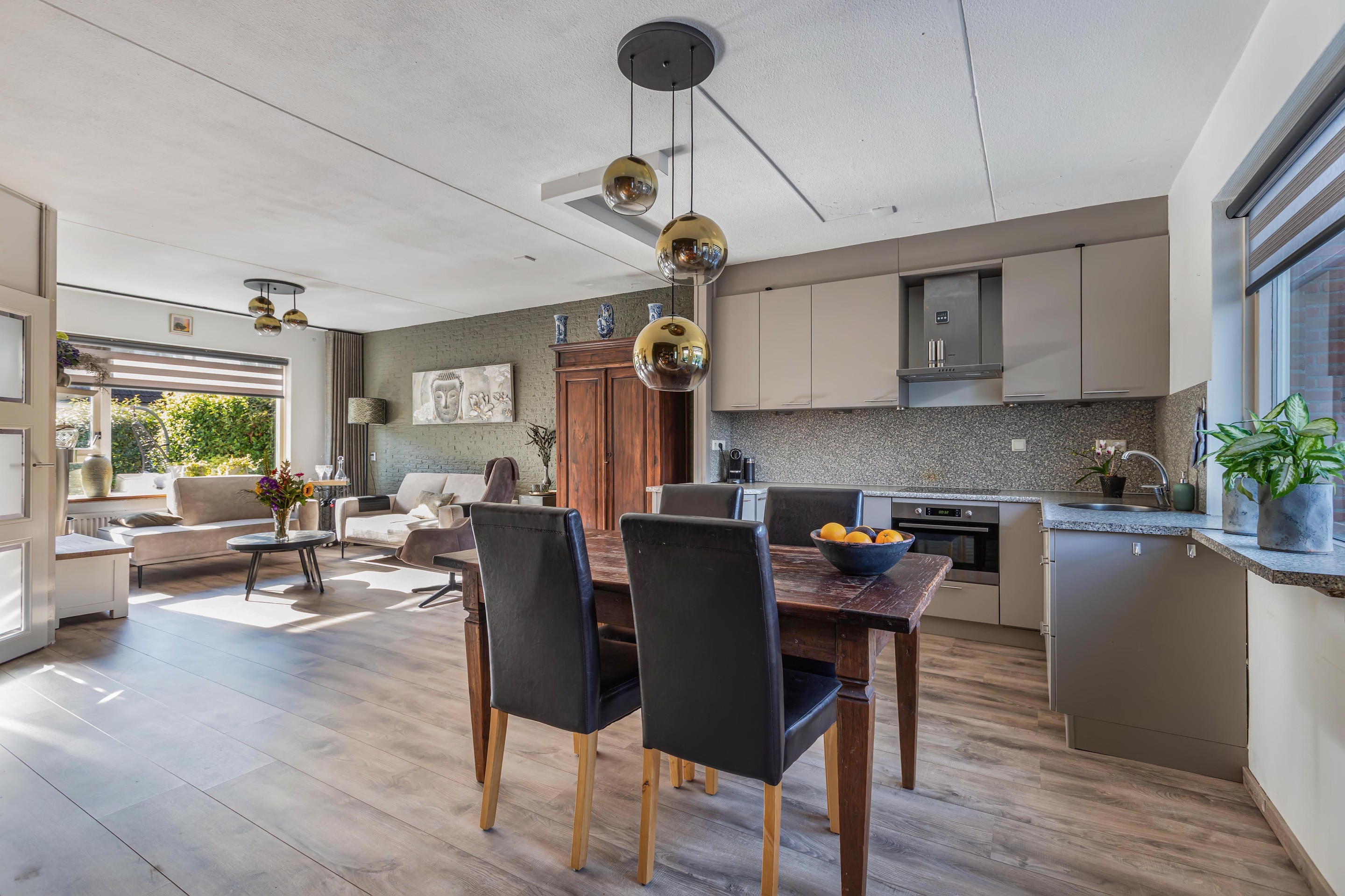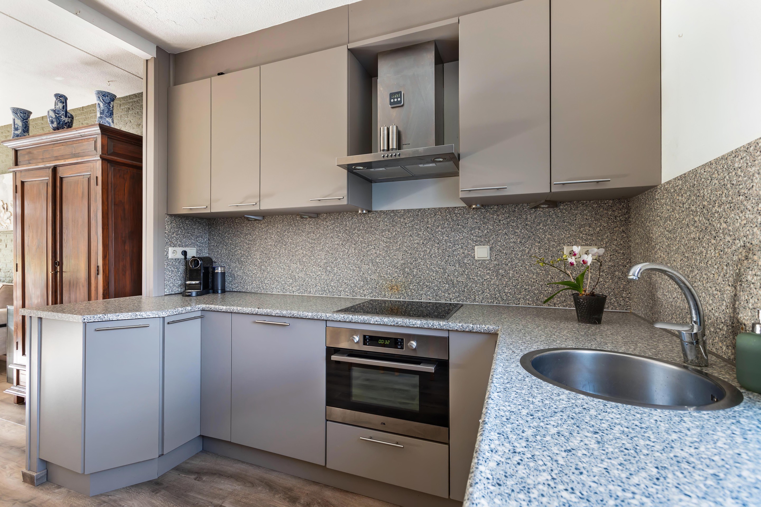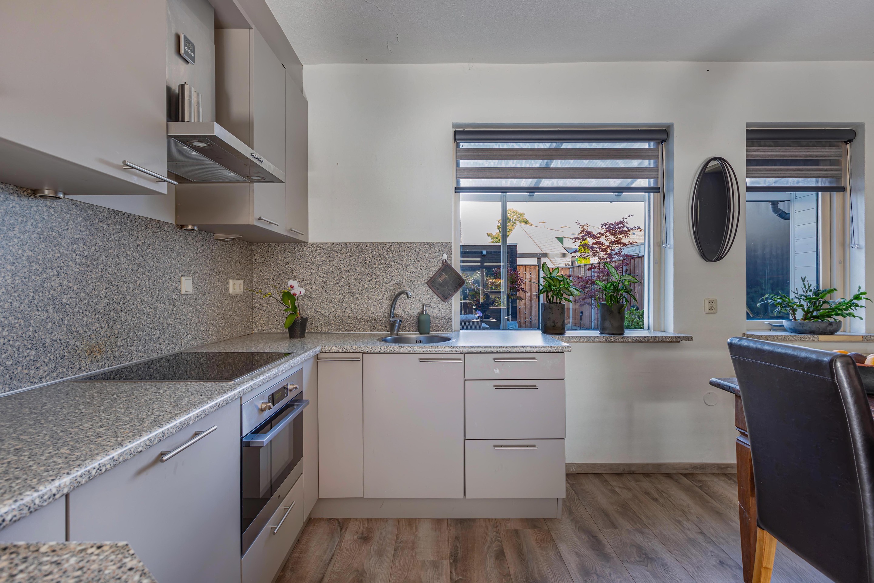 - Open keuken (in 2023 gerenoveerd) met diverse inbouwapparatuur en trapkast.