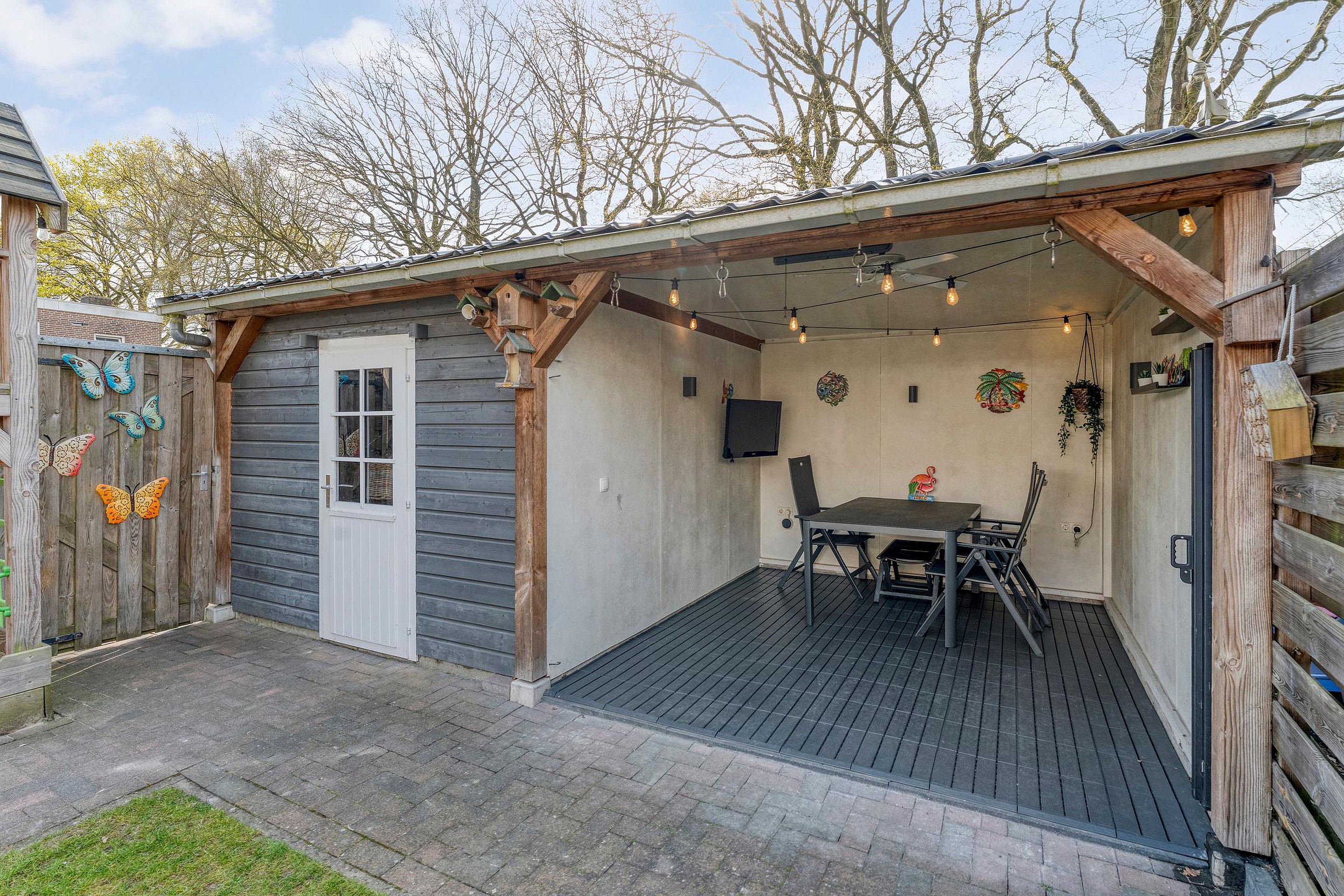 Tuin De tuin is gelegen op het westen. In de tuin bevindt zich een schuurruimte met overkapping. Deze ruimte is makkelijk om te zetten zodat deze kan dienen als garage. De tuin is volledig omheind. De woning heeft aan de achterzijde een eigen oprit. Vanuit de achtertuin heeft u zicht over het parkje. Op enkele meters afstand loopt u zo de 'Emmerdennen' in met leuke wandelroutes en een familiepad.