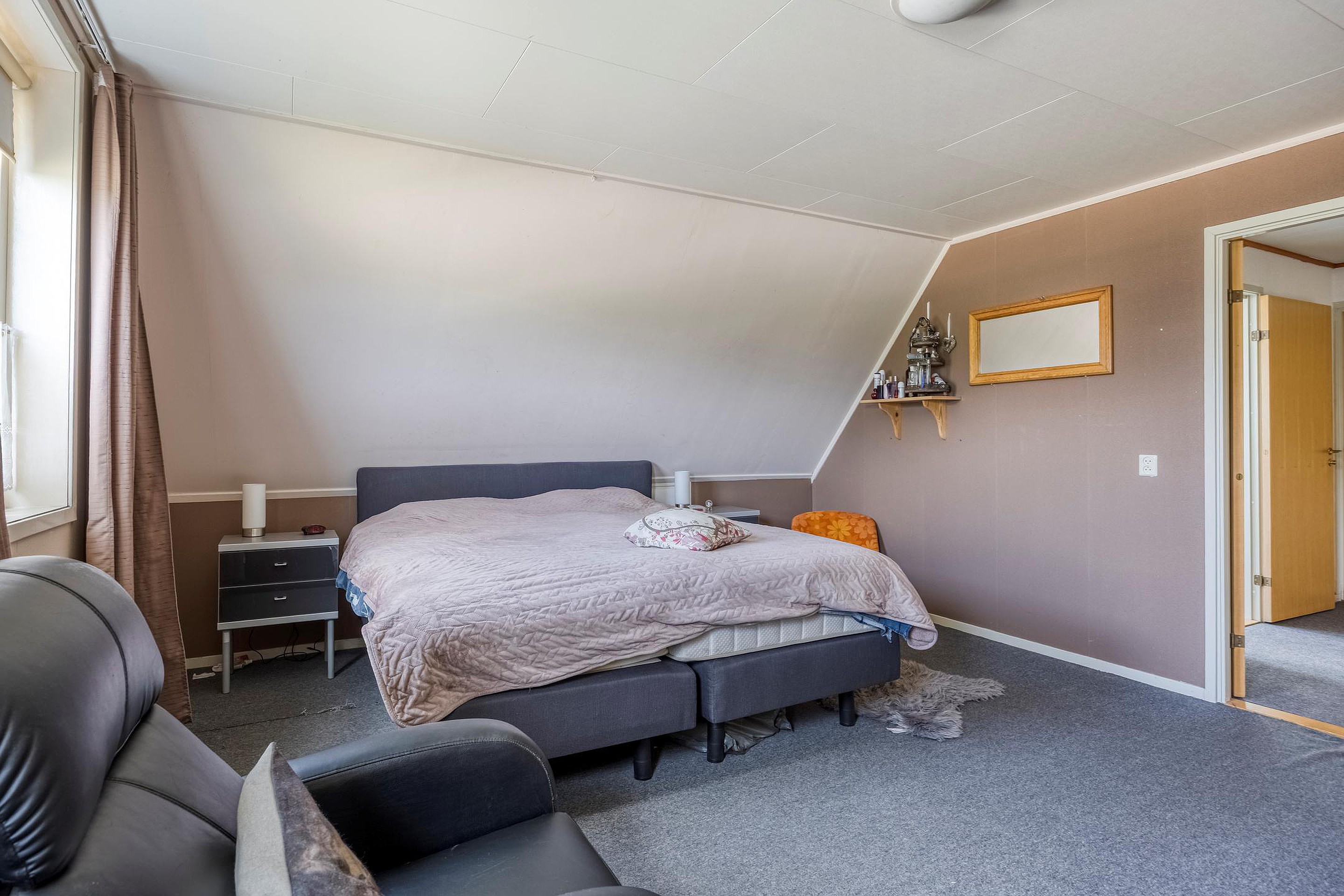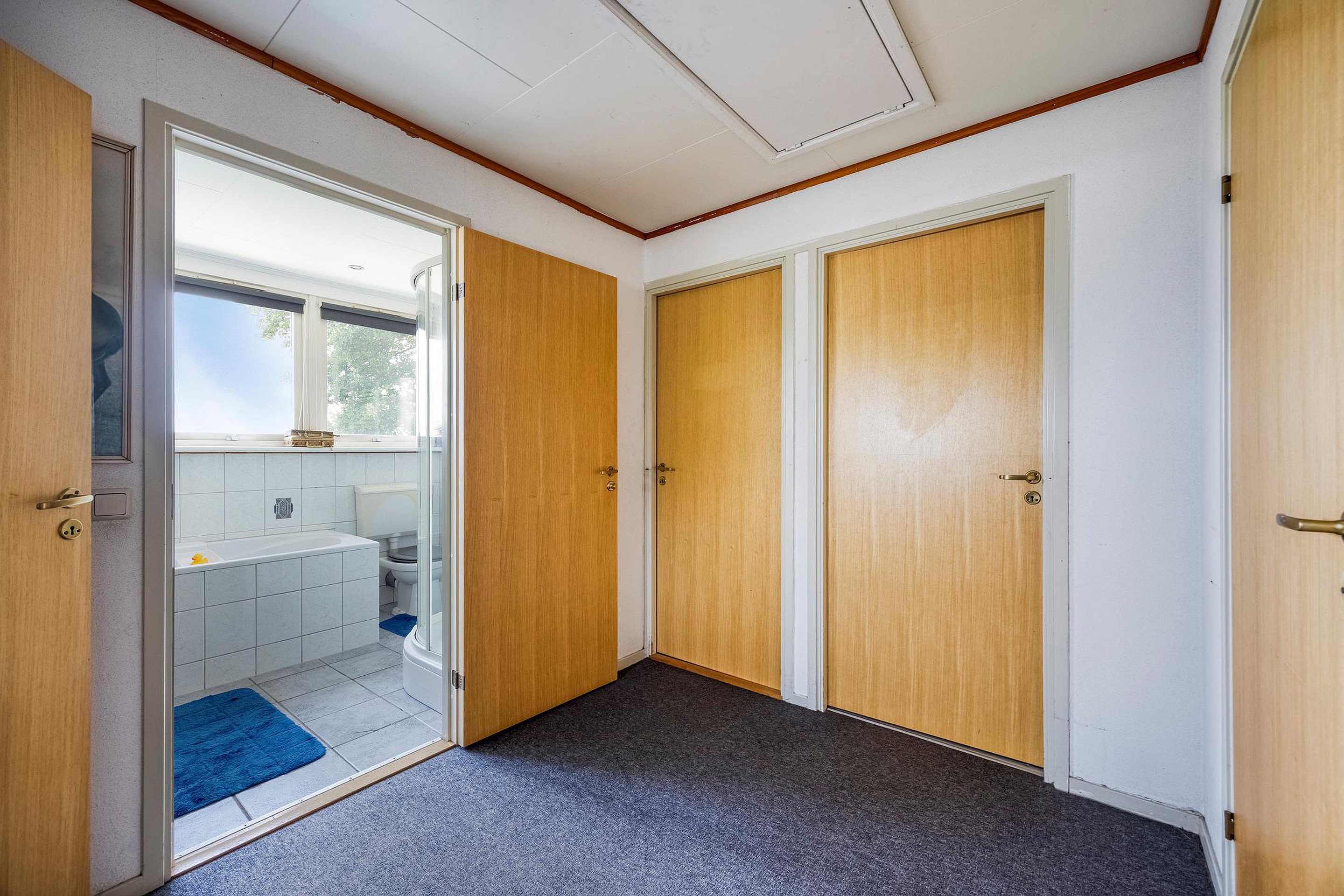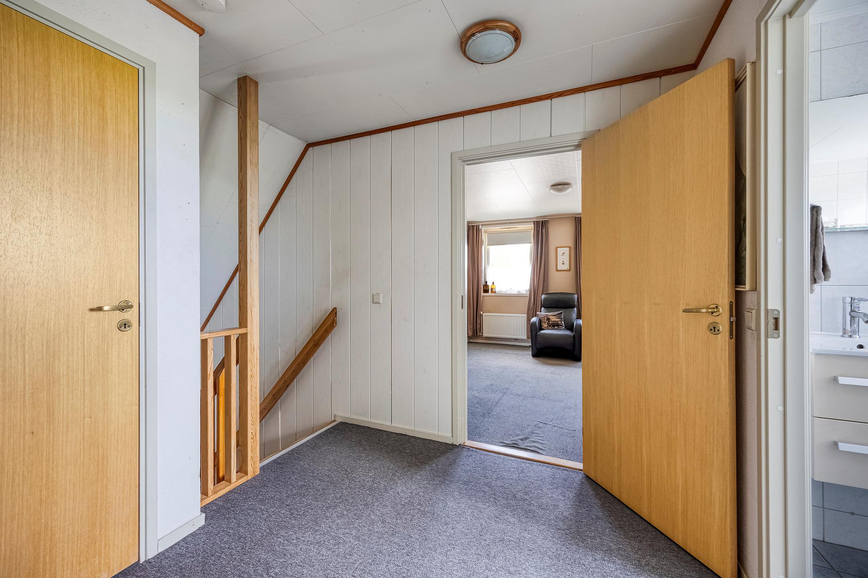 Eerste verdieping Overloop met toegang tot 3 slaapkamers. De master bedroom is voorzien van een vaste kledingkast. Badkamer voorzien van bad, dubbele wastafel en douche. Door de dakkapel voldoende ruimte en uitzicht op de landerijen.