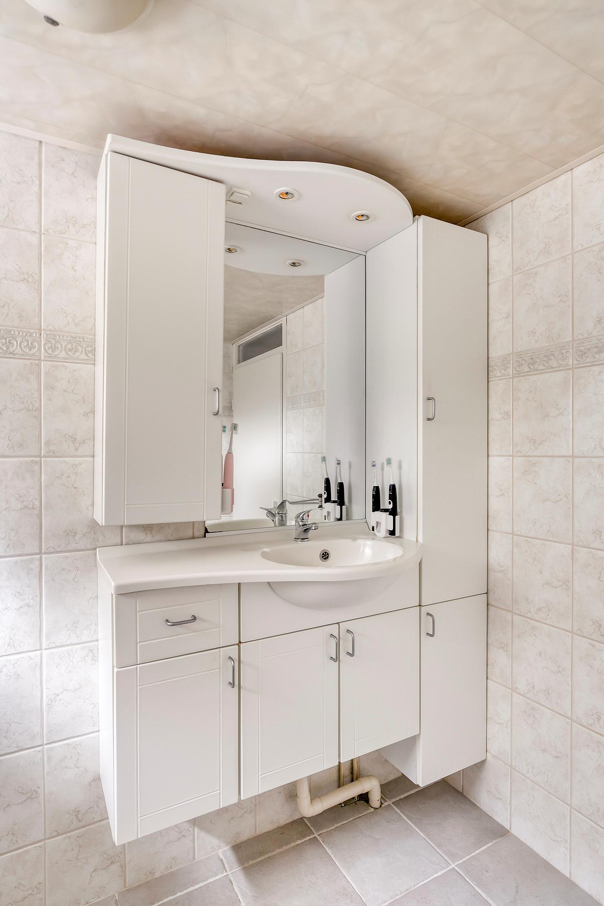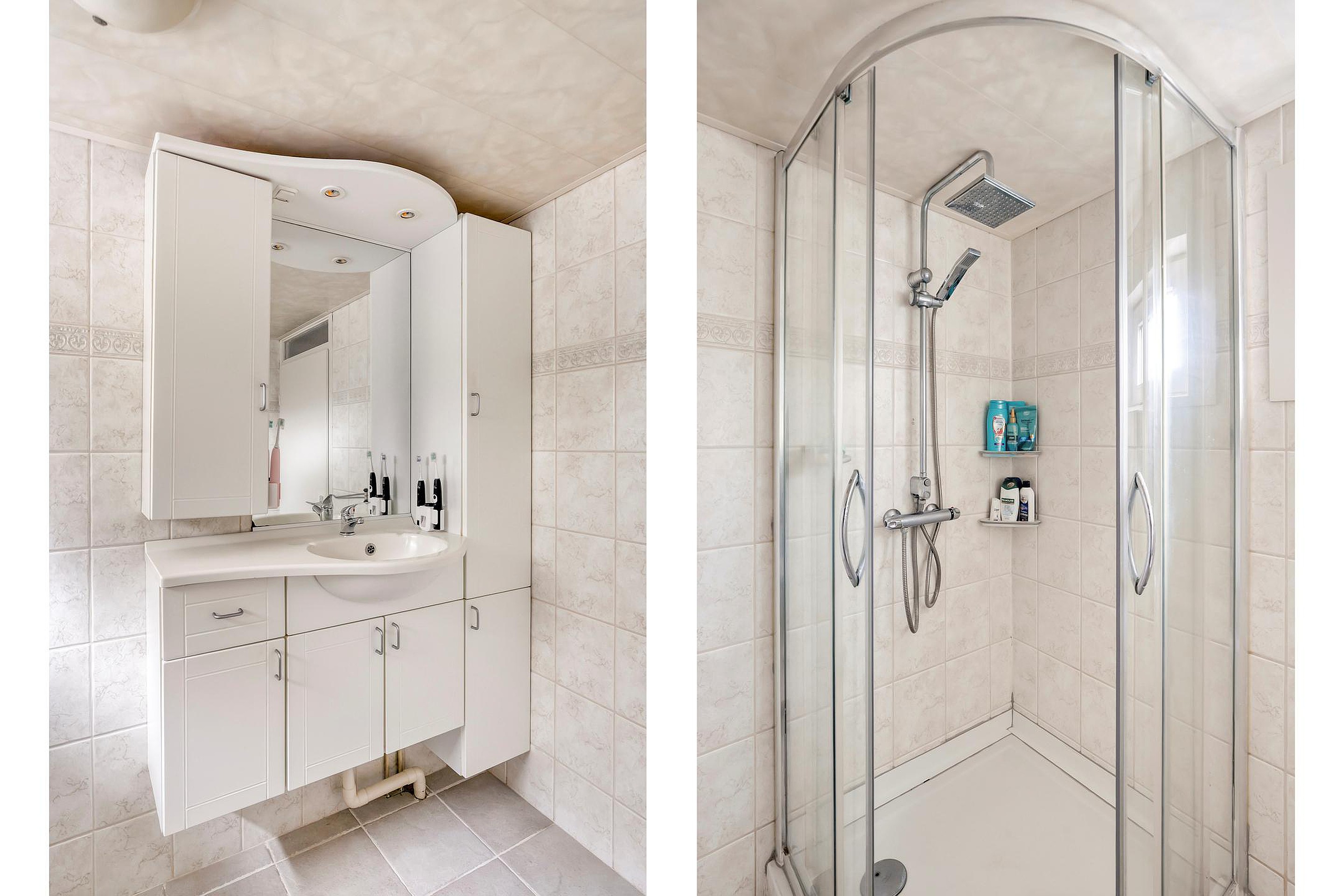 Eerste verdieping Overloop; 3 slaapkamers; badkamer met douchecabine, toilet en wastafel in meubel.