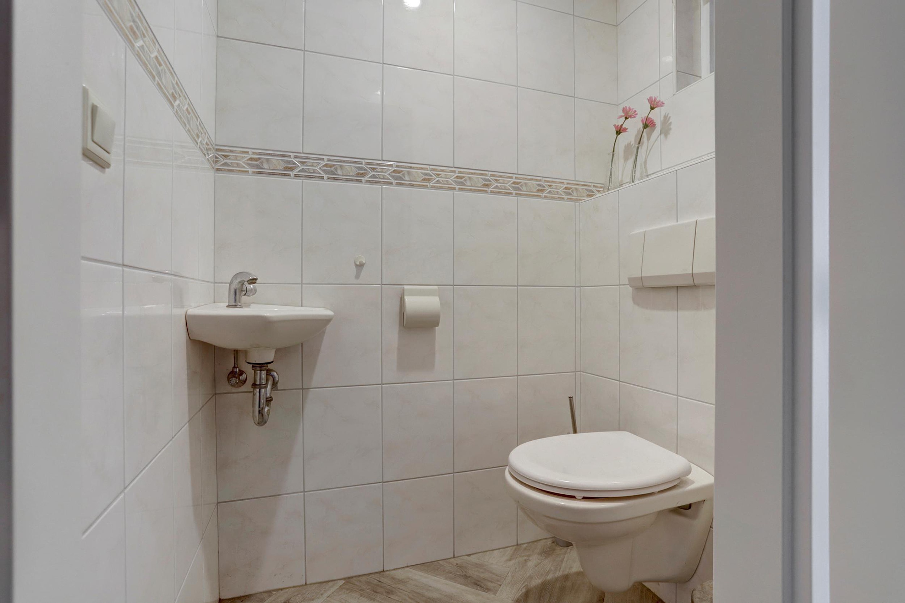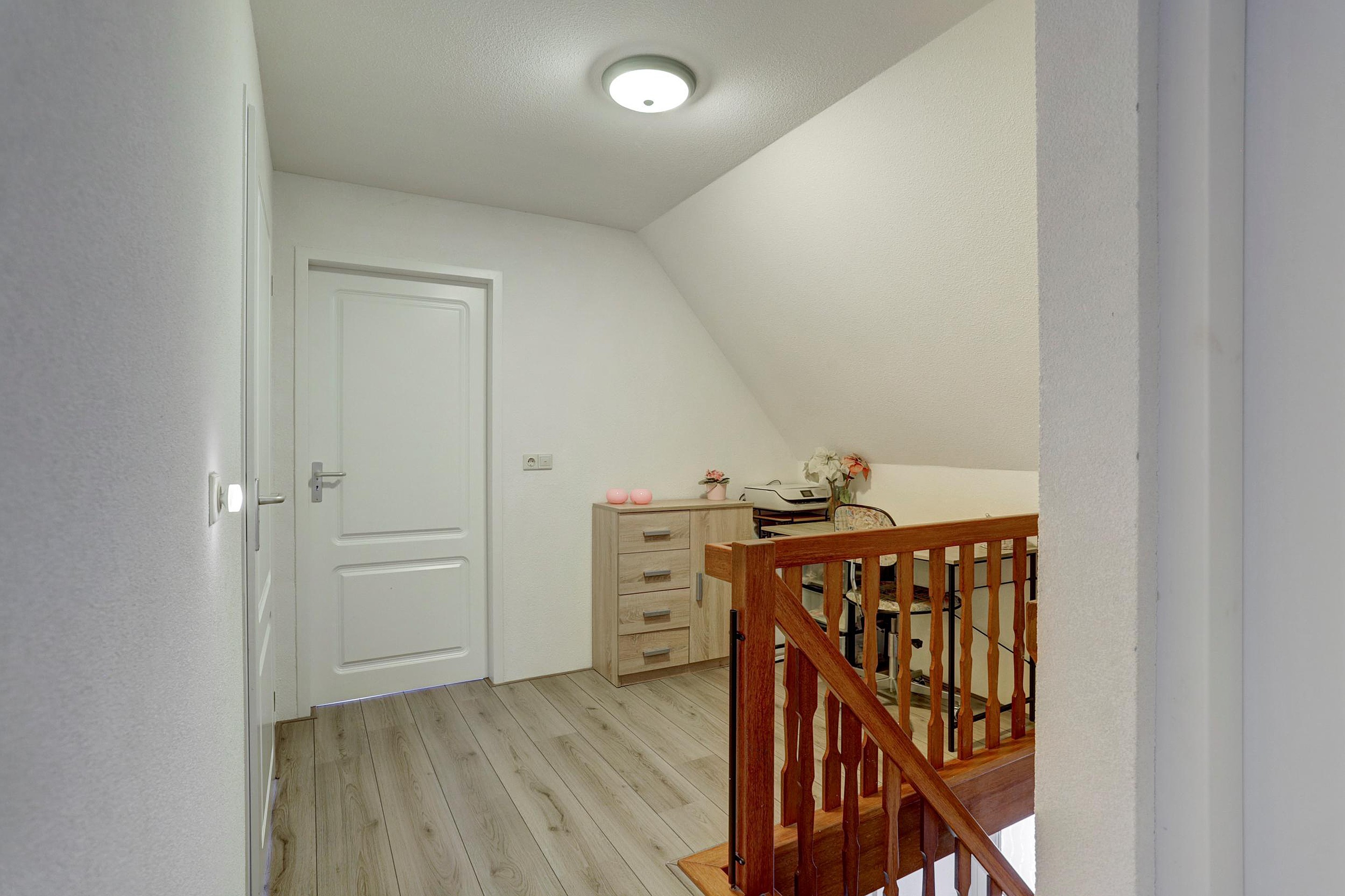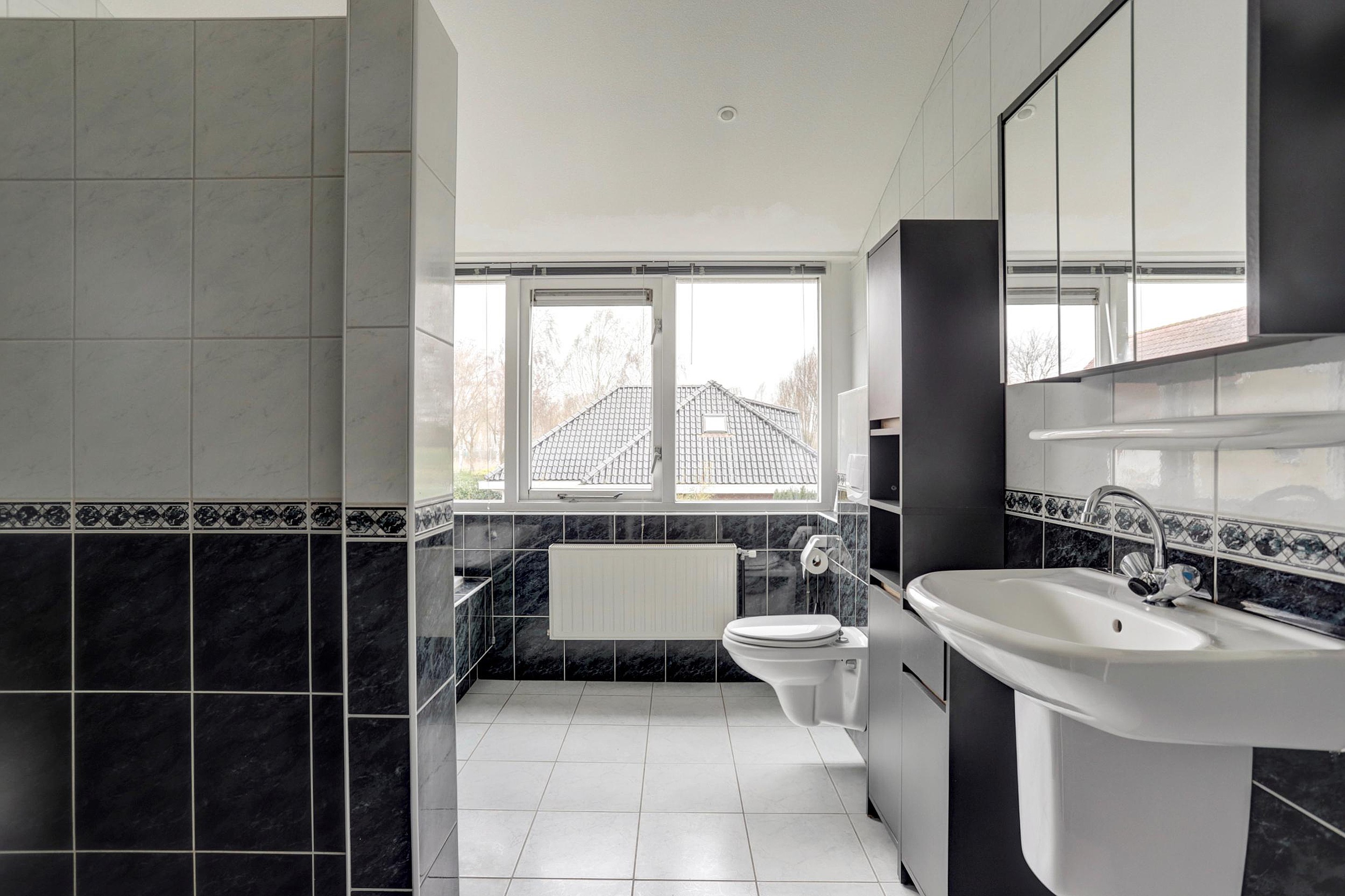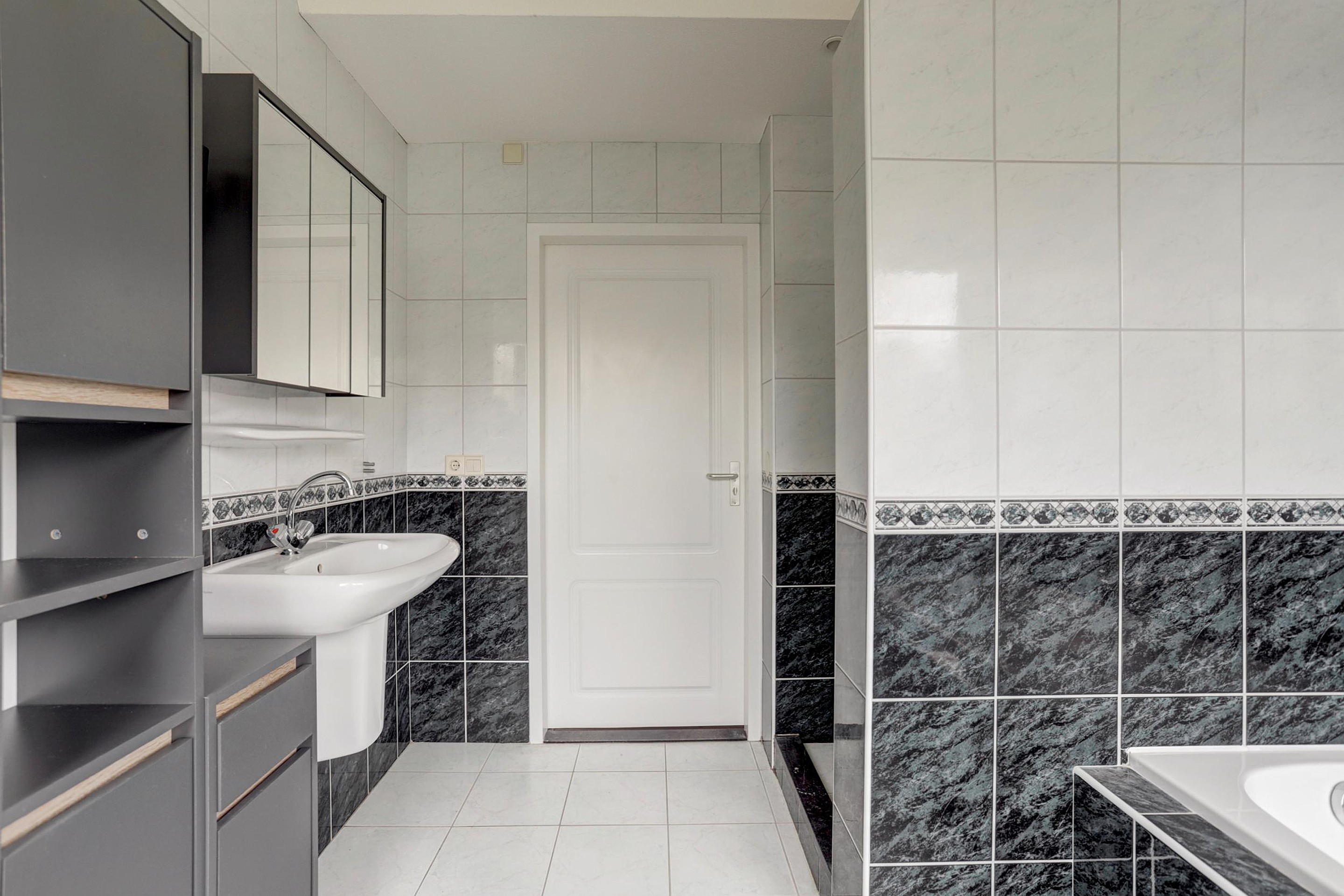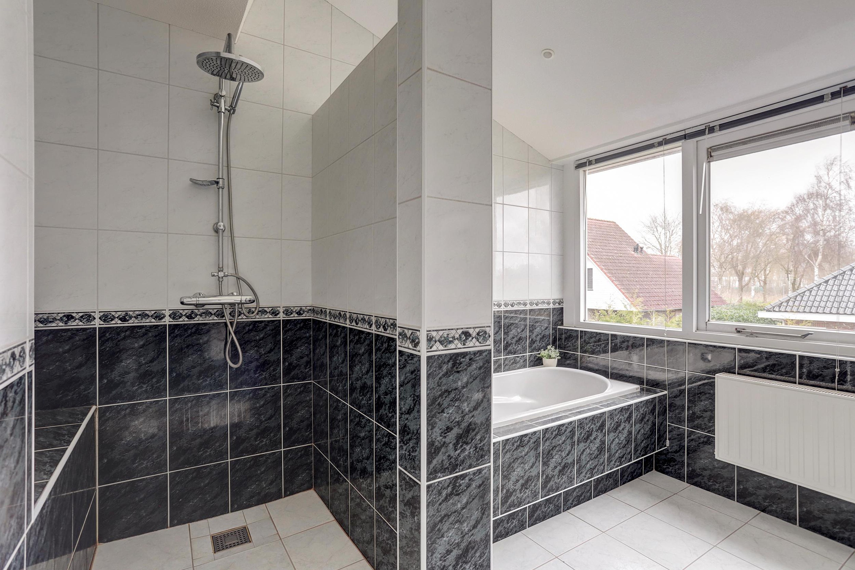 Op de eerste verdieping bevindt zich de overloop met toegang tot drie comfortabele slaapkamers. De royale master bedroom beschikt over een vaste kastenwand, wat zorgt voor veel praktische bergruimte. De badkamer is een fijne, lichte ruimte met een hoog plafond dat een extra ruimtelijk gevoel geeft. De badkamer is compleet ingericht met een inloopdouche, ligbad, wastafelmeubel en toilet.