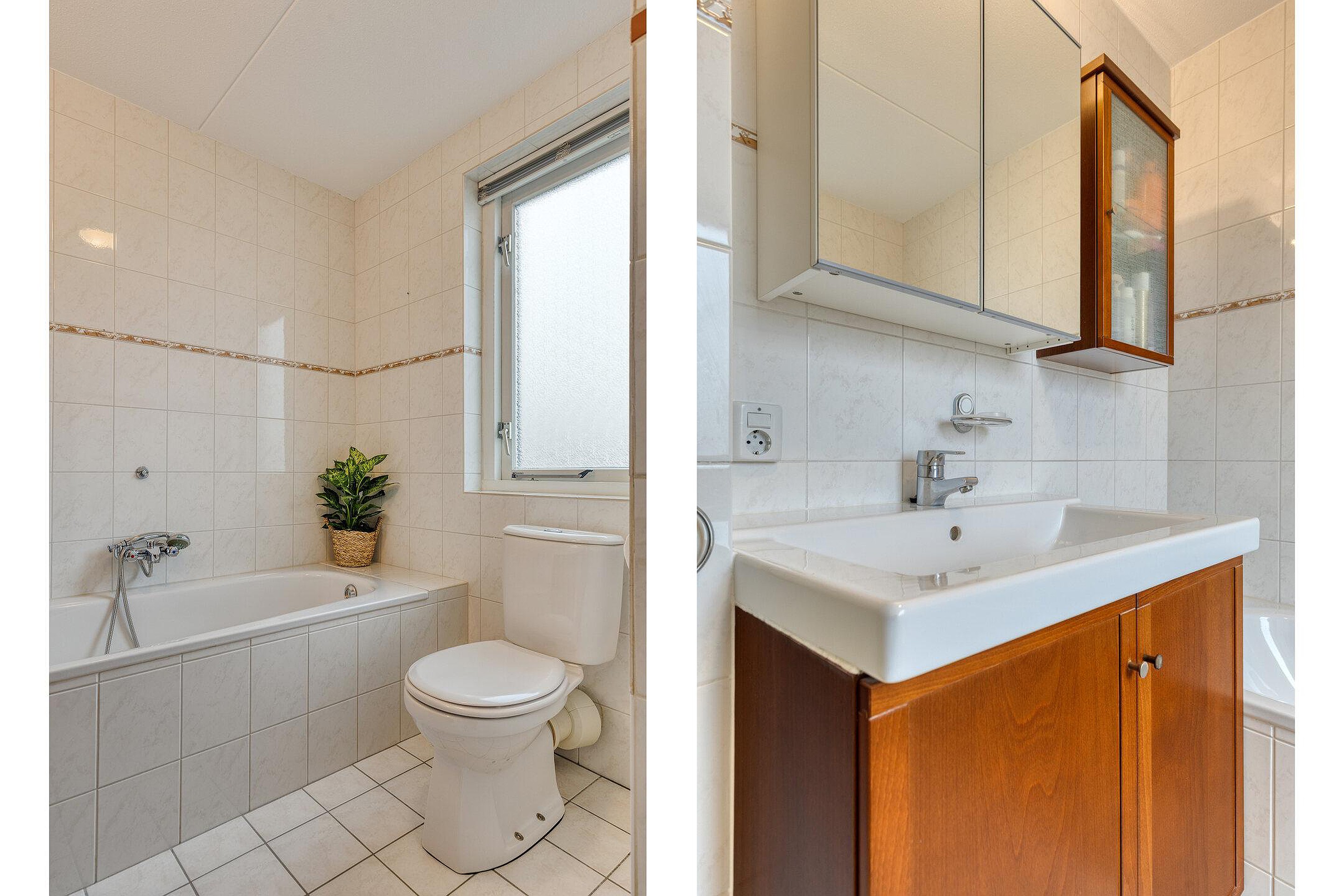 Eerste verdieping overloop, 3 ruime slaapkamers ( geen schuine wanden), en een badkamer met ligbad douchecabine wastafel en 2e toilet, vaste trap naar de tweede verdieping.