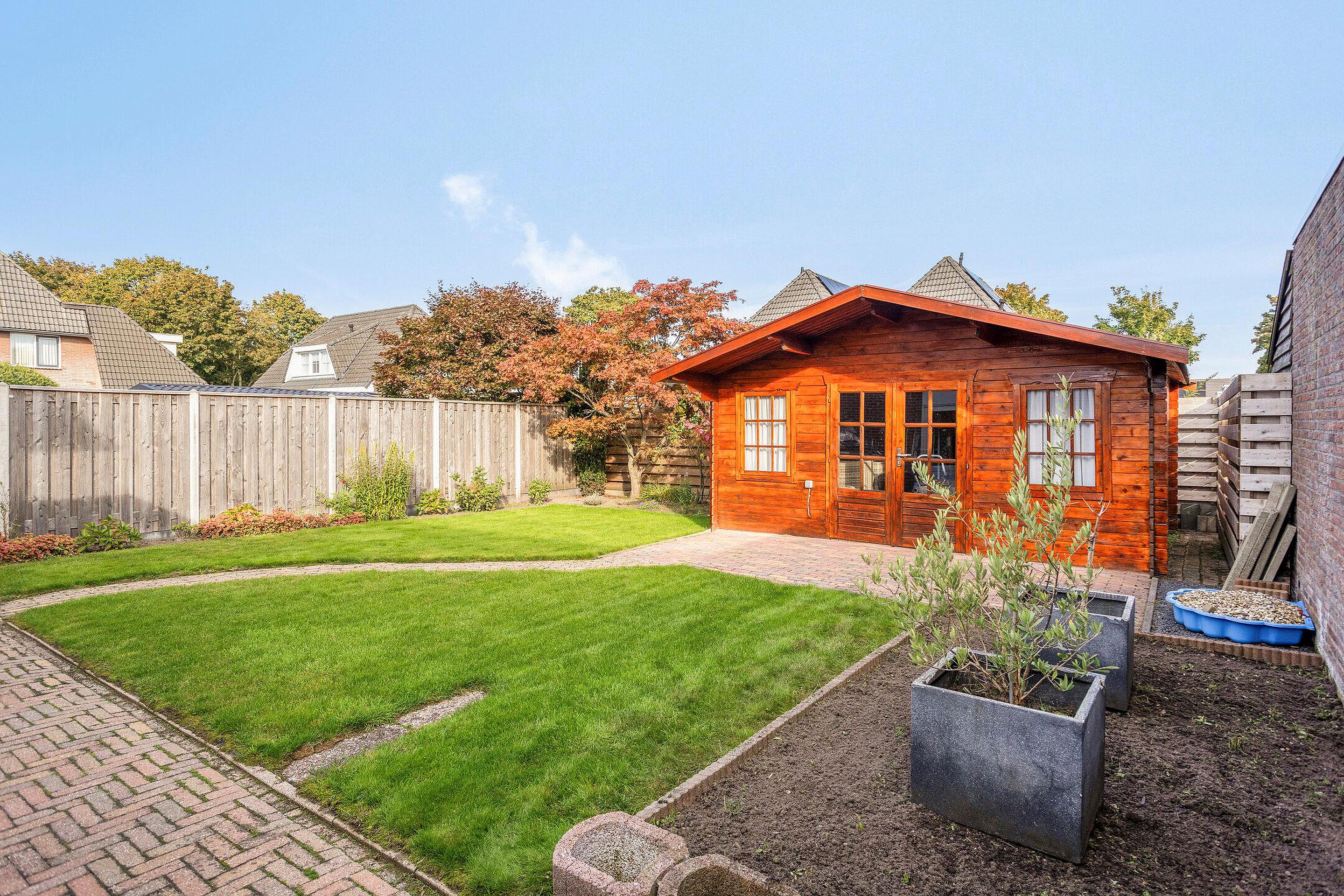 Nette tuin met houten tuinshuisje.