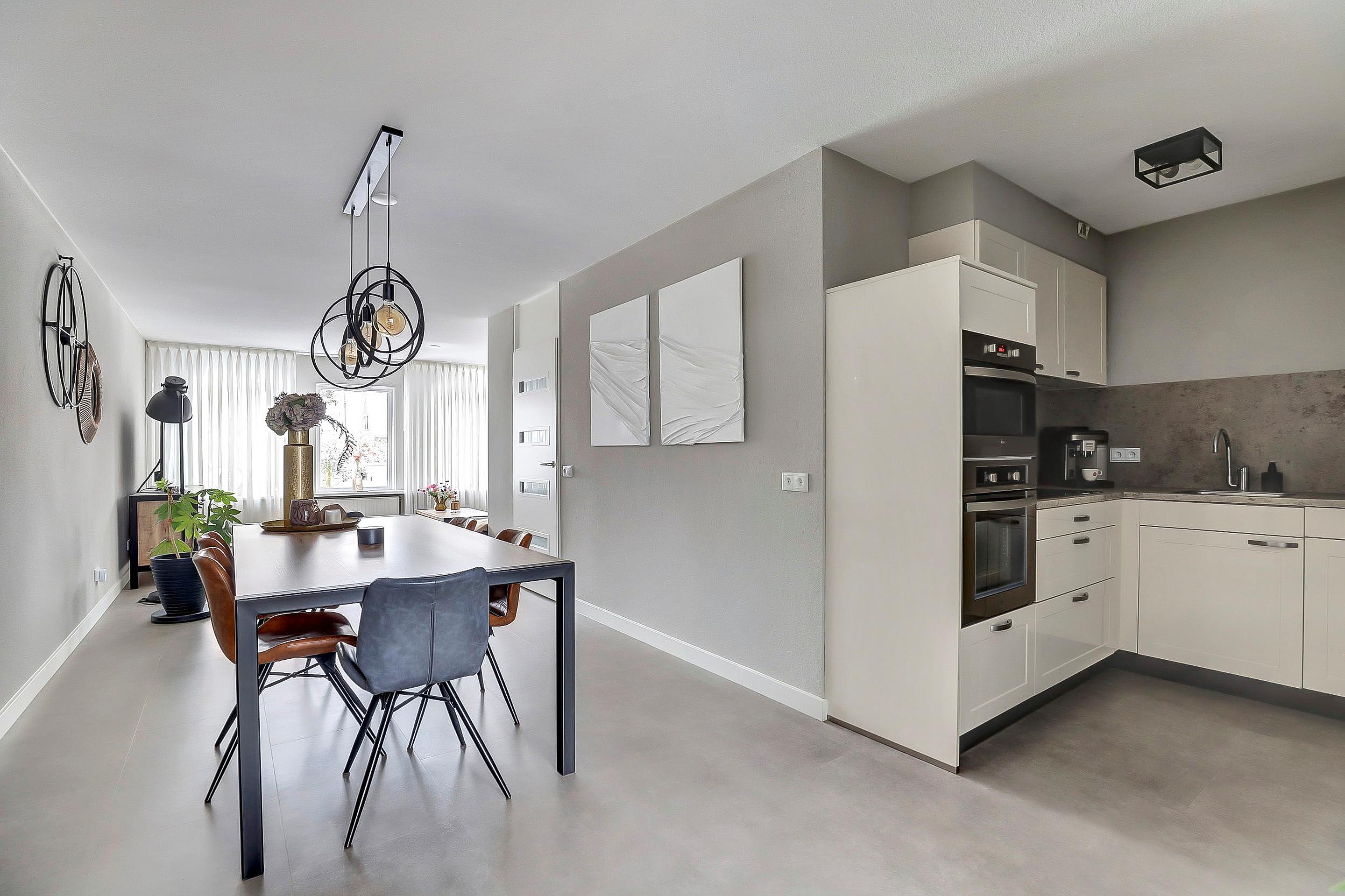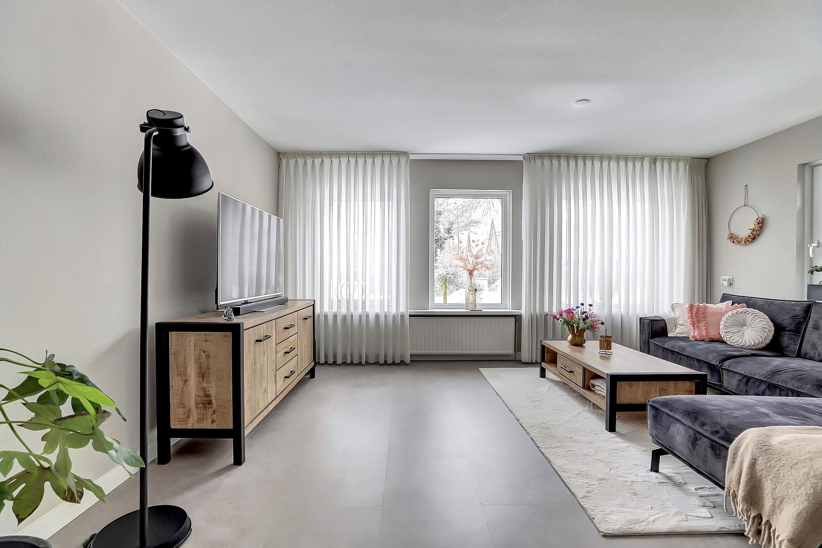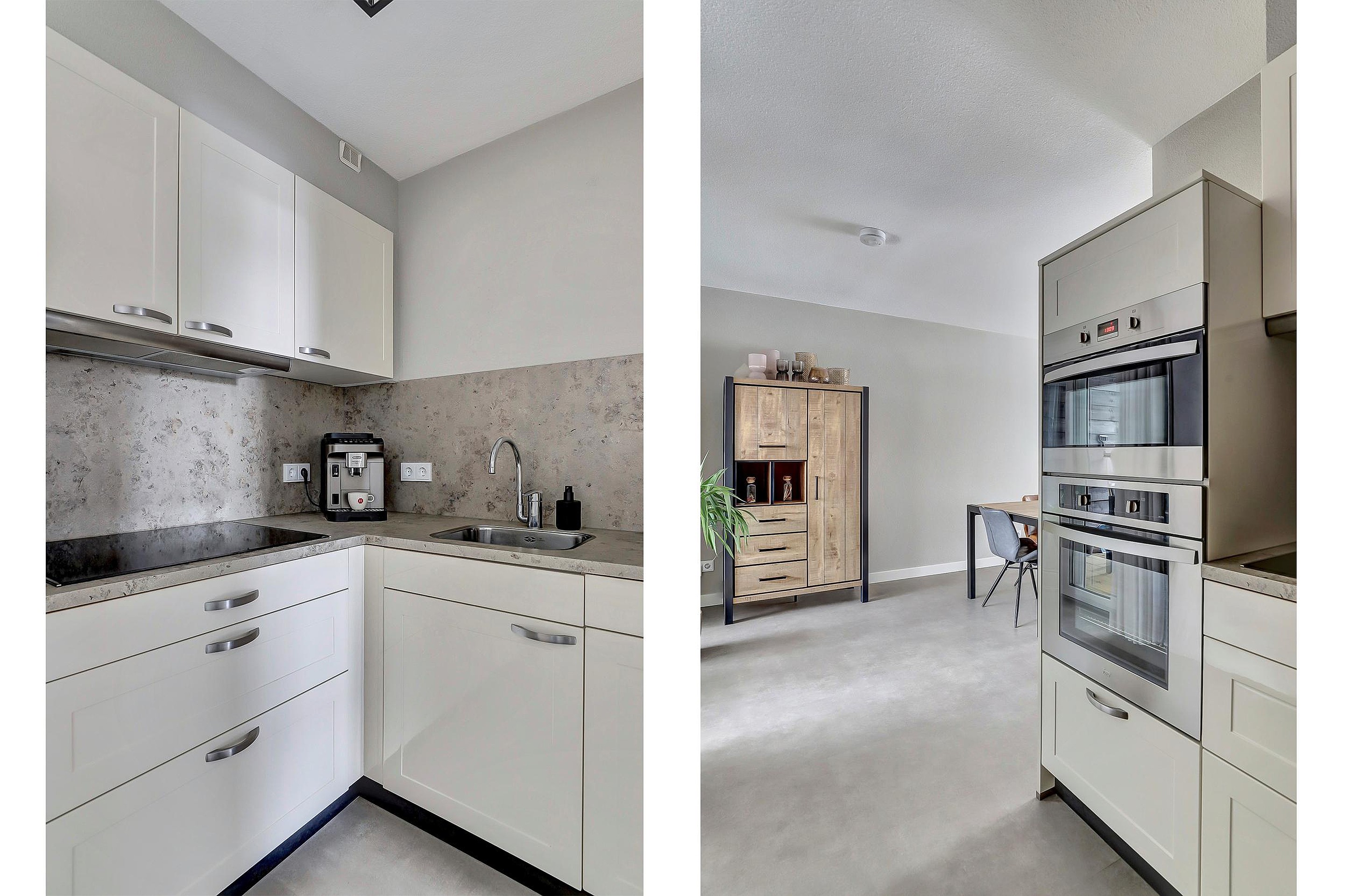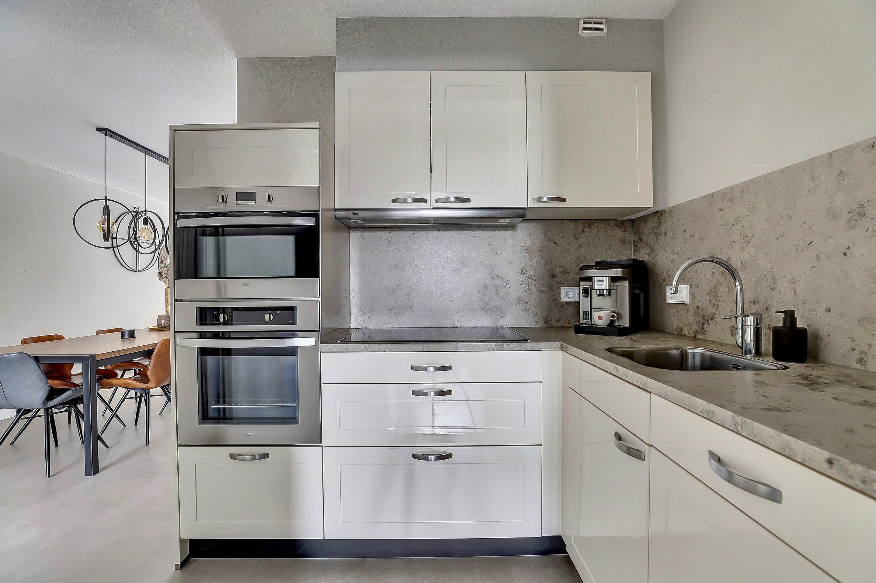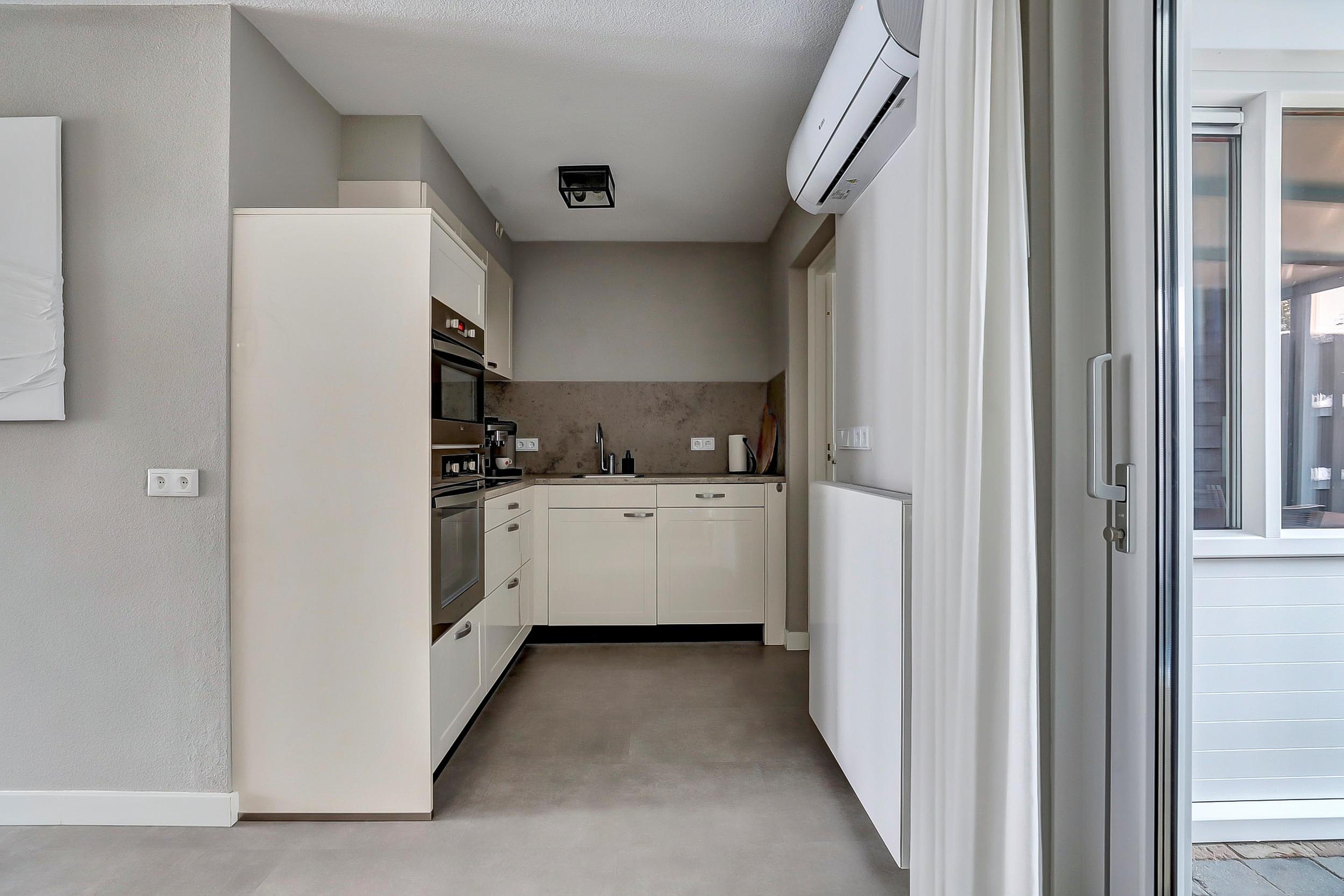 U komt binnen in de entree met moderne toiletruimte en meterkast. Vanuit hier bereikt u de L-vormige woonkamer, uitgevoerd in een moderne kleurstelling en voorzien van een prachtige PVC-vloer en een uitzonderlijk strakke afwerking. De moderne keuken is compleet uitgerust met een combimagnetron, oven, vaatwasser (2023), inductiekookplaat (2023) en afzuigkap. Via de schuifpui is het heerlijk overdekte terras te bereiken. Aansluitend bevindt zich de praktische bijkeuken met vaste kastruimte en opstelling van de cv-ketel.