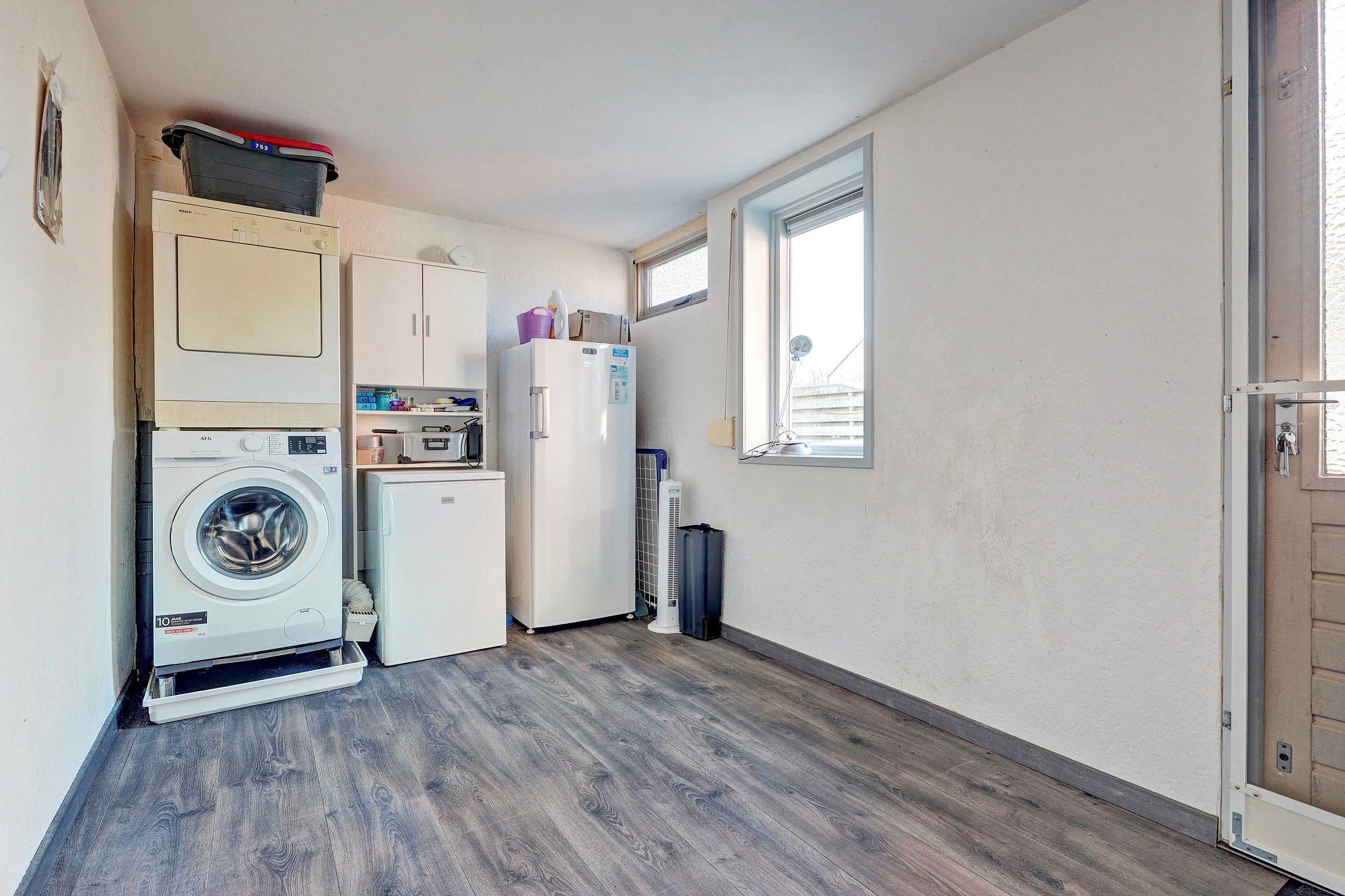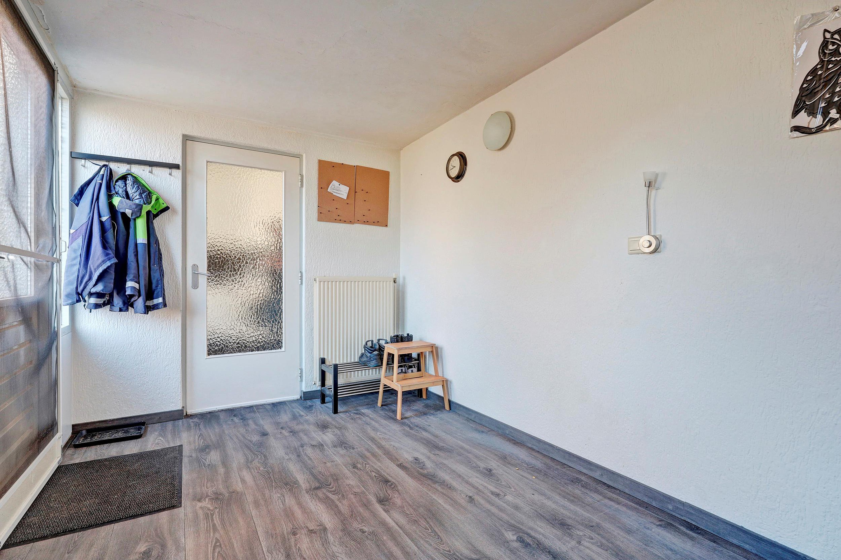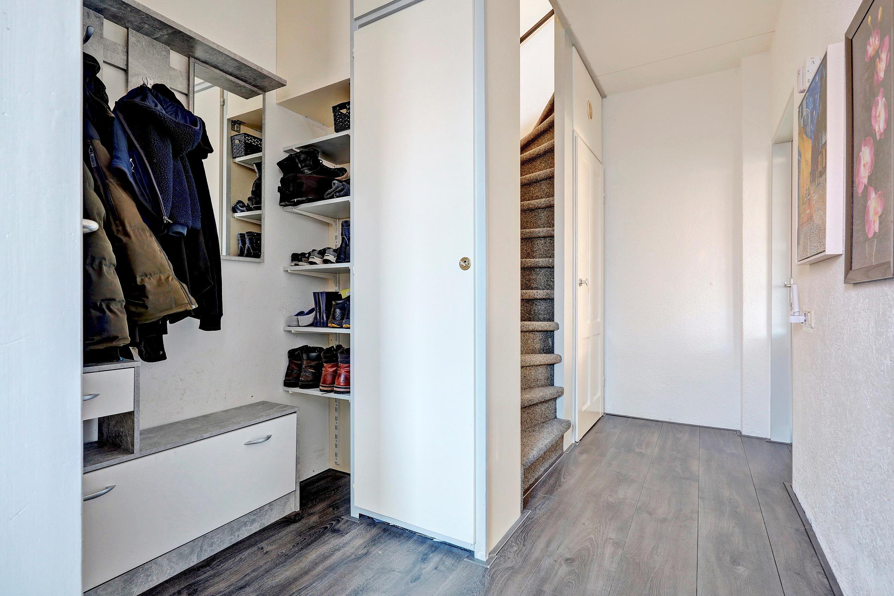 Via de entree betreedt u de woning. In de hal bevinden zich de meterkast, een vaste kast en het toilet. Vanuit hier komt u in de lichte doorzonwoonkamer, die dankzij de grote raampartijen een prettige lichtinval heeft en een fijne leefruimte biedt. De open keuken sluit hier mooi op aan en is uitgerust met een oven, inductiekookplaat, koelkast, vaatwasser en afzuigkap. Aangrenzend bevindt zich de bijkeuken, met praktische bergruimte en toegang tot de achtertuin.