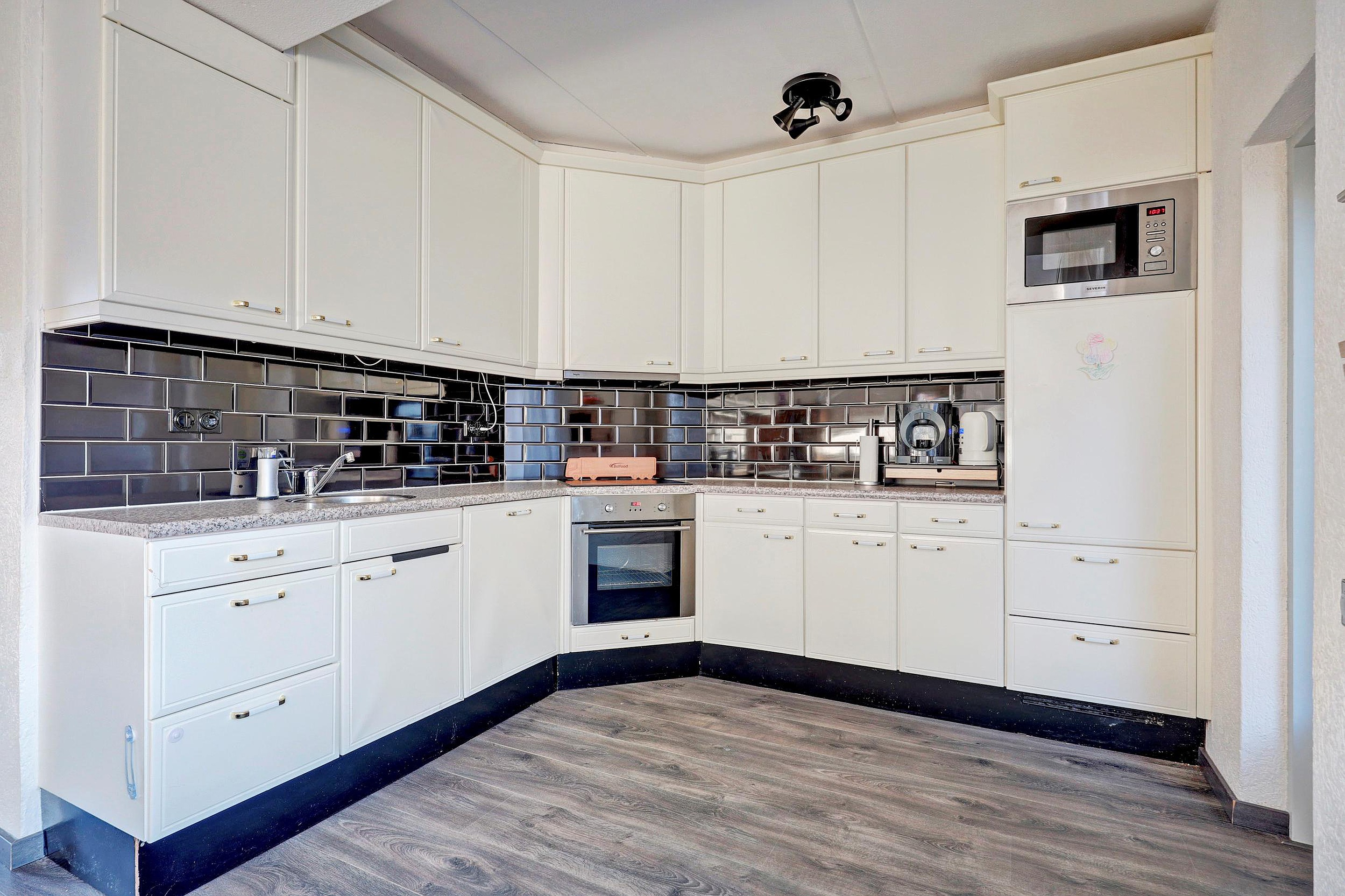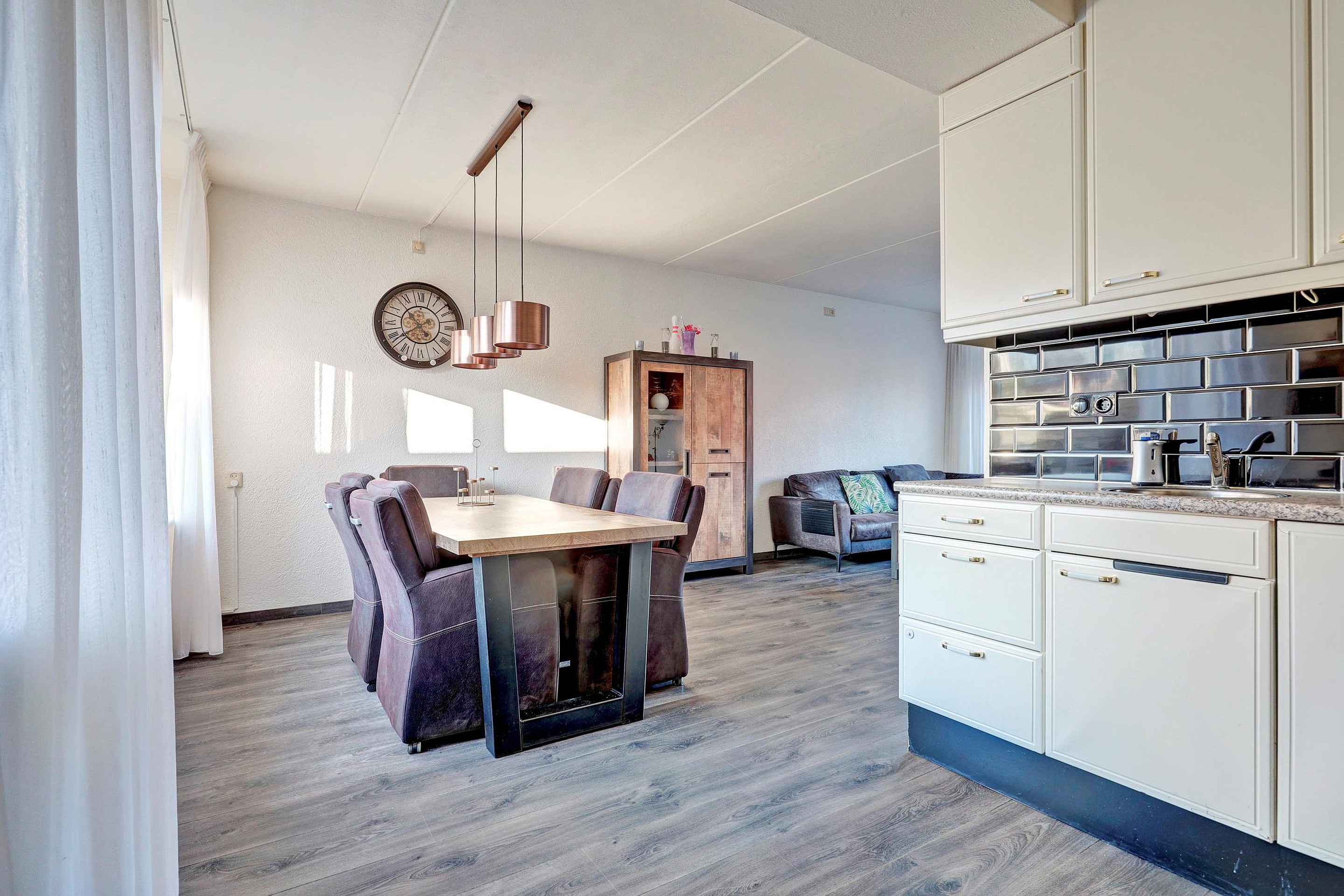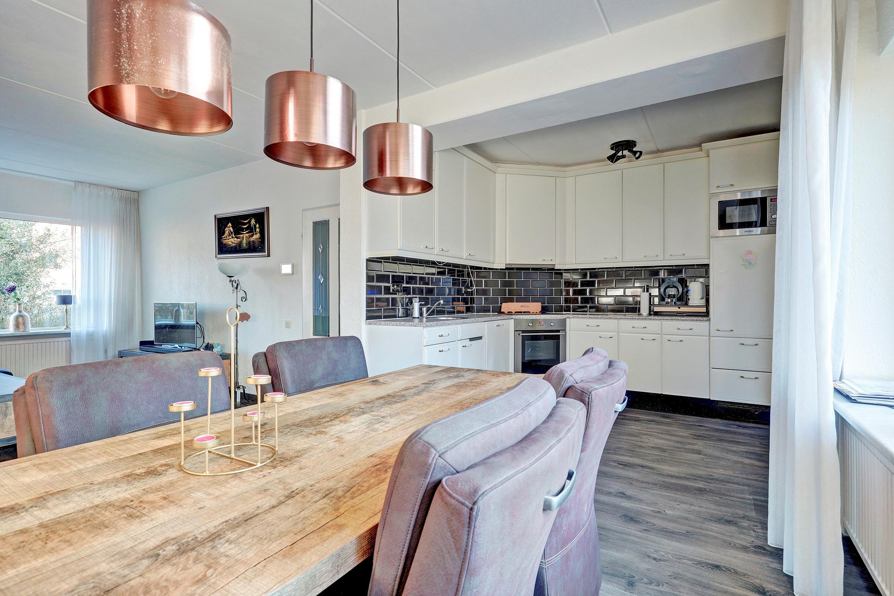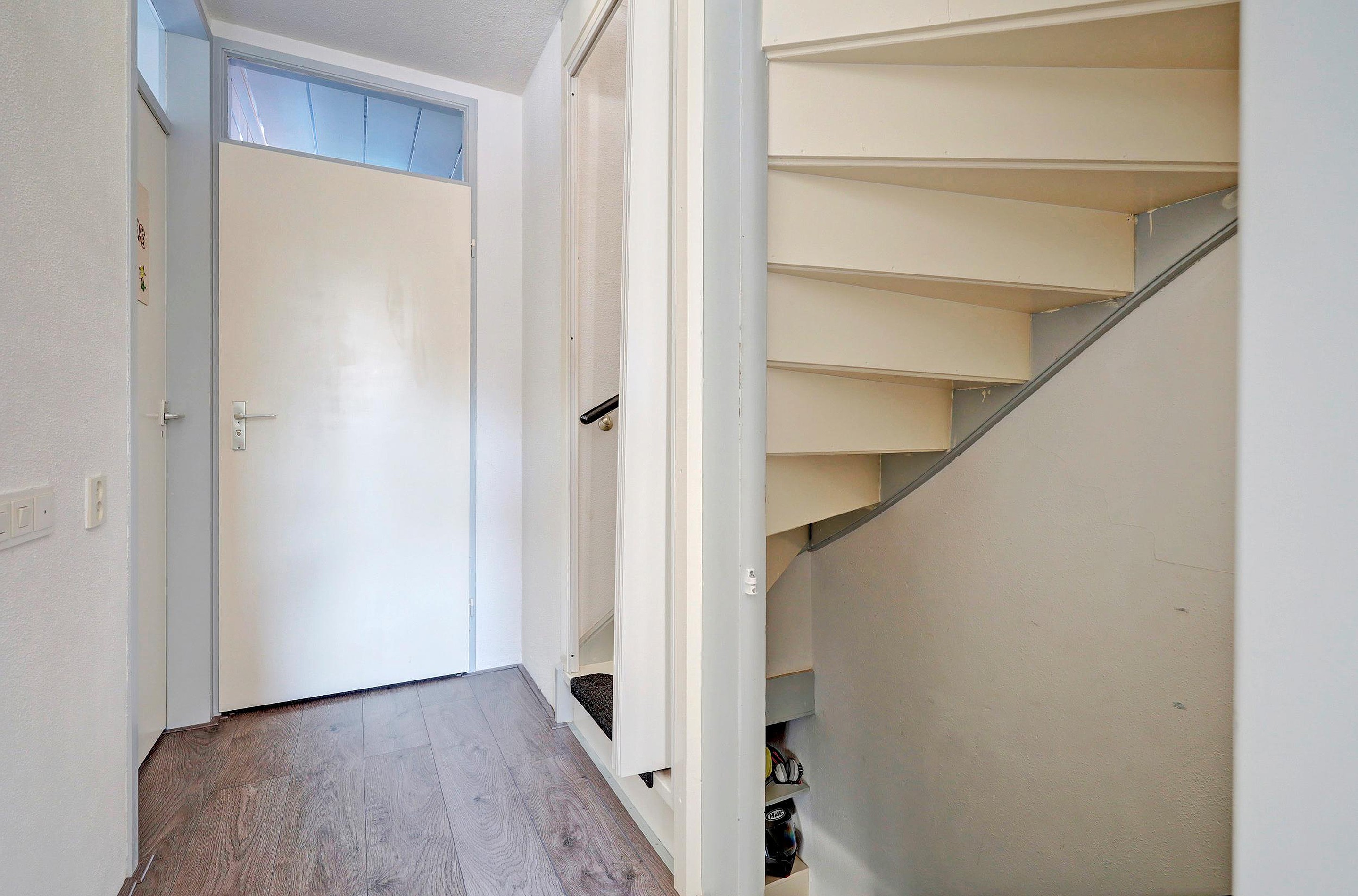 Via de entree betreedt u de woning. In de hal bevinden zich de meterkast, een vaste kast en het toilet. Vanuit hier komt u in de lichte doorzonwoonkamer, die dankzij de grote raampartijen een prettige lichtinval heeft en een fijne leefruimte biedt. De open keuken sluit hier mooi op aan en is uitgerust met een oven, inductiekookplaat, koelkast, vaatwasser en afzuigkap. Aangrenzend bevindt zich de bijkeuken, met praktische bergruimte en toegang tot de achtertuin.