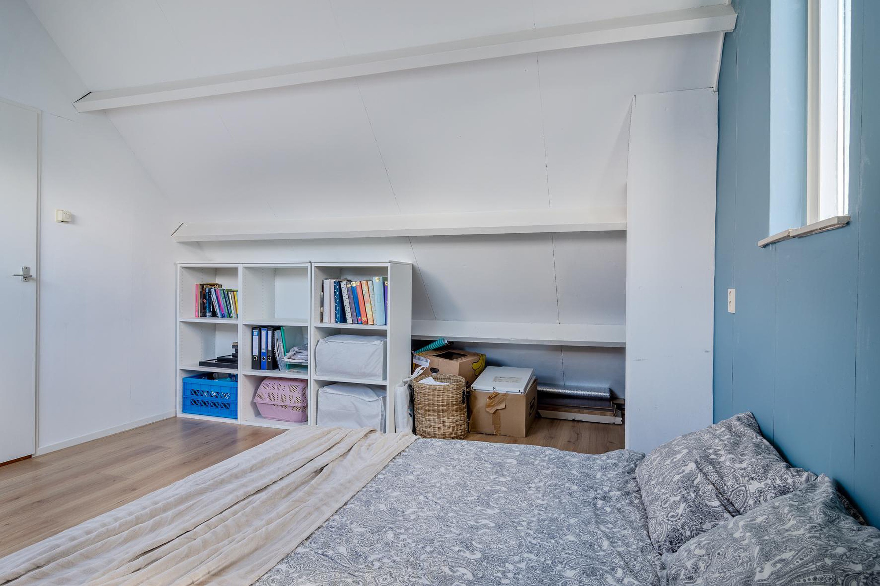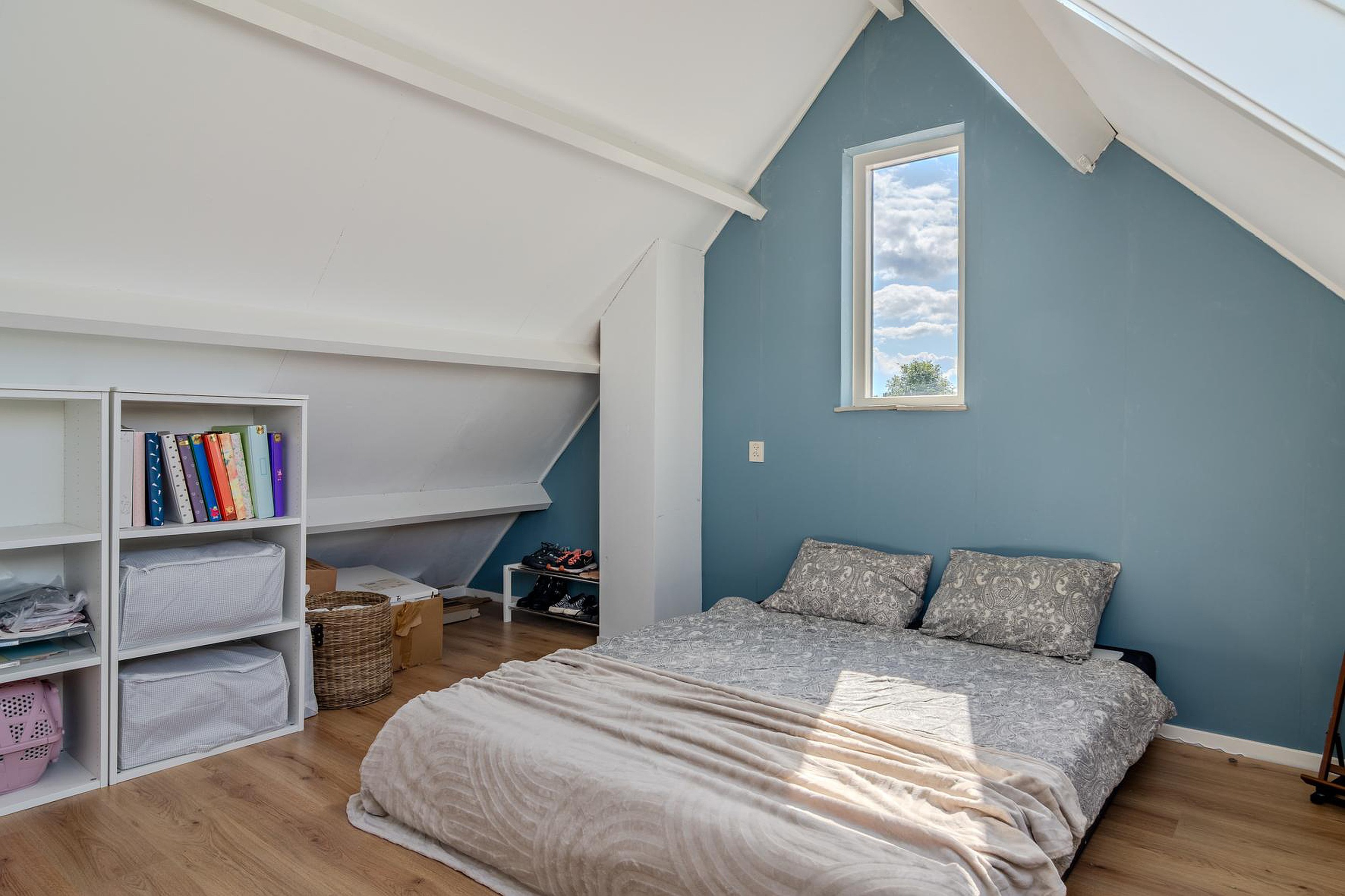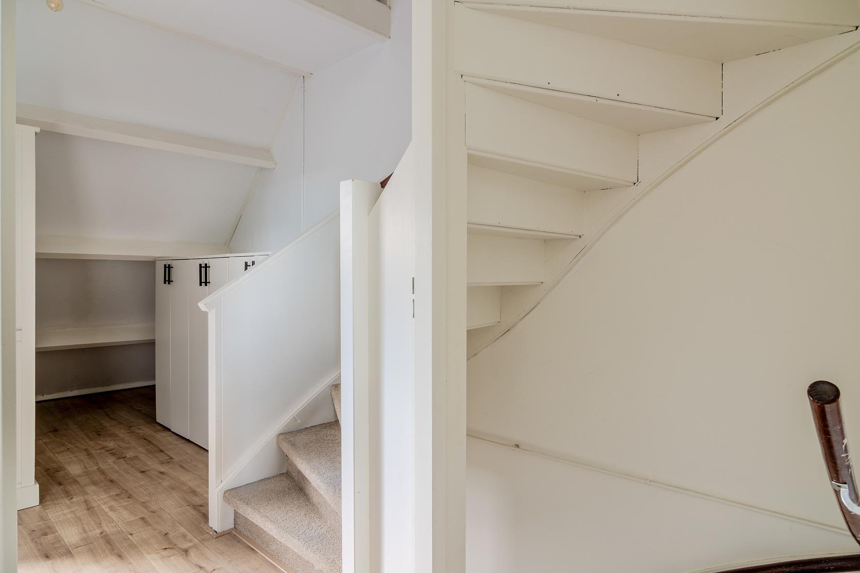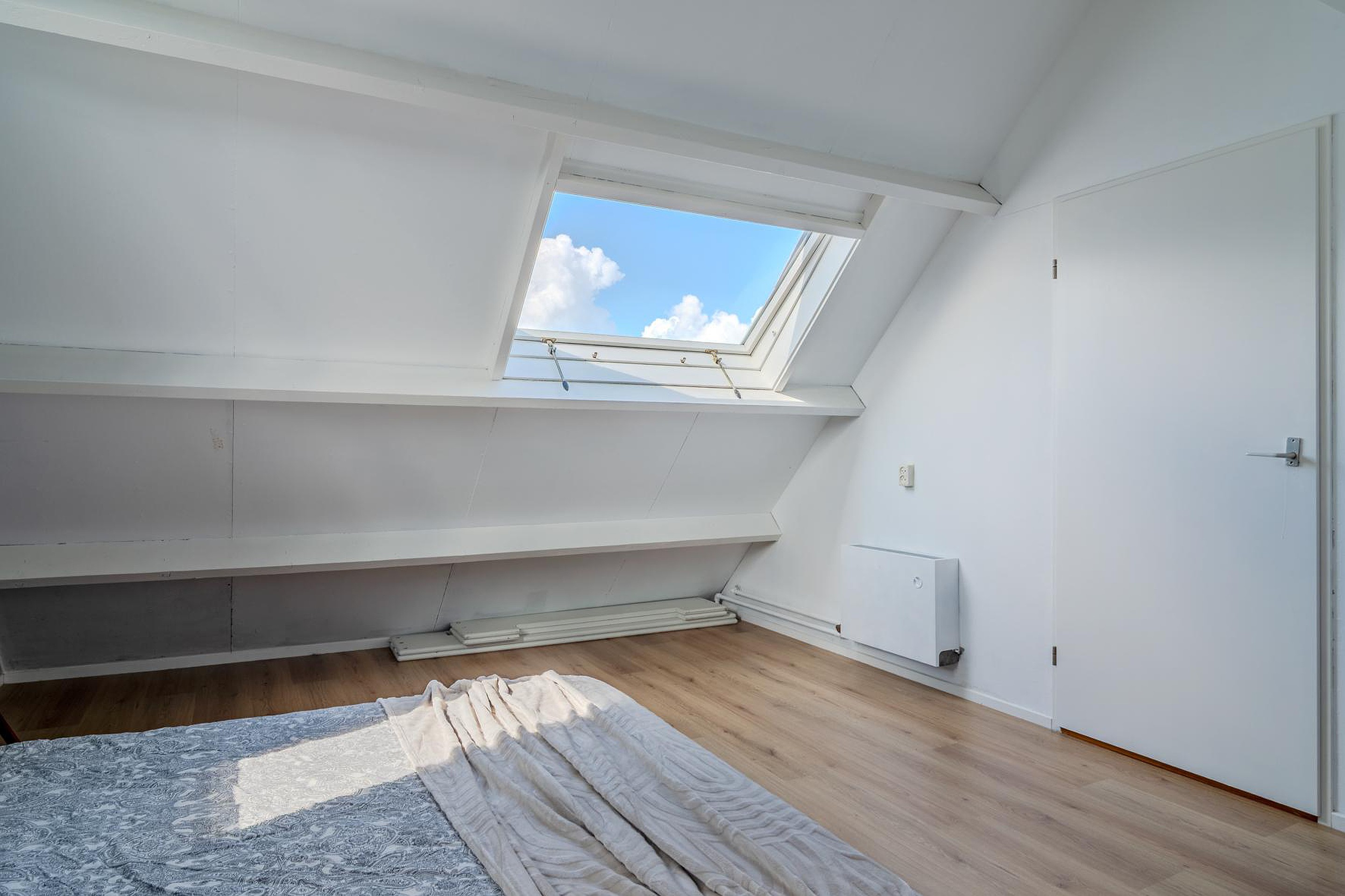 Via de vaste trap kom je op de tweede verdieping. Hier is een ruime voorzolder met opstelling voor de wasmachine/droger, de cv-opstelling en de omvormer van de zonnepanelen. Verder vind je hier een royale 3de slaapkamer met zij-raam en een groot dakraam.