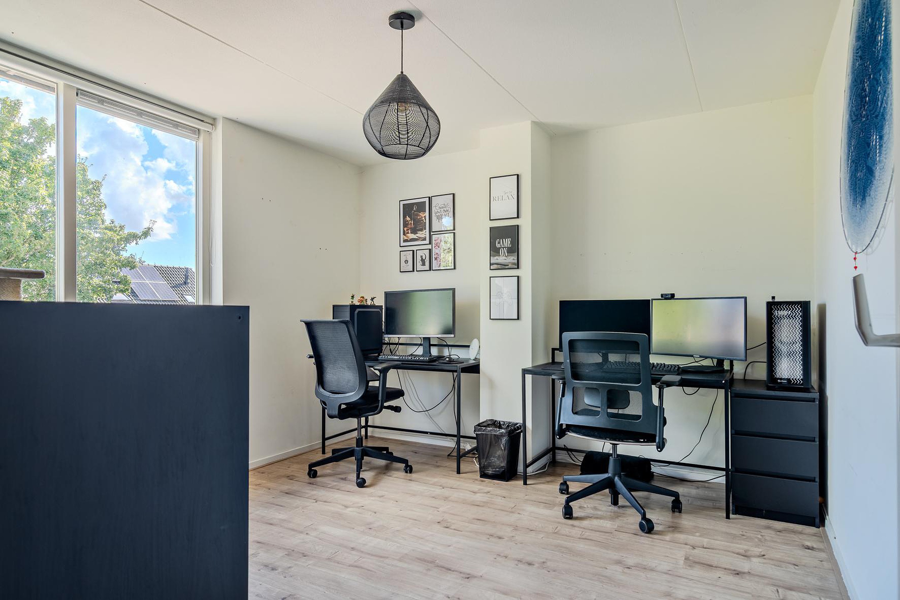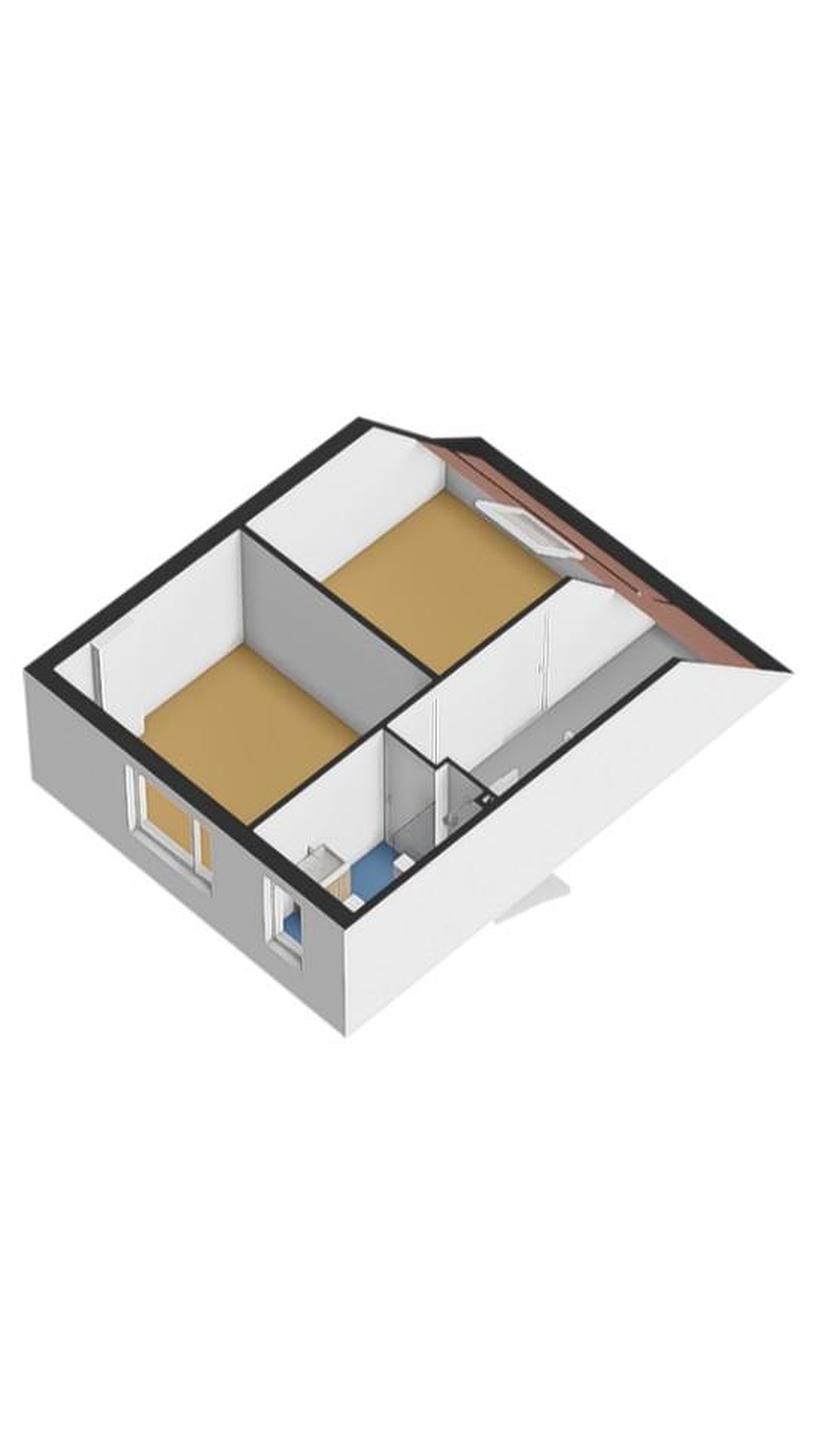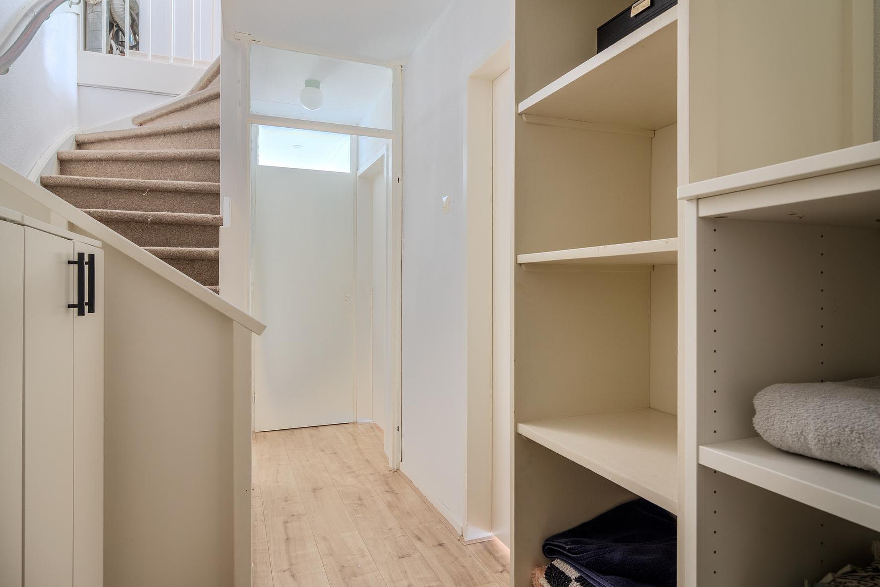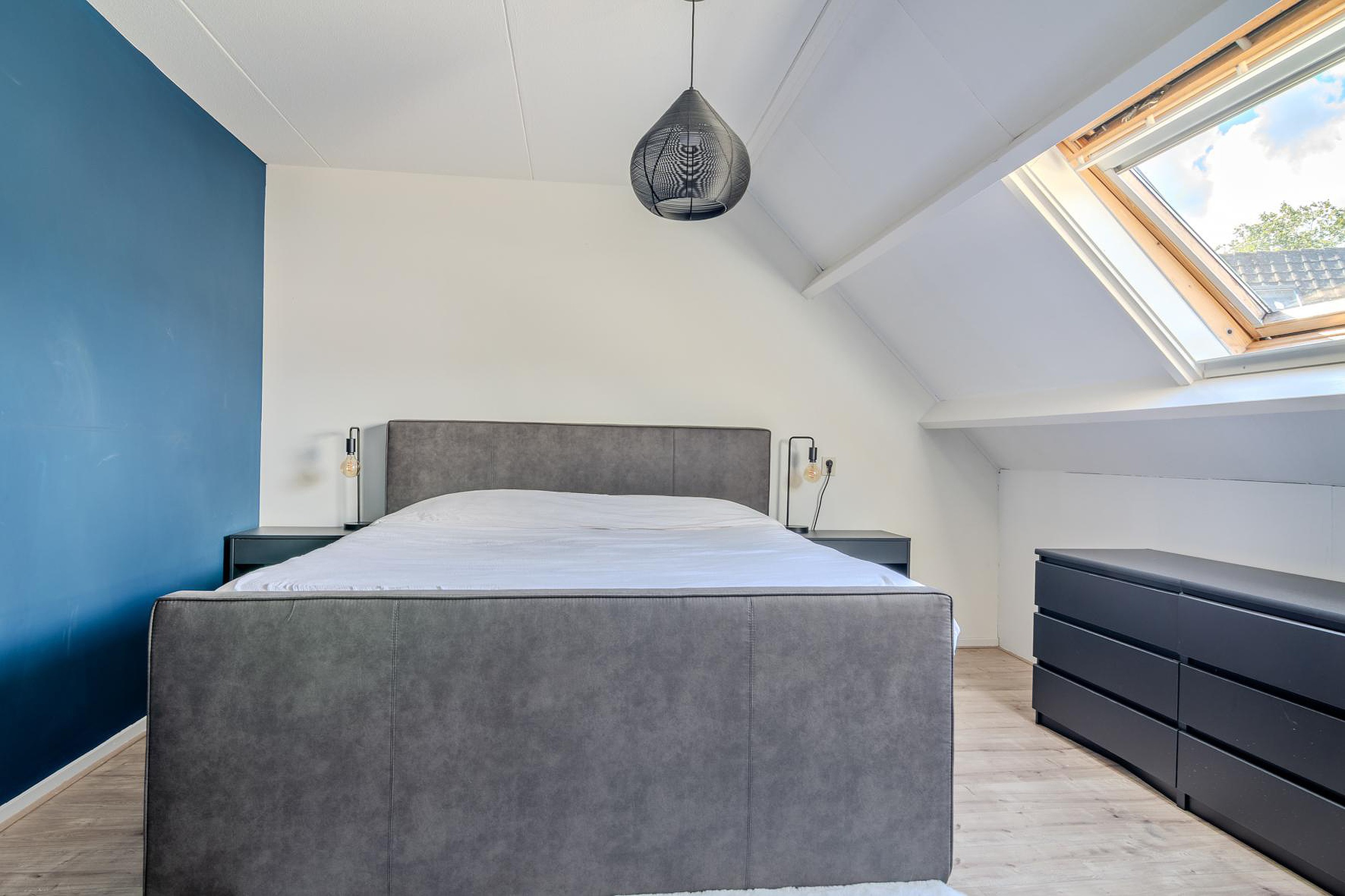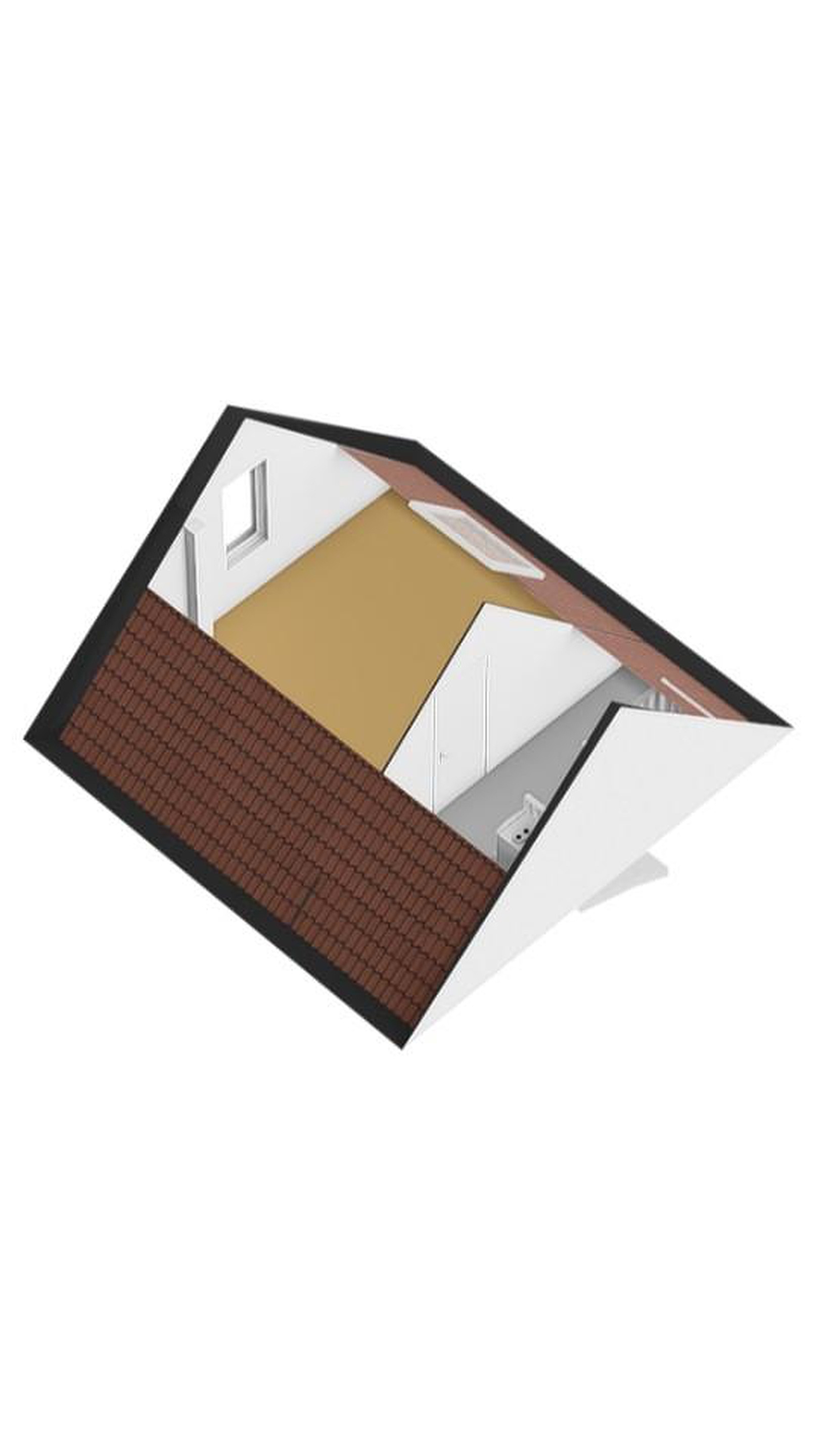 Via de vaste trap kom je op de tweede verdieping. Hier is een ruime voorzolder met opstelling voor de wasmachine/droger, de cv-opstelling en de omvormer van de zonnepanelen. Verder vind je hier een royale 3de slaapkamer met zij-raam en een groot dakraam.