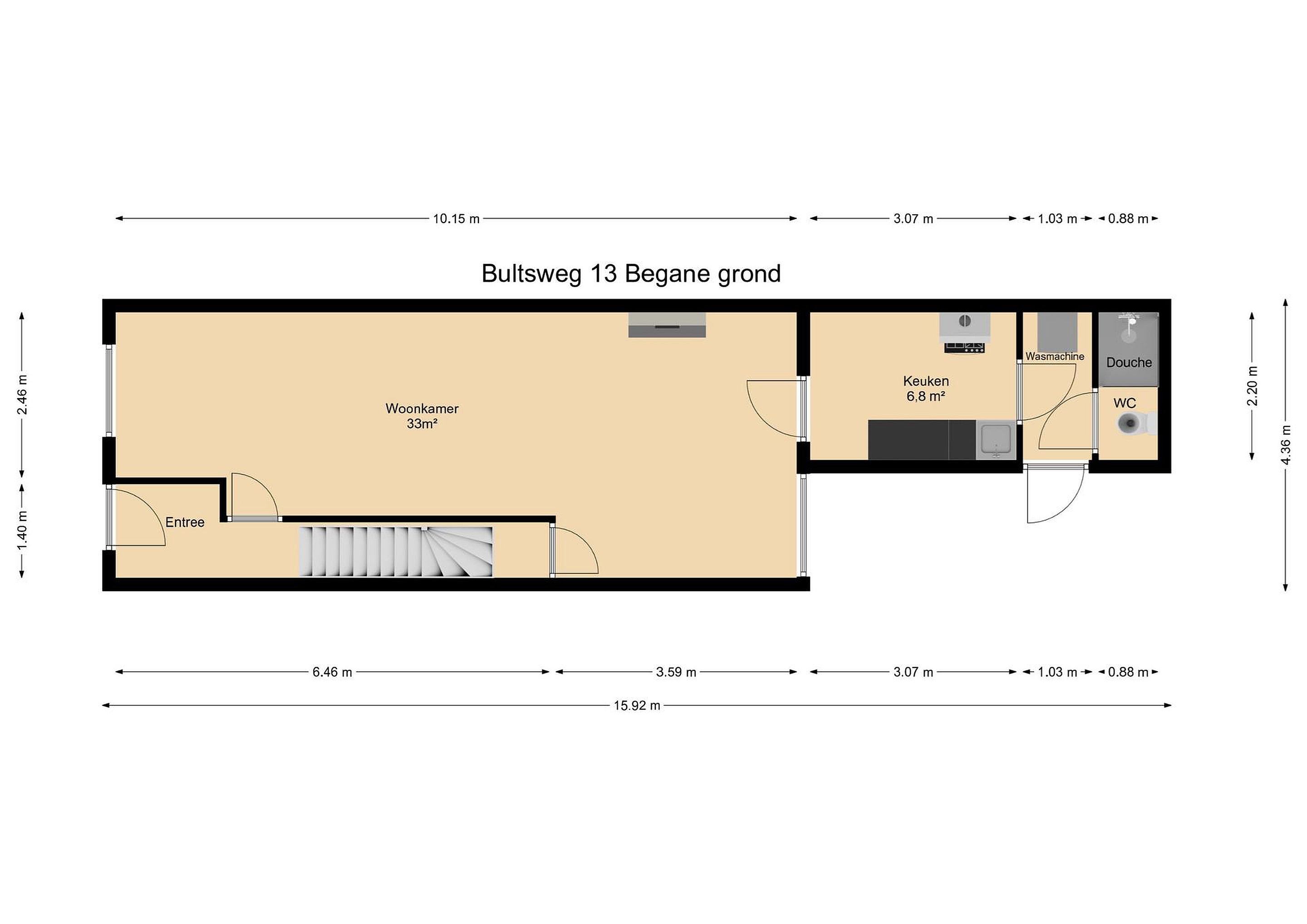 Indeling: entree, hal, trapopgang, meterkast, ruime en lichte woonkamer, kelder, standaard keukenblok, portaal, badkamer met douchehoek en toilet.