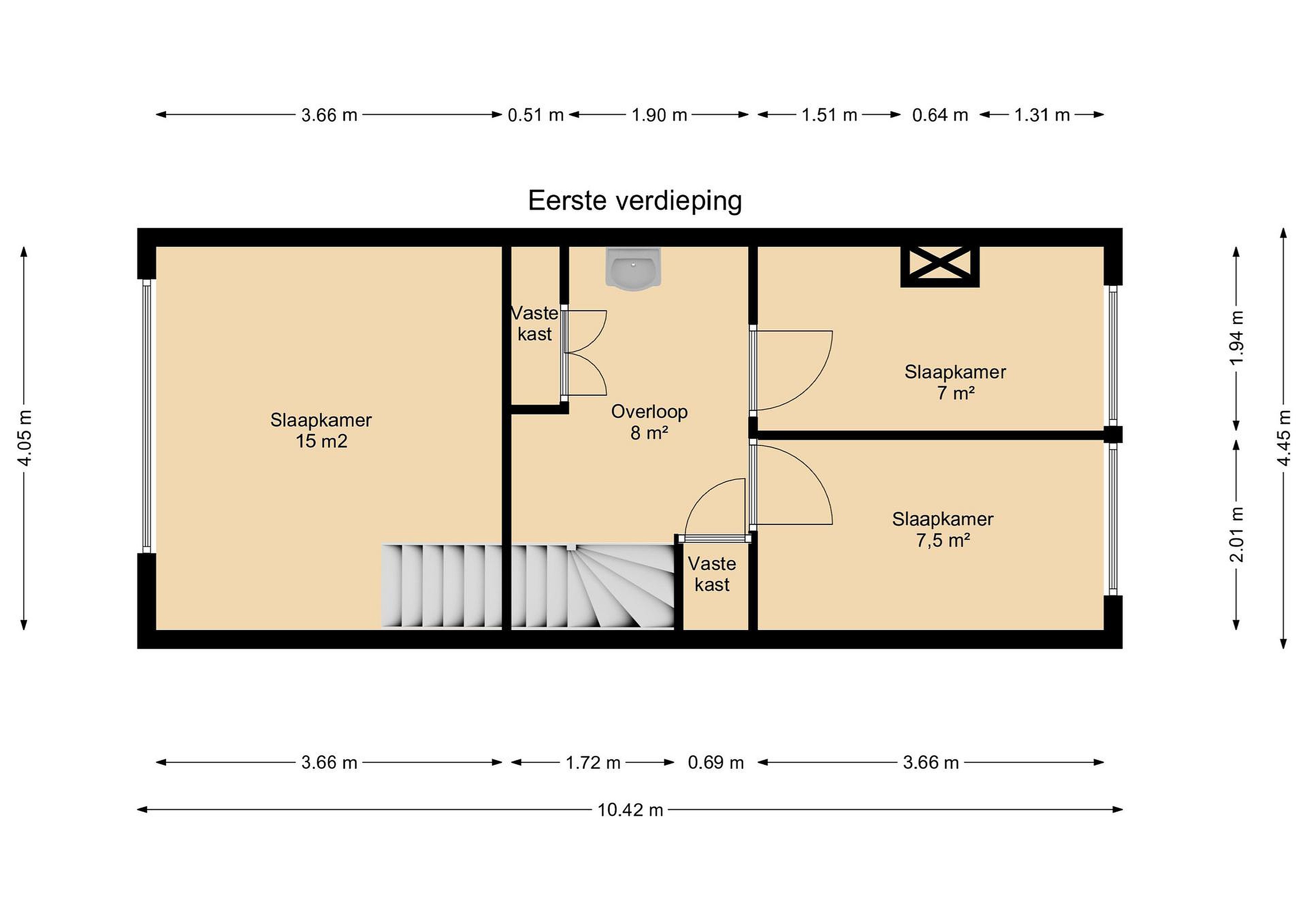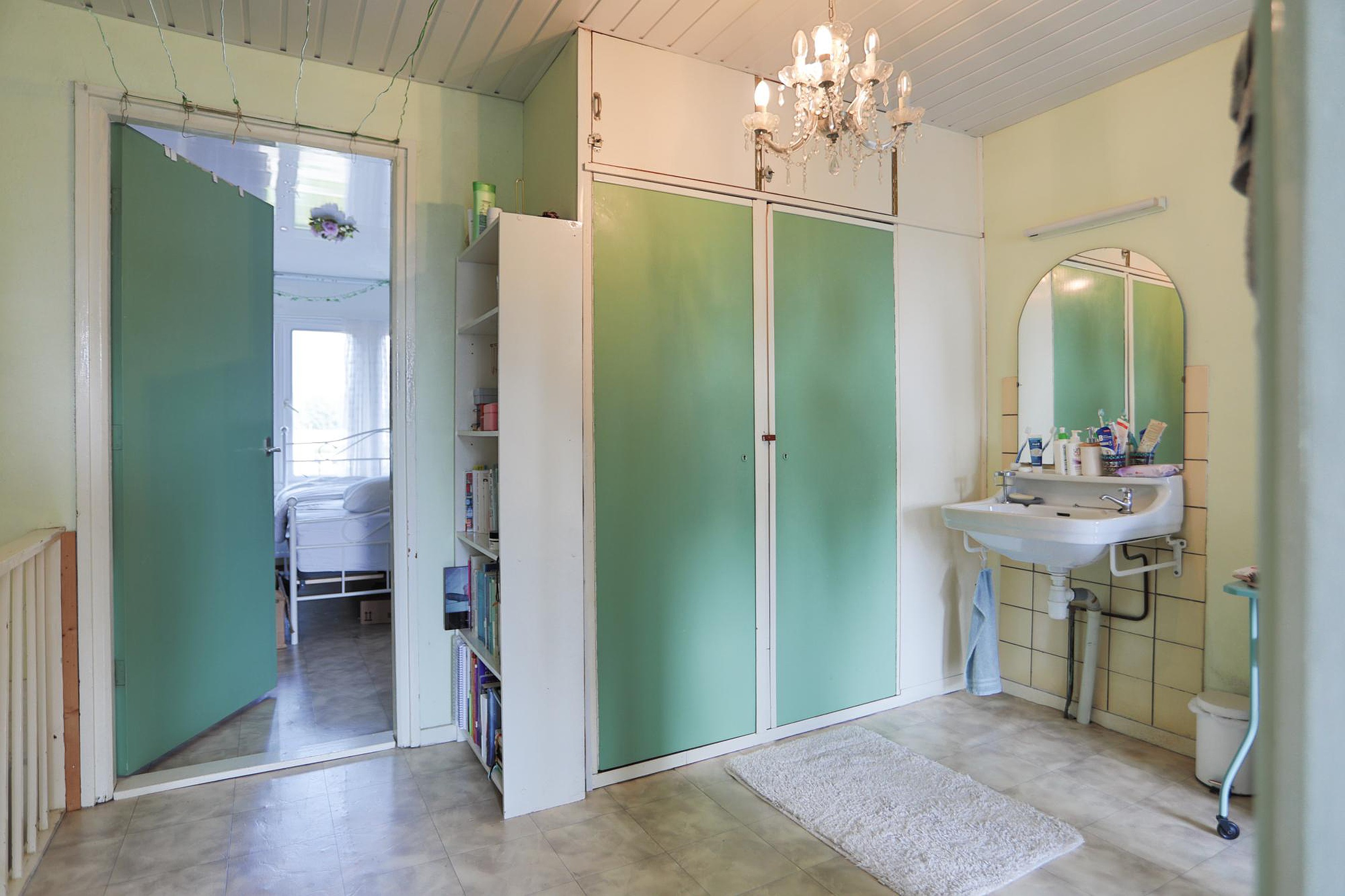 1e verdieping: ruime overloop met vaste kasten en wastafel, 3 goede slaapkamers.
