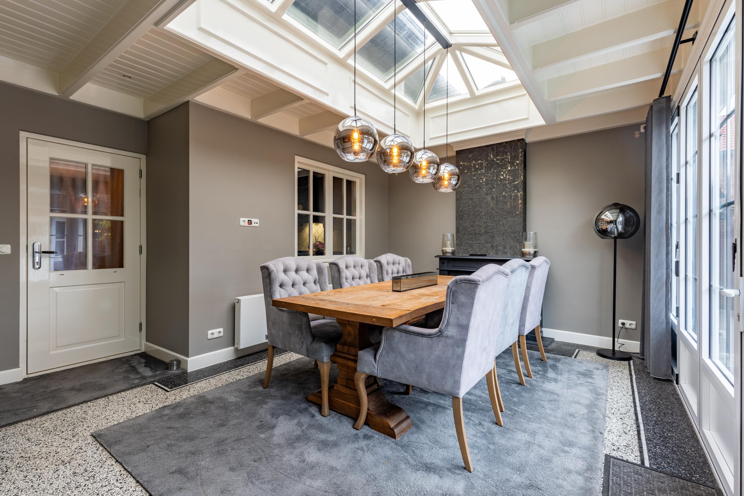 - tuin-/eetkamer/serre met lichtstraat, Italiaanse terazzo vloer, gashaard en harmonica deur