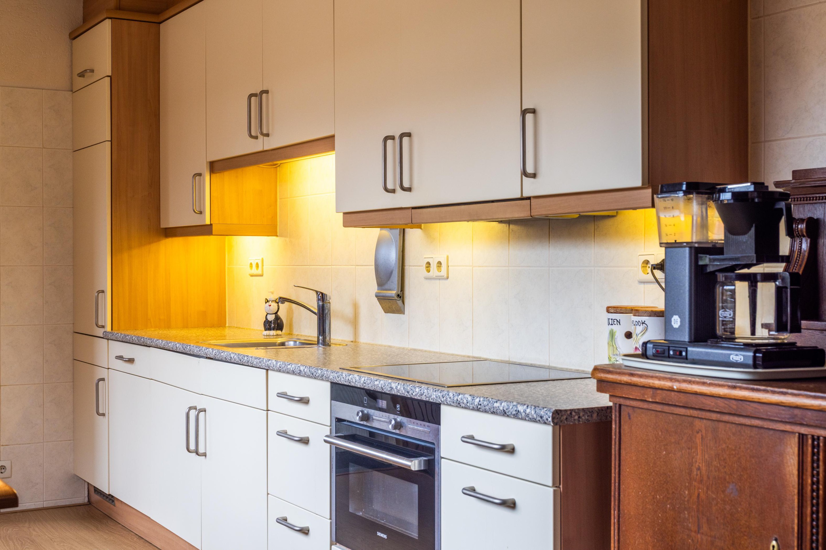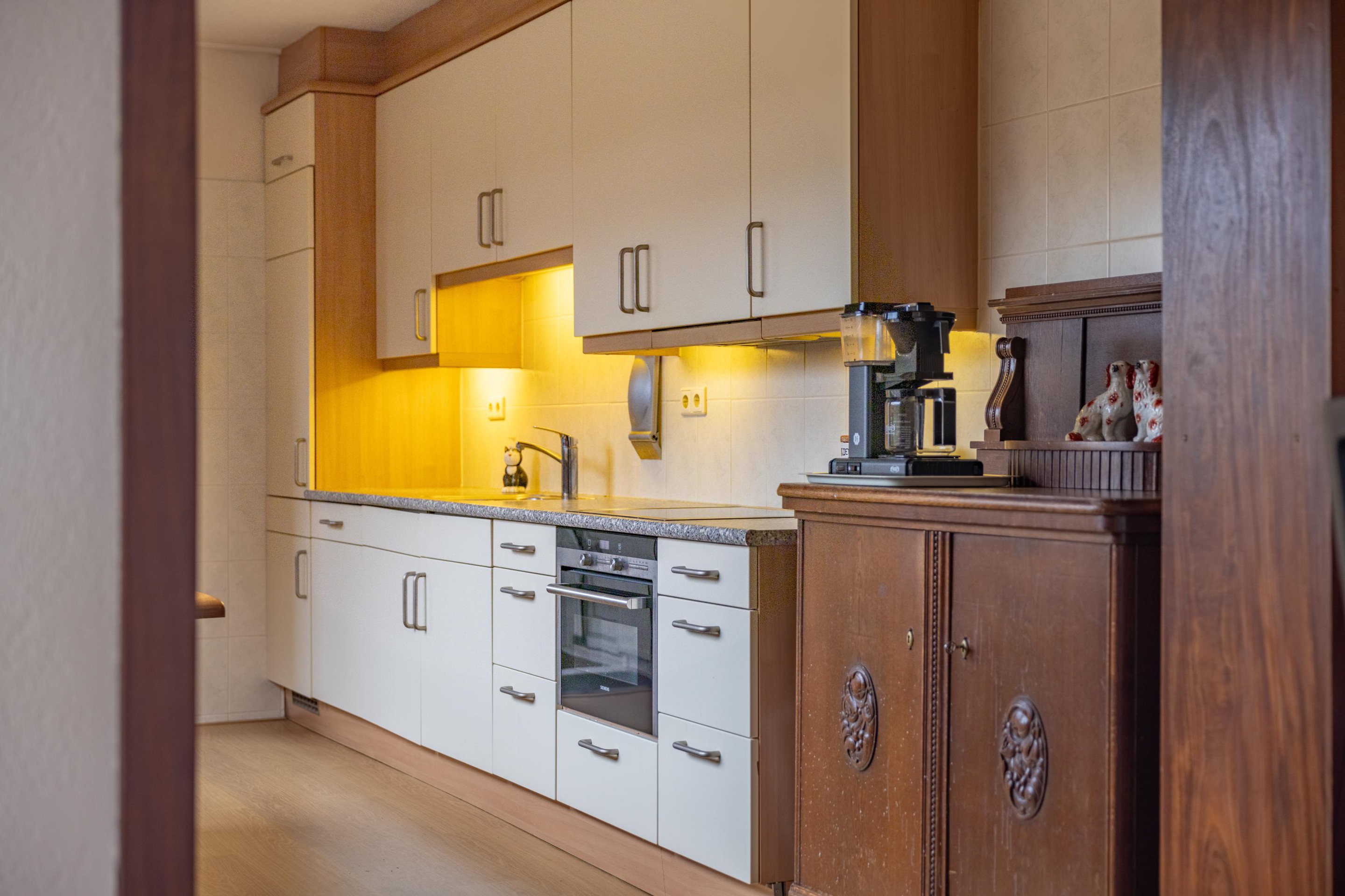 Begane grond Begane grond: entree, hal, meterkast, toiletruimte, lichte woonkamer, uitgebouwde keuken met diverse inbouwapparatuur o.a. een koelkast en diepvriesladen, vaatwasser, inductiekookplaat en combi oven/magnetron, toegang tot de kelder, bijkeuken met wasmachine- en drogeraansluiting en de opstelplaats van de CV-ketel Remeha (huurketel);