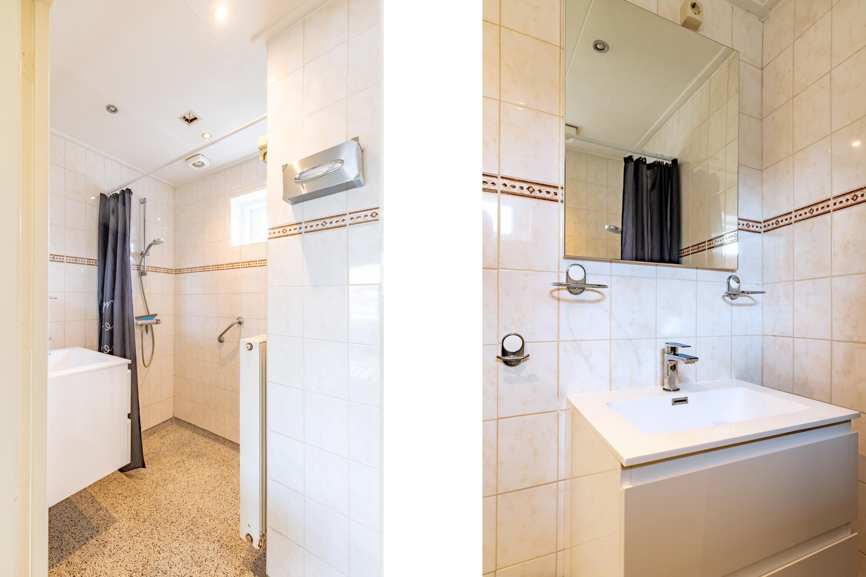 Eerste verdieping Overloop, 3 slaapkamers, waarvan de ouderslaapkamer aan de achterzijde is voorzien van een rolluik, badkamer met wastafelmeubel en een inloopdouche;