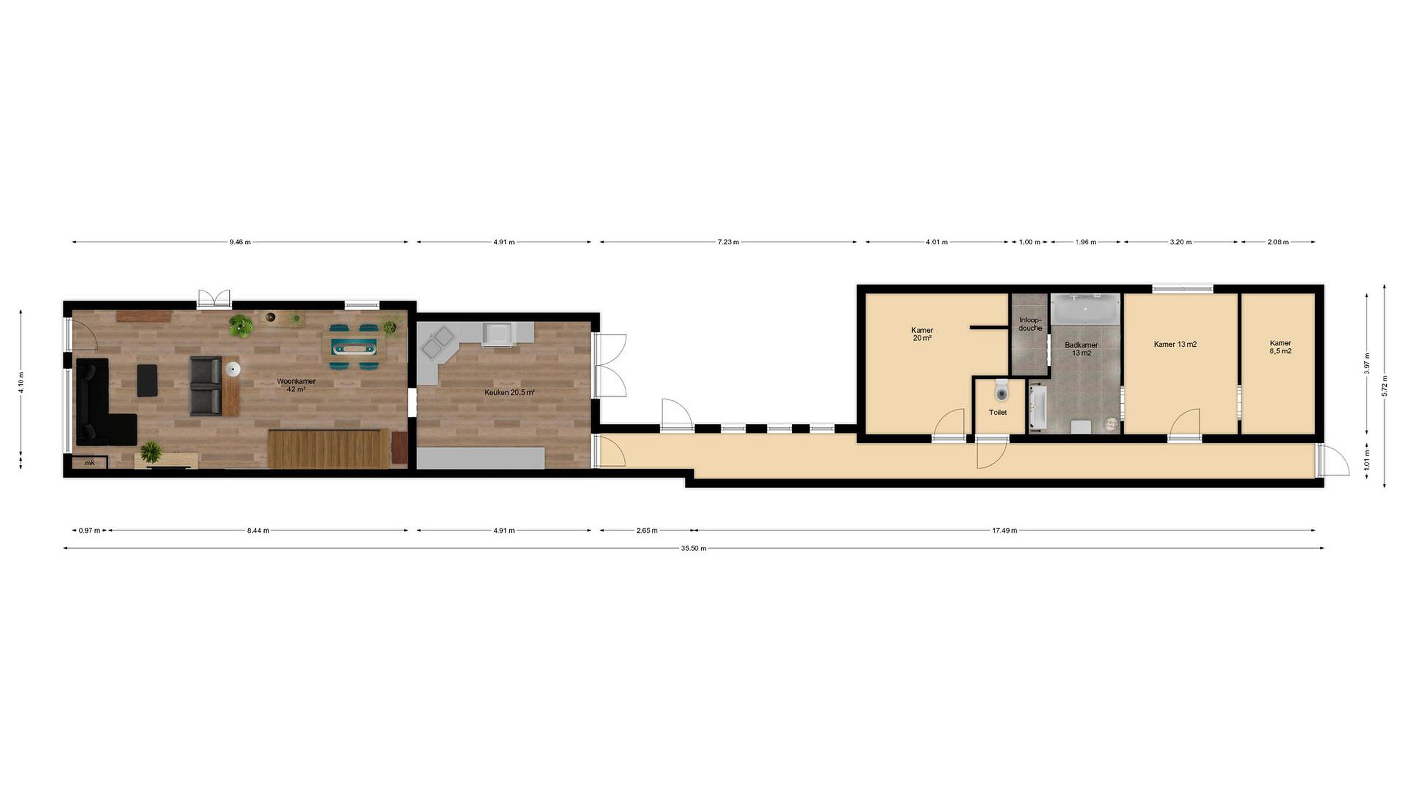 Aansluitend bevindt zich de luxe woonkeuken (ca. 22 m2), compleet uitgerust met inbouwapparatuur.