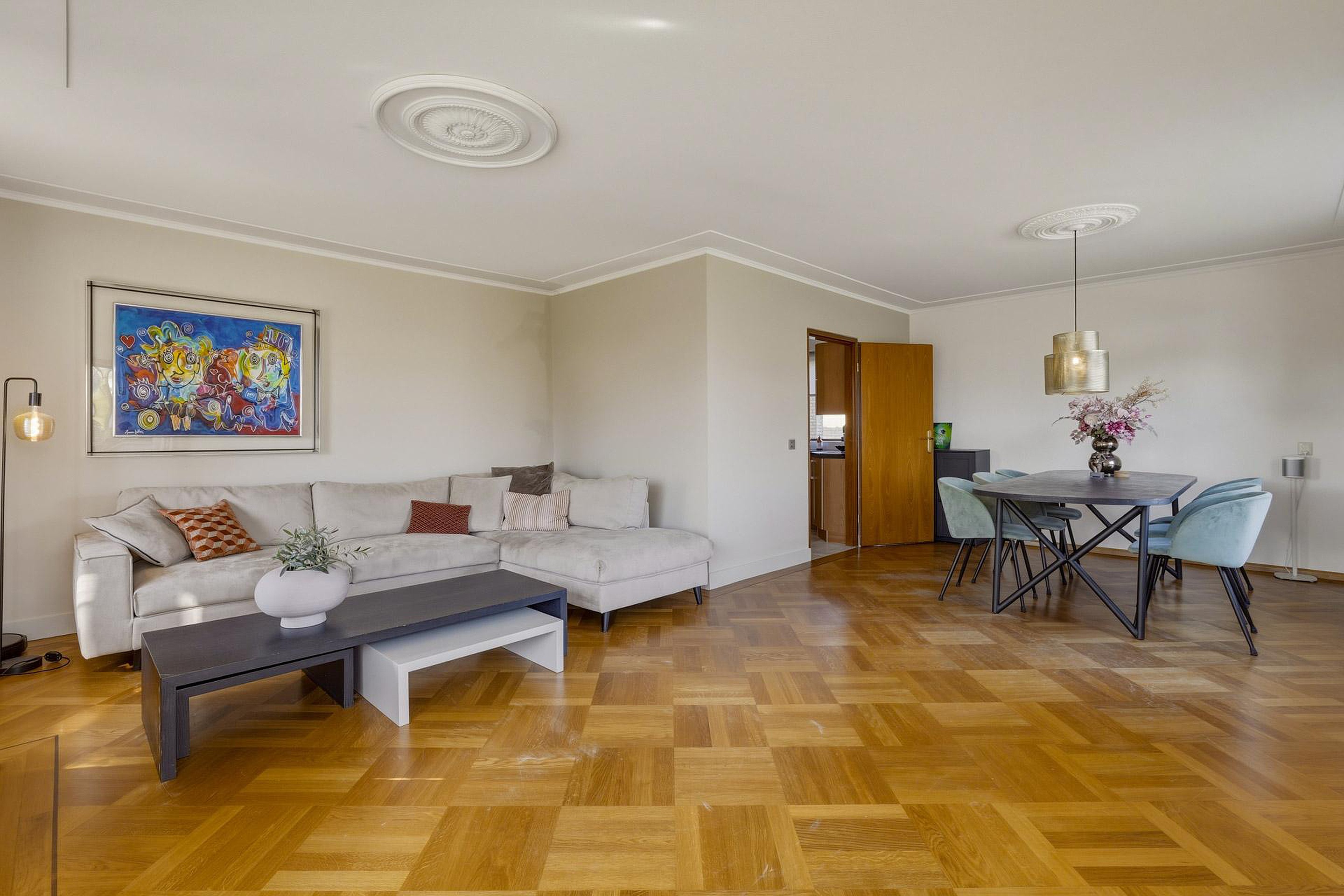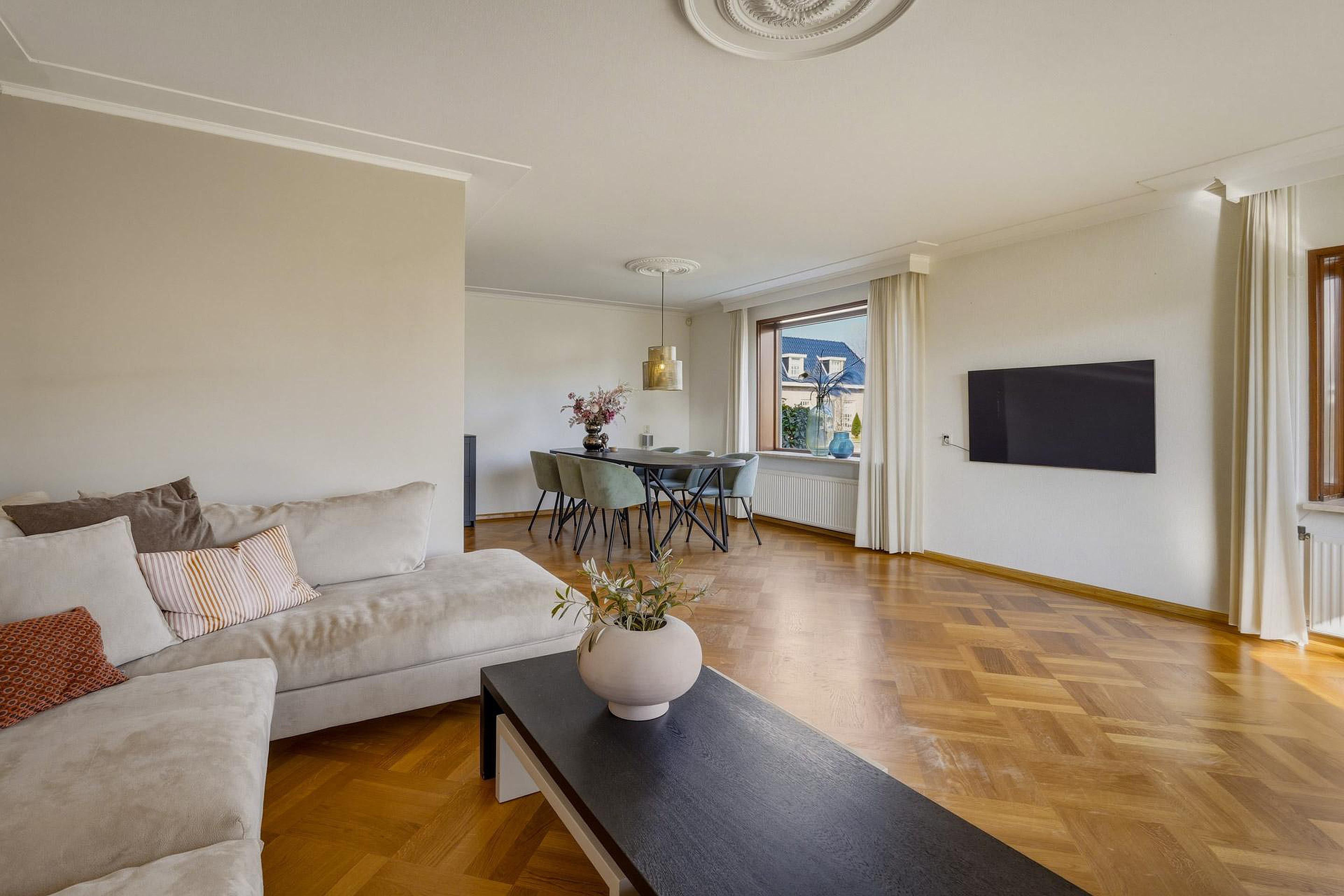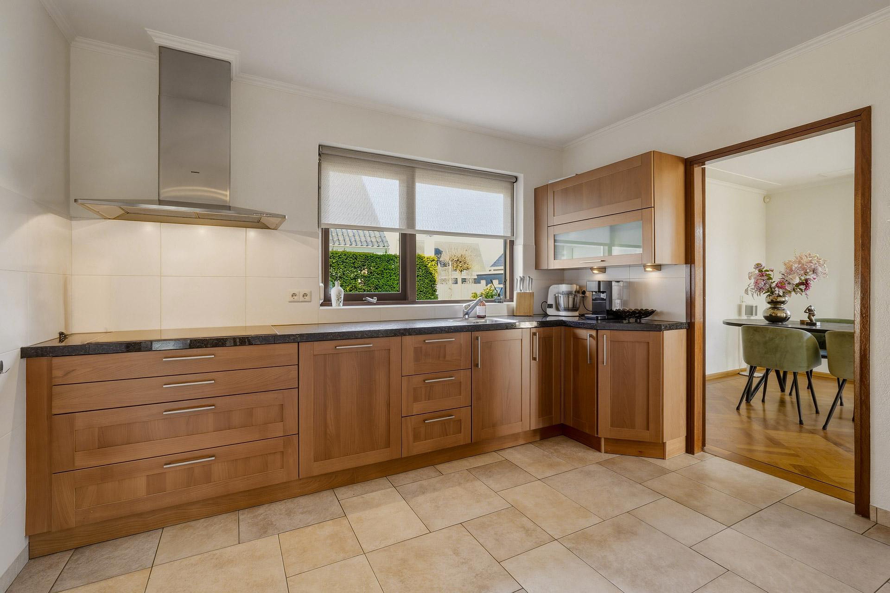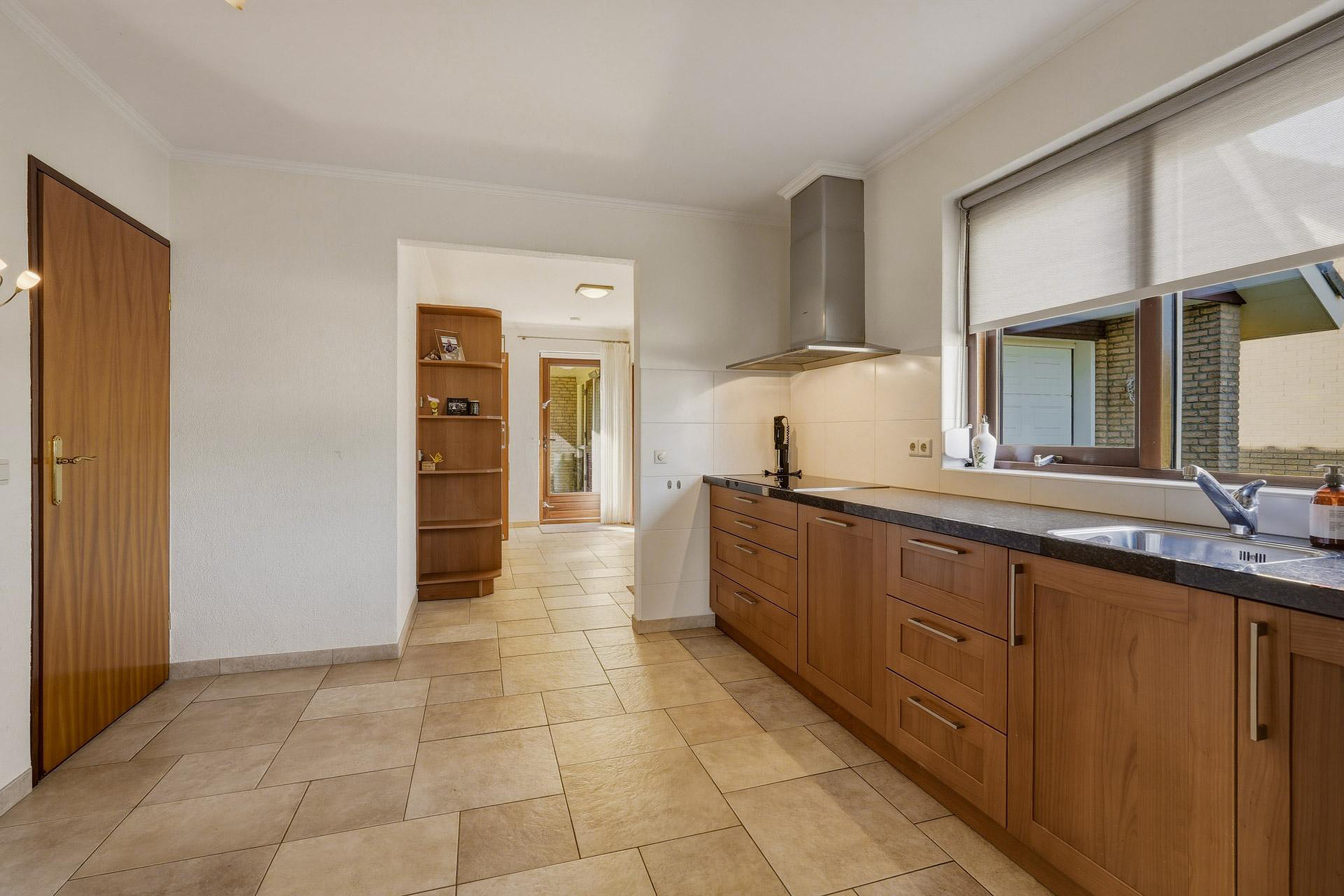 De woonkamer is ruim opgezet en beschikt over veel natuurlijk licht. De L-vormige indeling biedt voldoende ruimte voor zowel een zithoek als een eethoek. De keuken bevindt zich aan de achterzijde van de woning en is voorzien van diverse inbouwapparatuur. Vanuit de keuken is er toegang tot de bijkeuken, welke extra praktische bergruimte biedt en tevens een doorgang vormt naar de garage en de achtertuin.