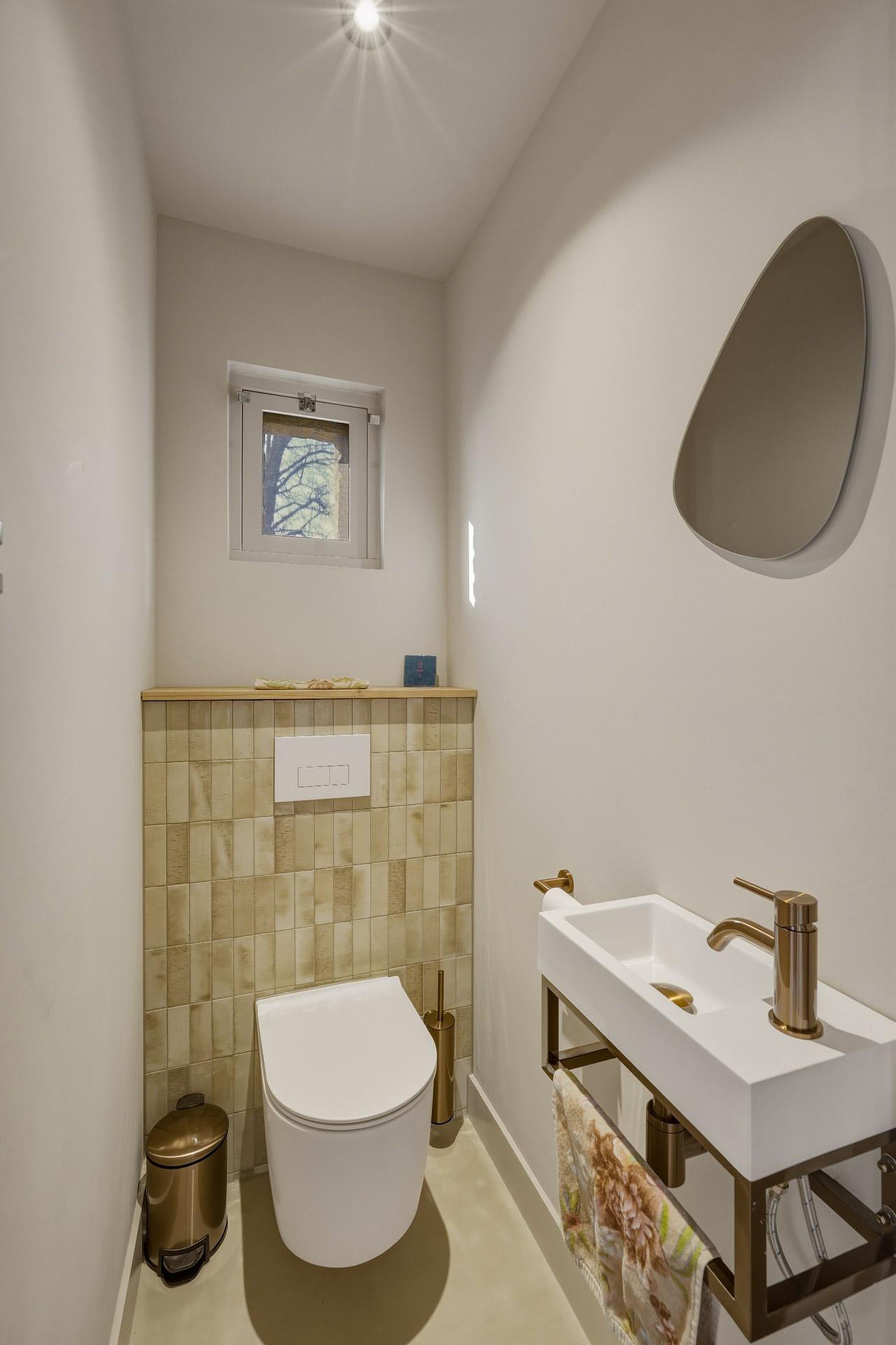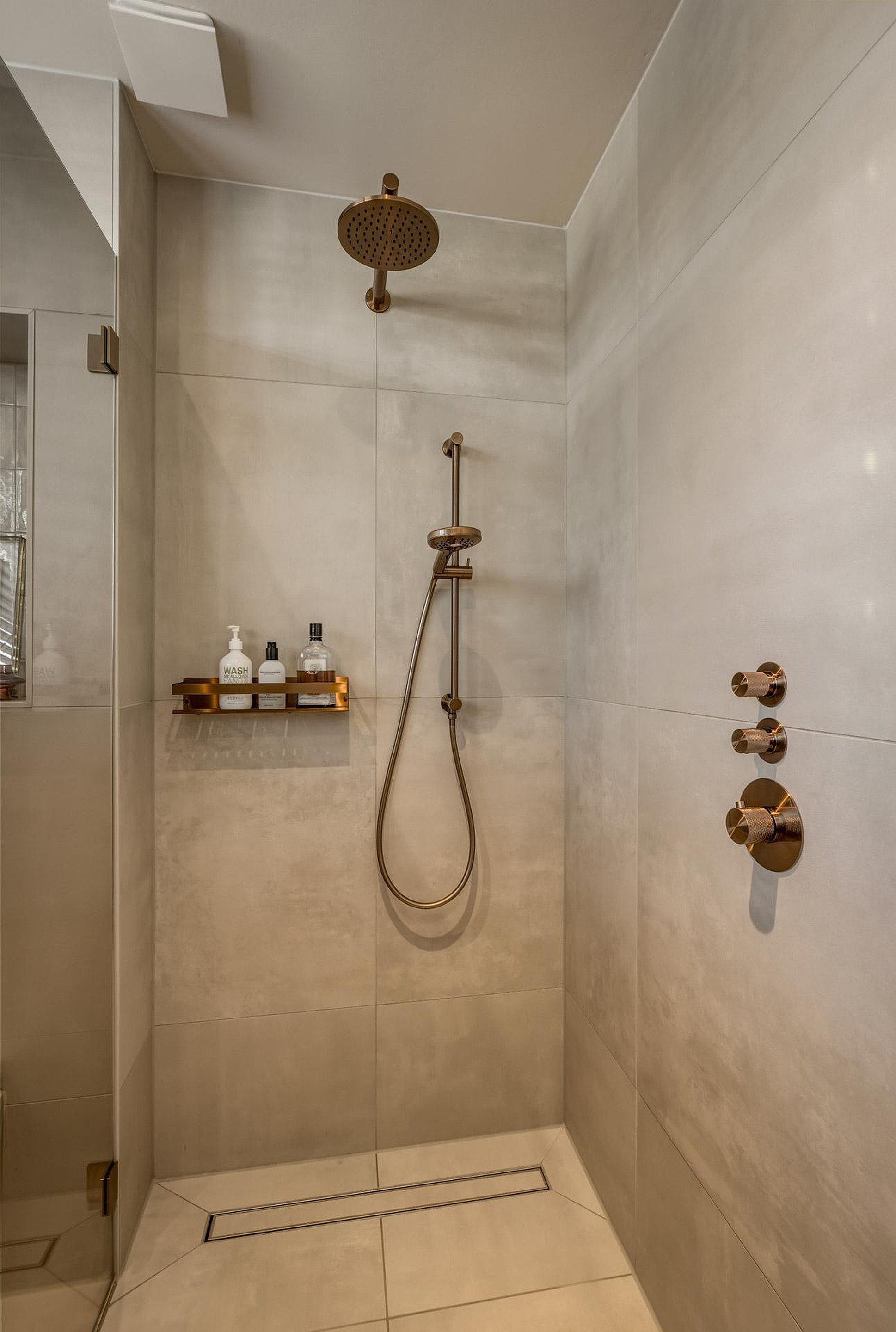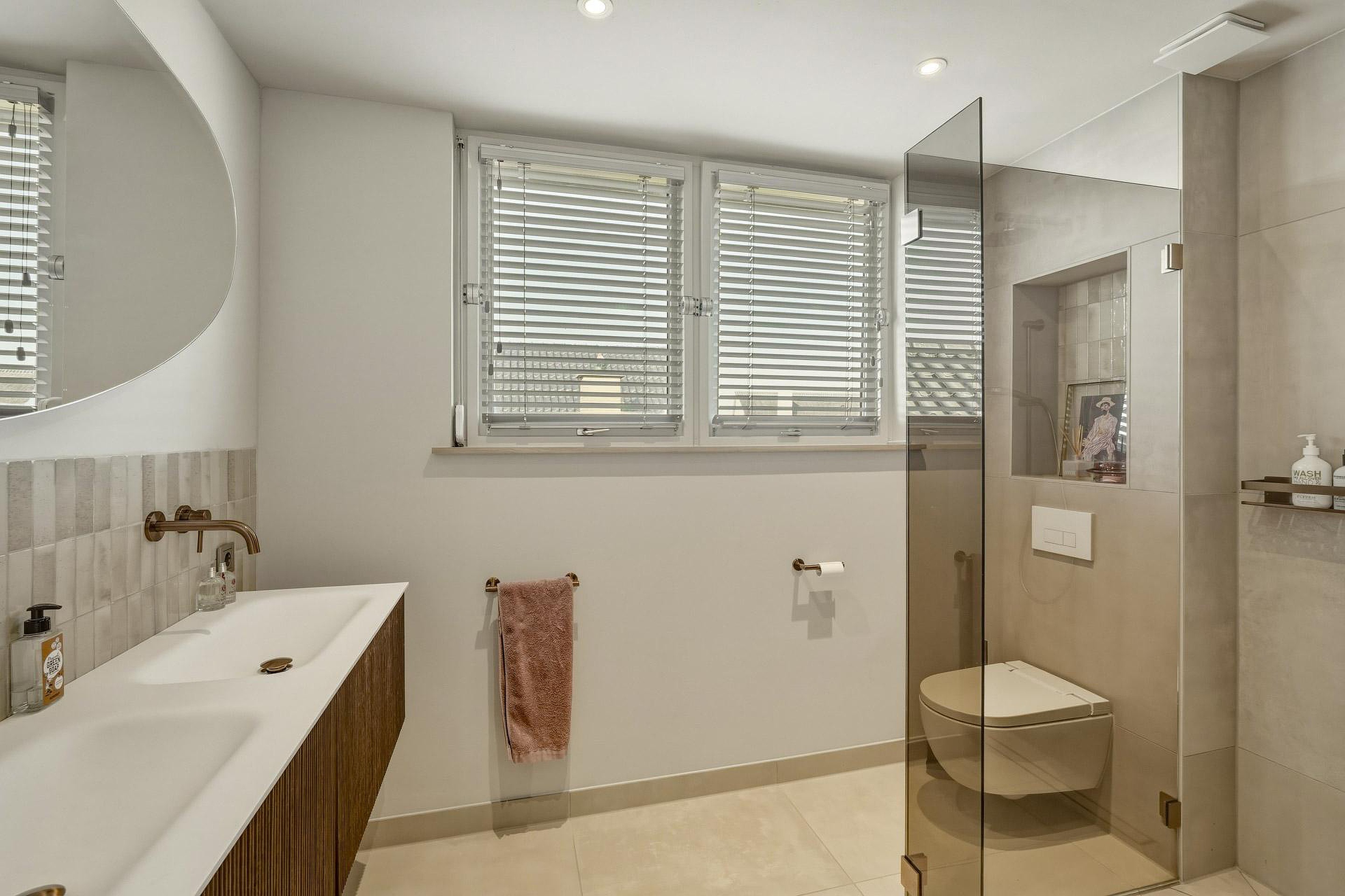 – Nette badkamer voorzien van inloopdouche, wandcloset en wastafelmeubel;
